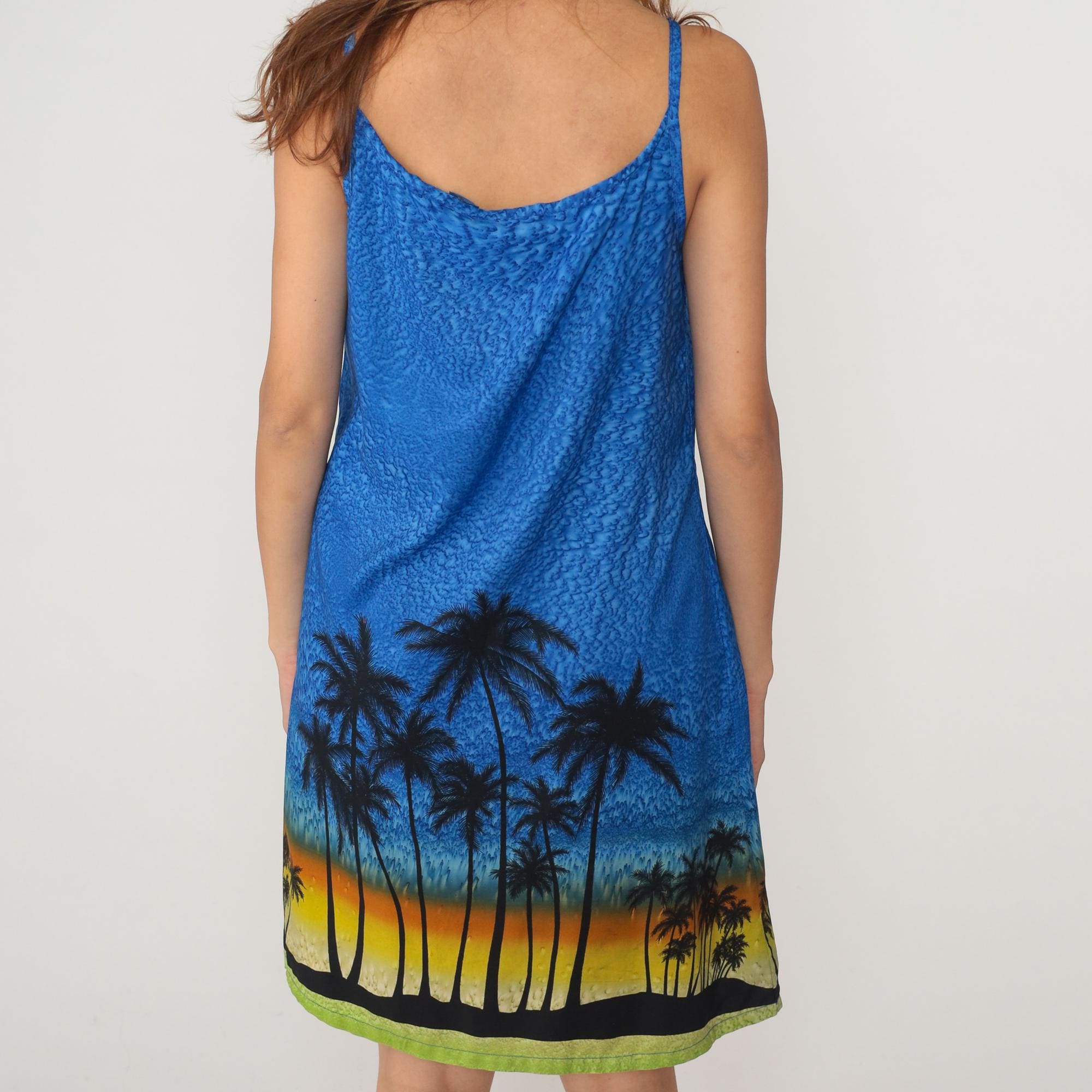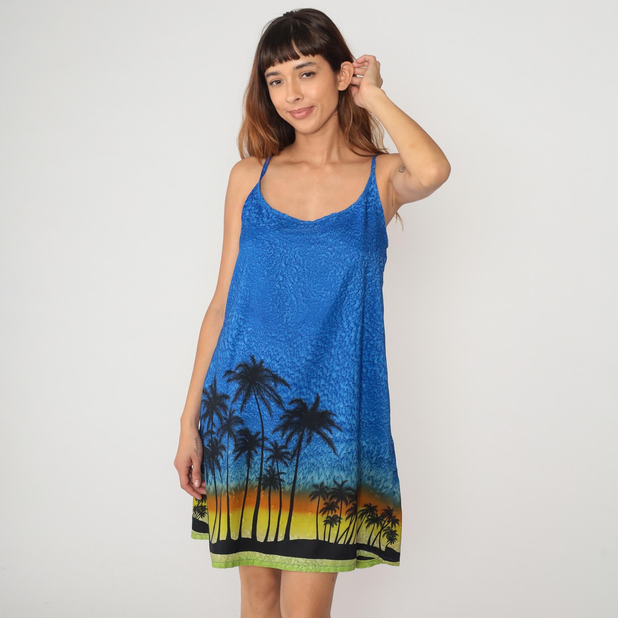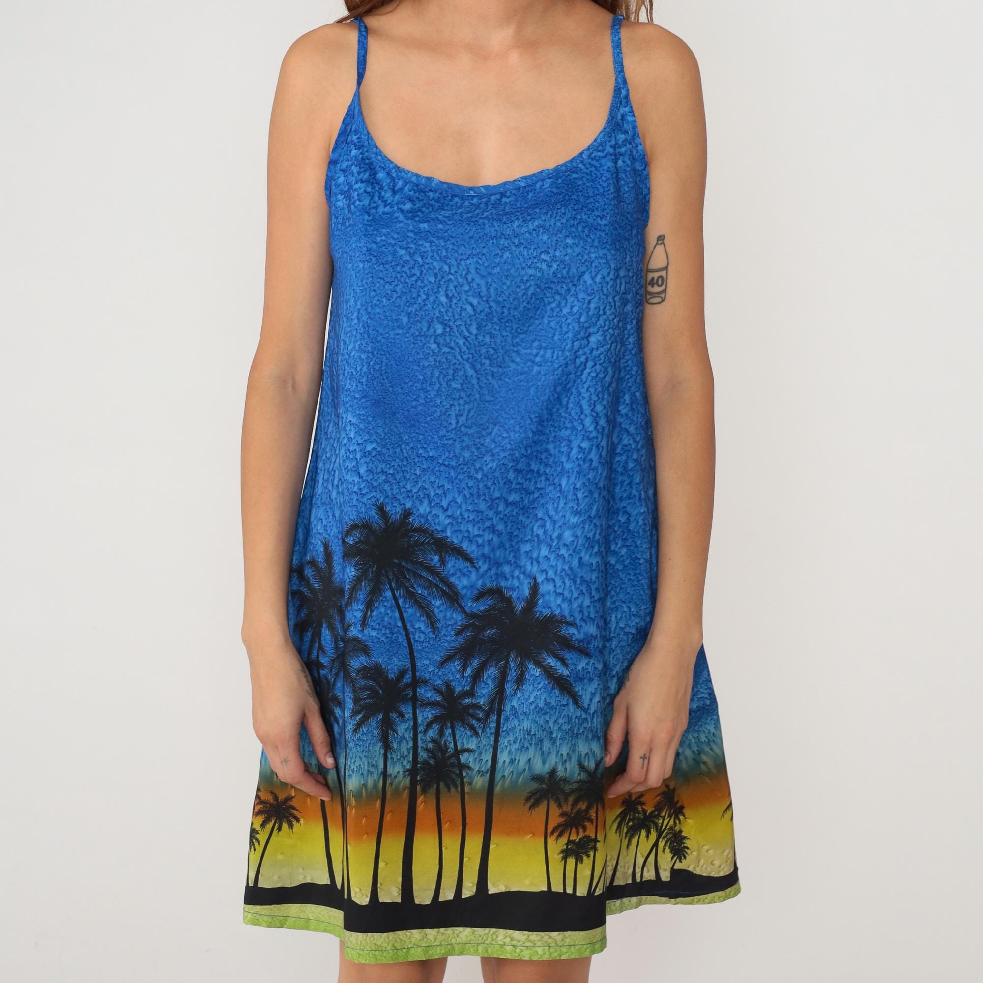 Y2K blue ombre slip dress from Roundy Bay with tropical sunset scene print. Spaghetti straps, fitted bodice, and straight-cut skirt with black palm tree silhouettes across blue to yellow gradient background.