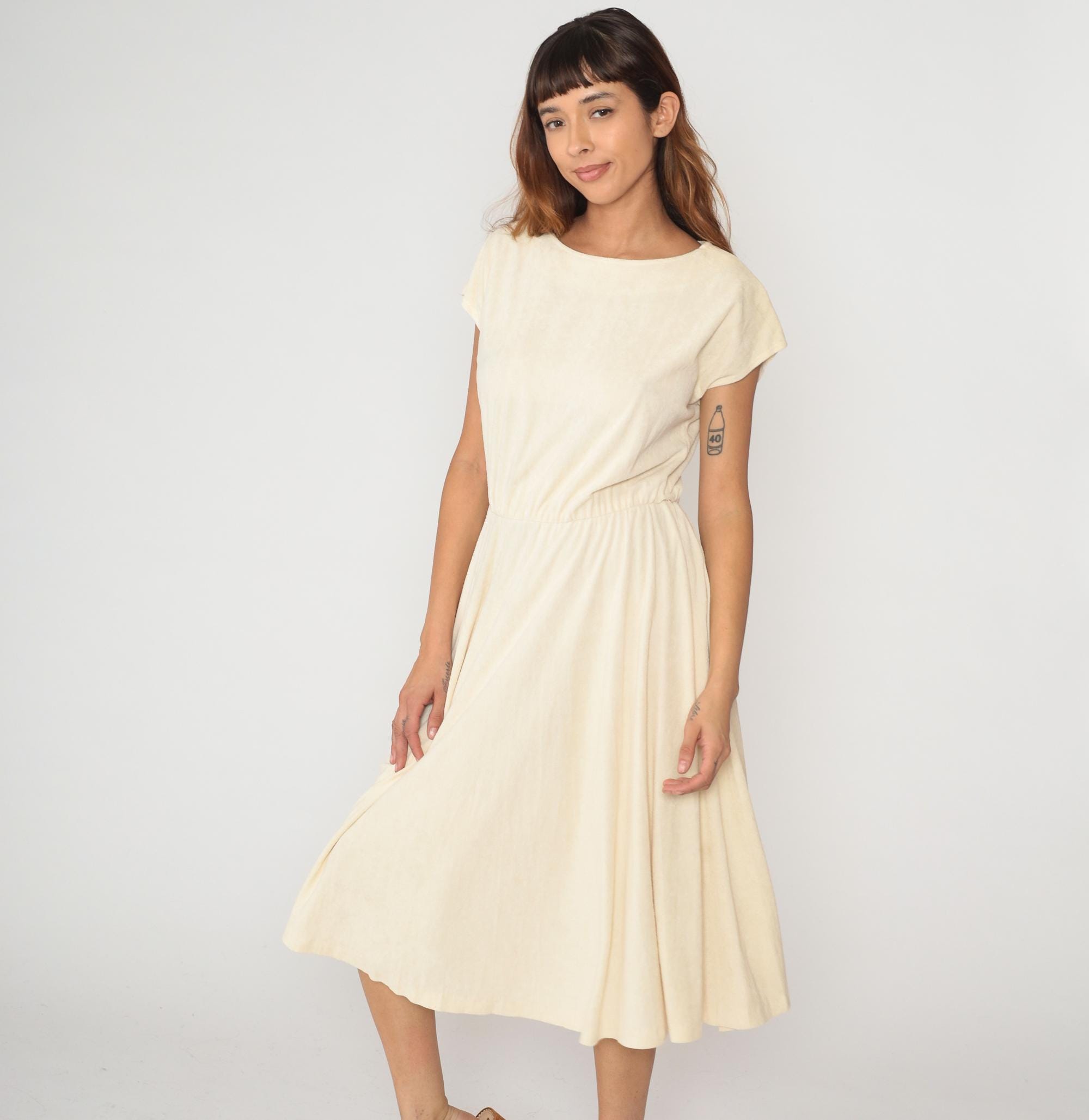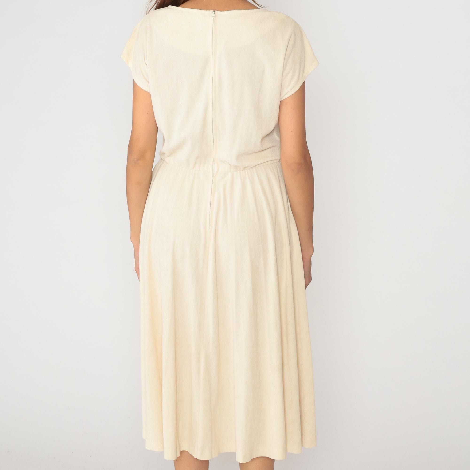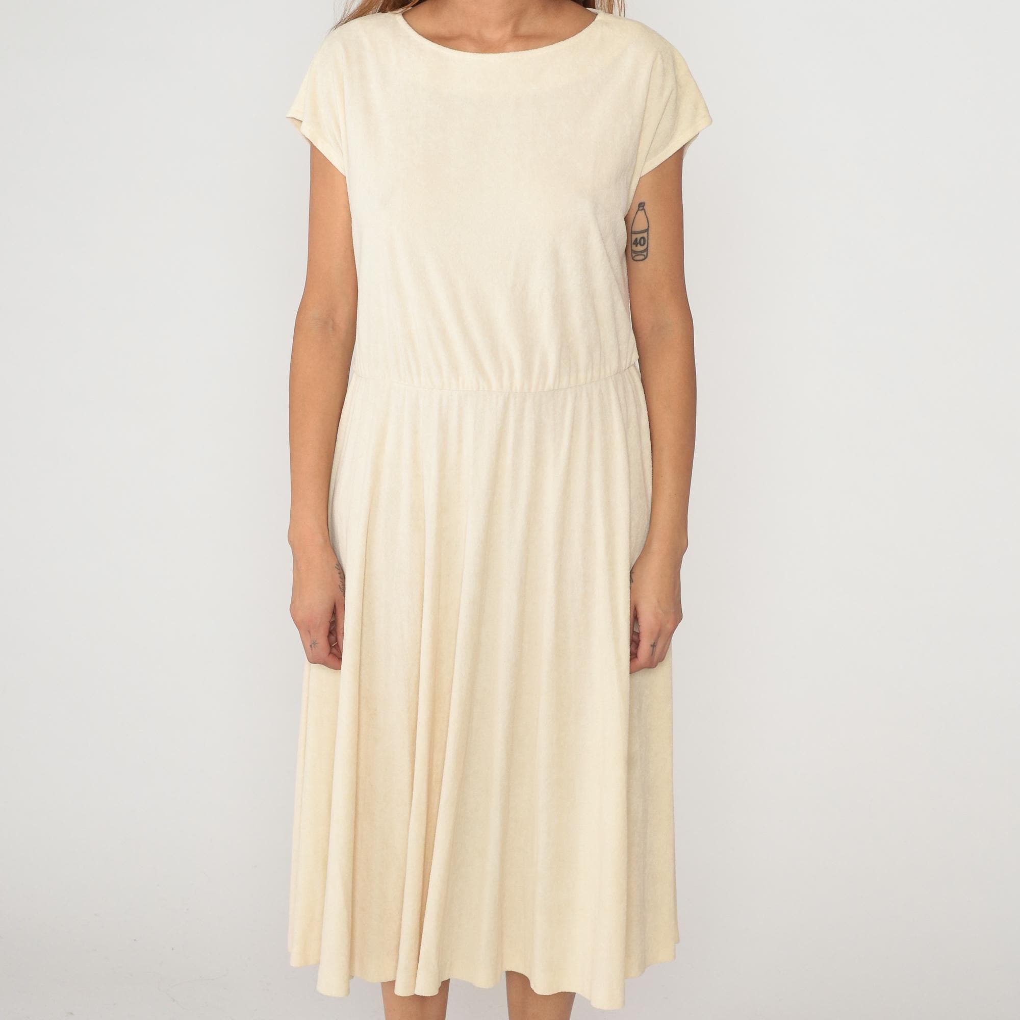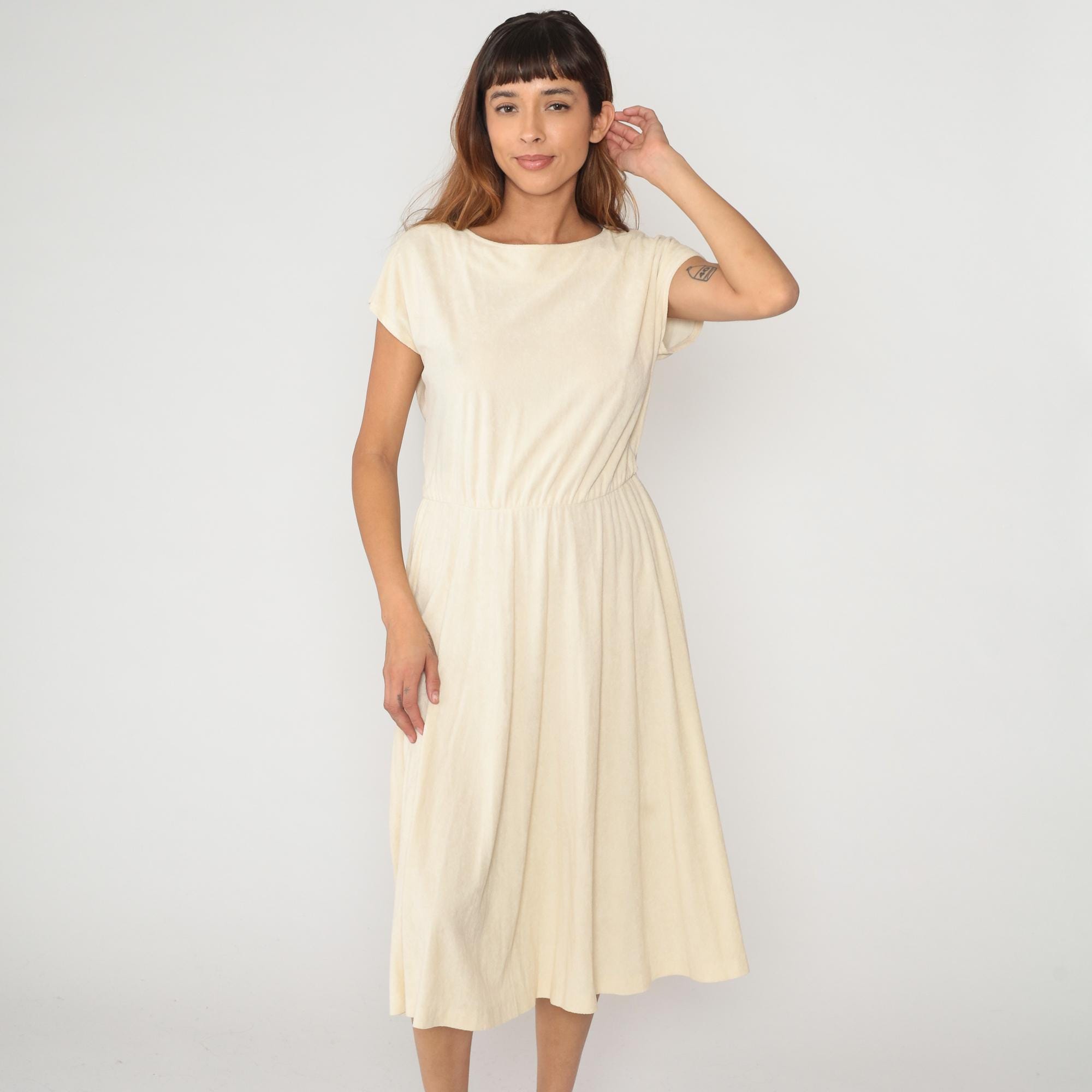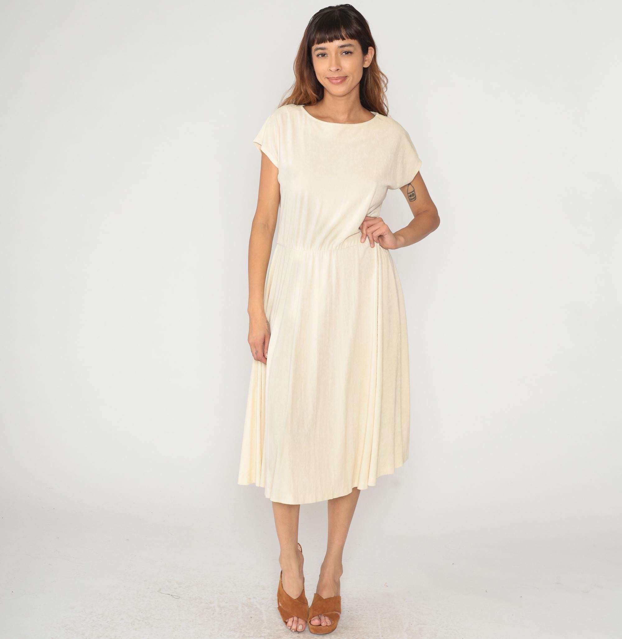 80s cream midi dress from Jo Lester with round neckline and short sleeves. Gathered elastic waist and full A-line skirt. Back zipper closure.