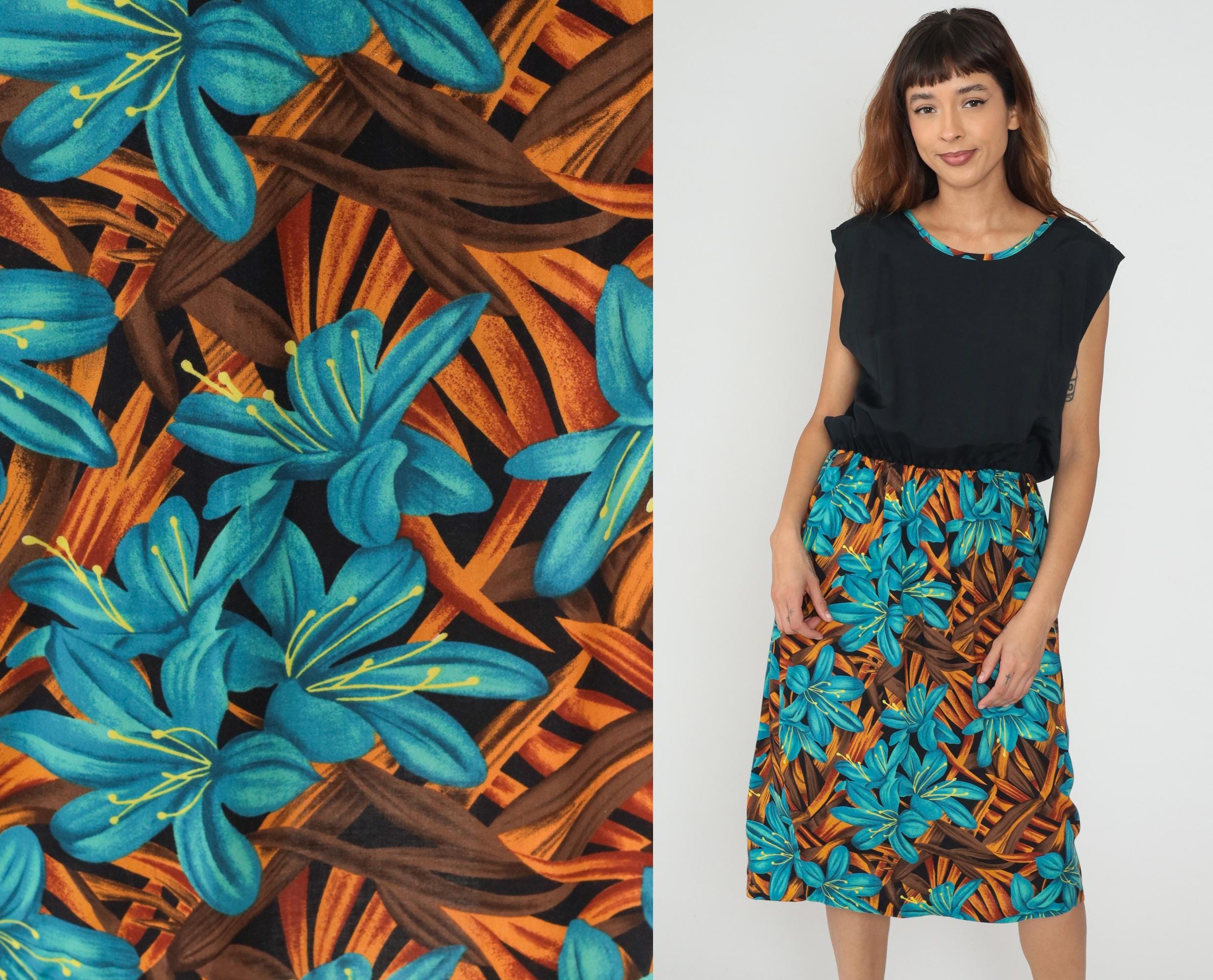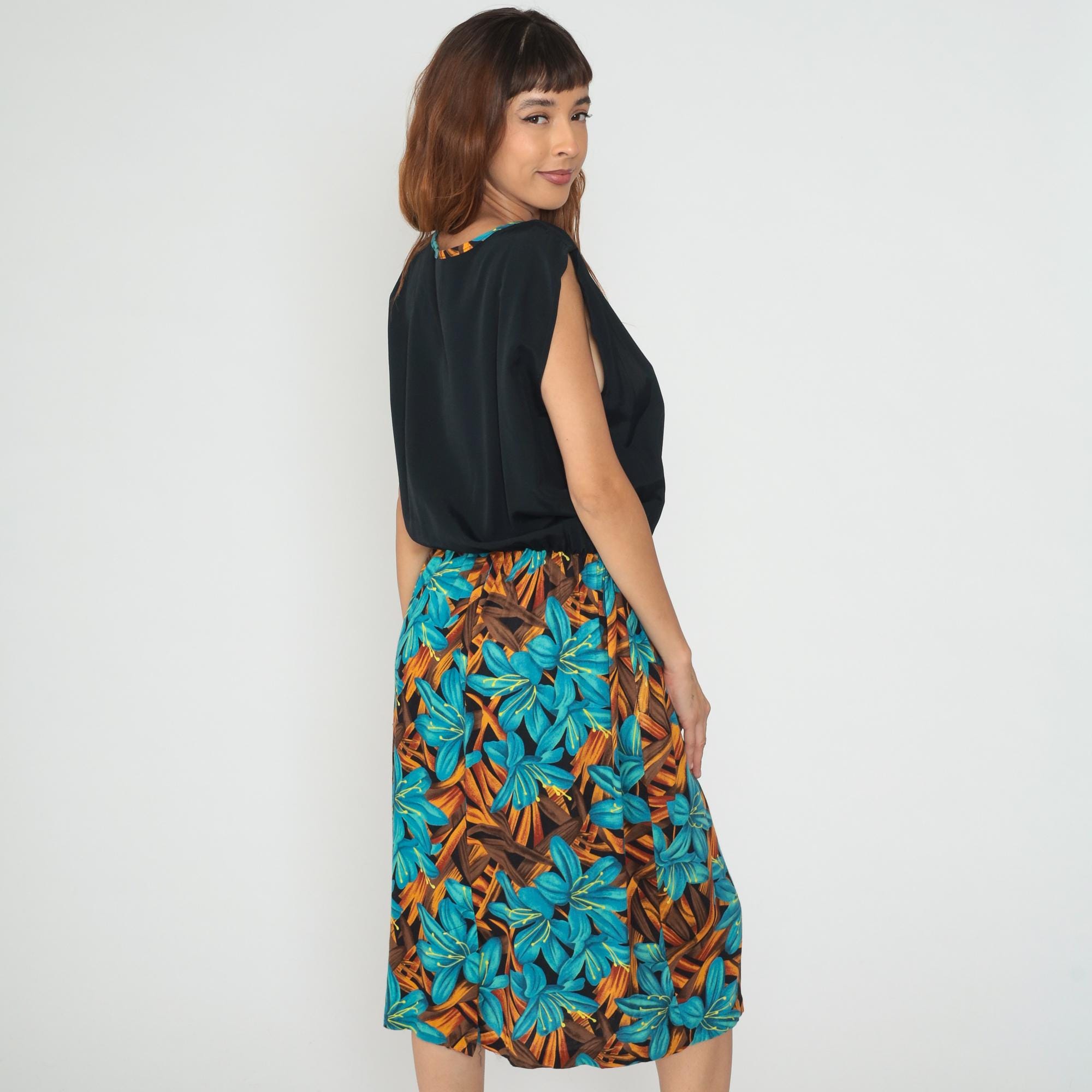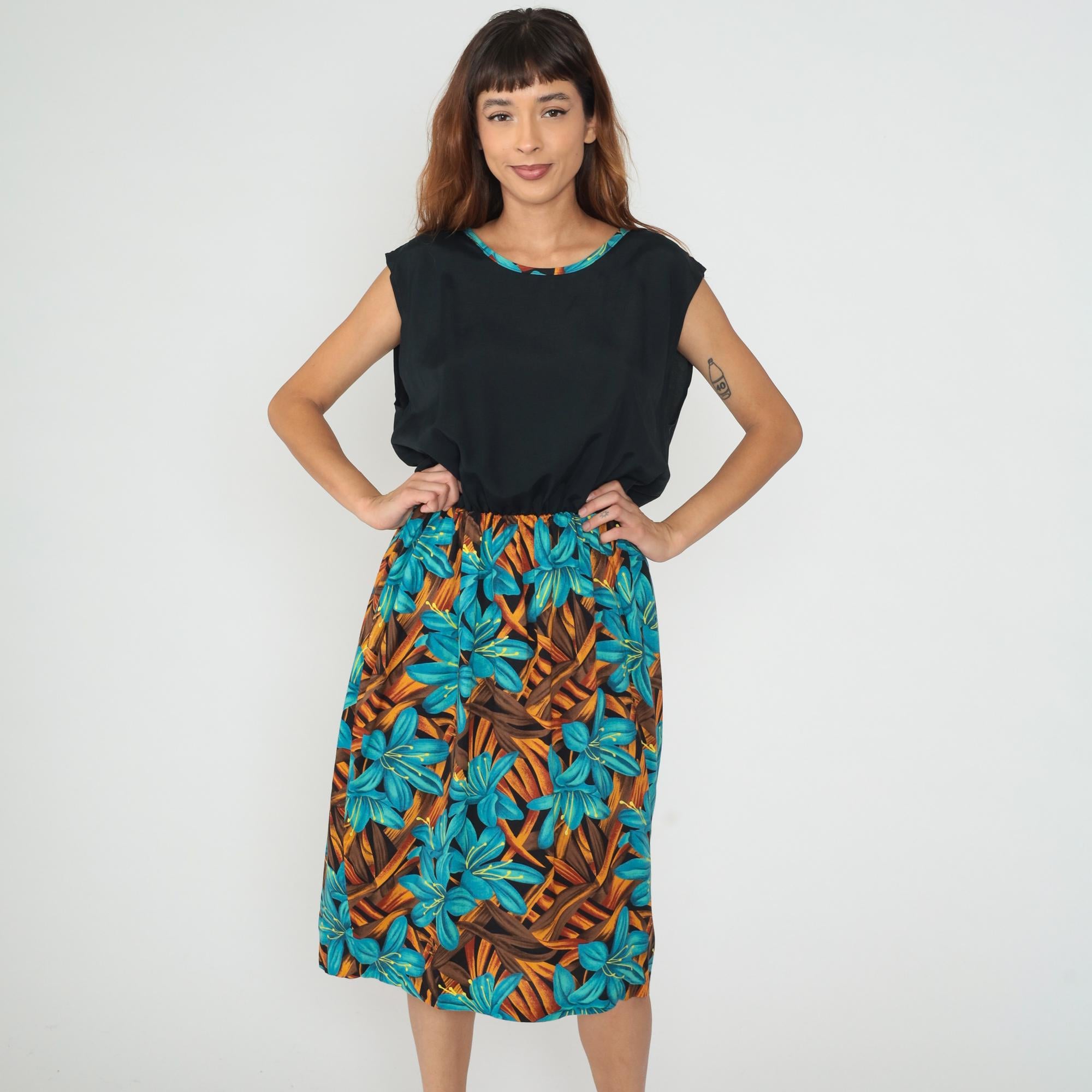90s sleeveless dress with black upper bodice and tropical floral print skirt, matching printed trim at the neckline. Turquoise flowers with orange and brown geometric accents across the lower portion.