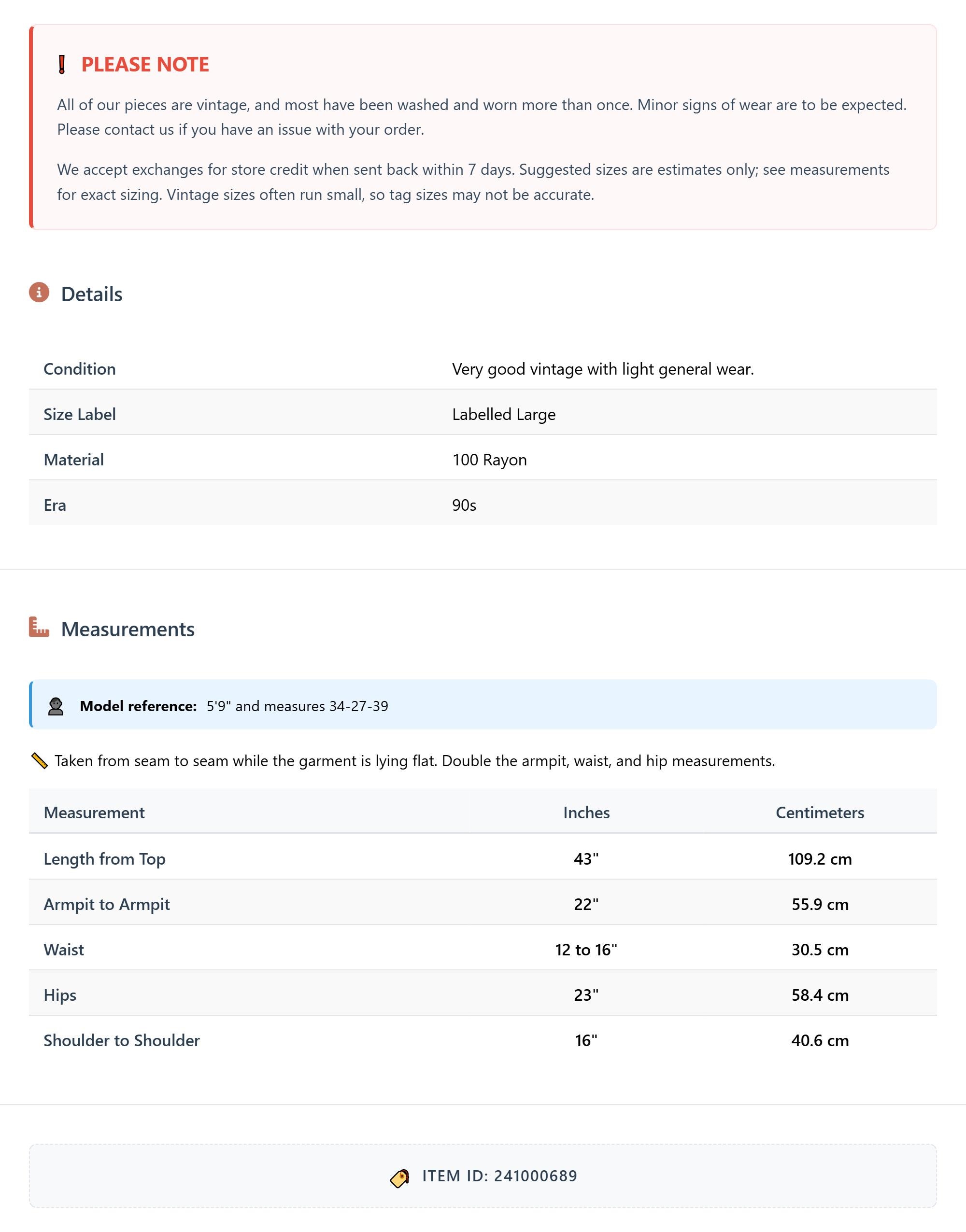 All of our pieces are vintage, and most have been washed and worn more than once. Minor signs of wear are to be expected. Please contact us if you have an issue with your order. We accept exchanges for store credit when sent back within 7 days.