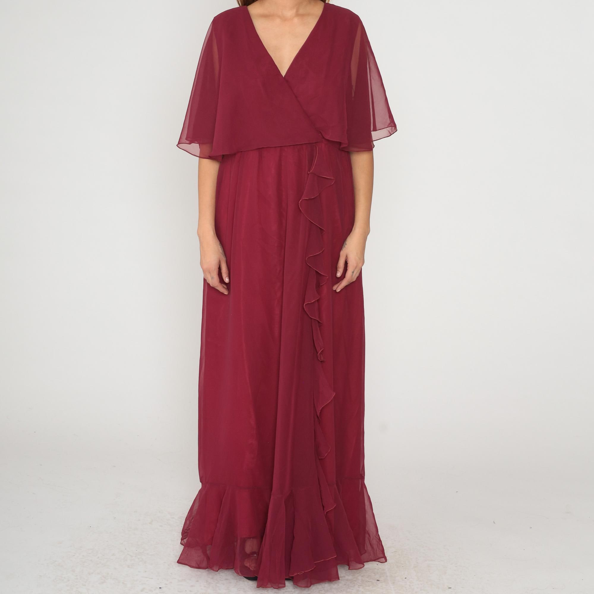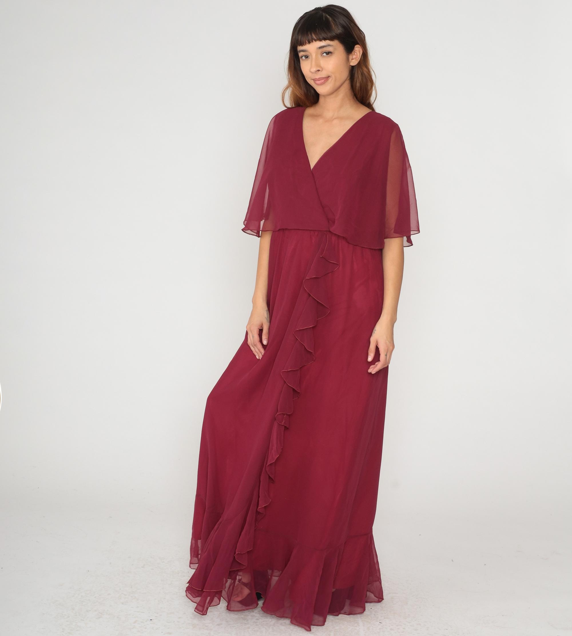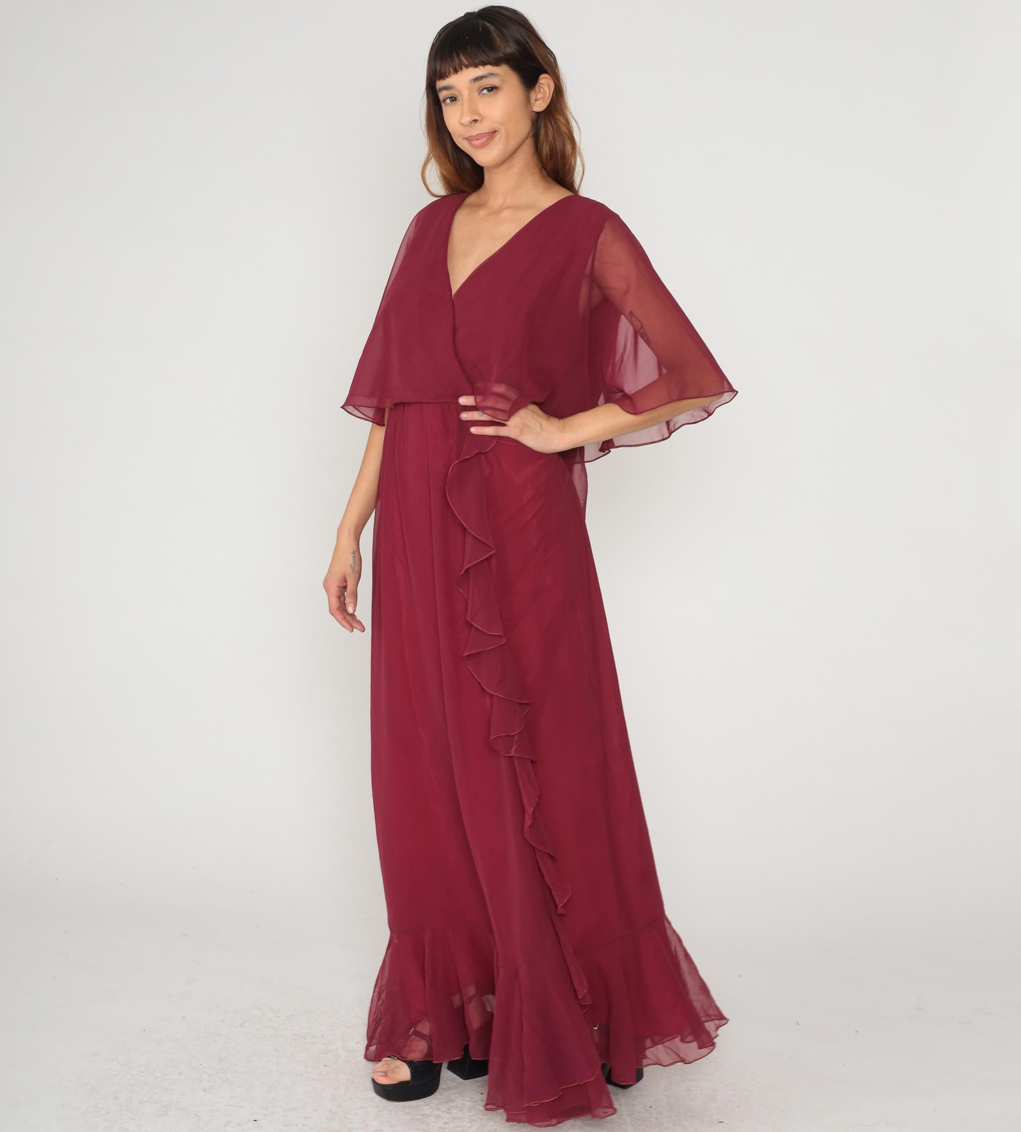 70s burgundy maxi dress with cape overlay and V-neck bodice. Short flutter sleeves form a cape-like overlay across the shoulders, cascading ruffle trim down the front, gathered waist, and ruffled hemline. Back zipper closure.