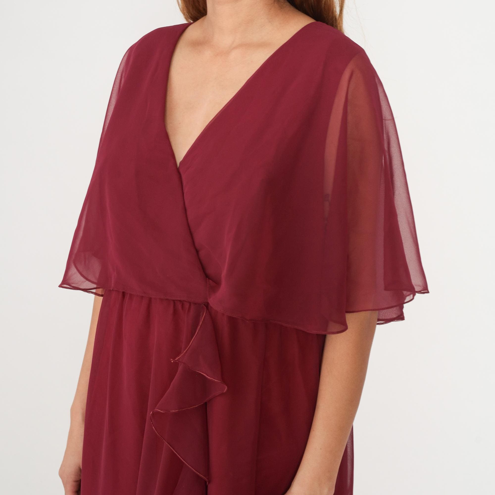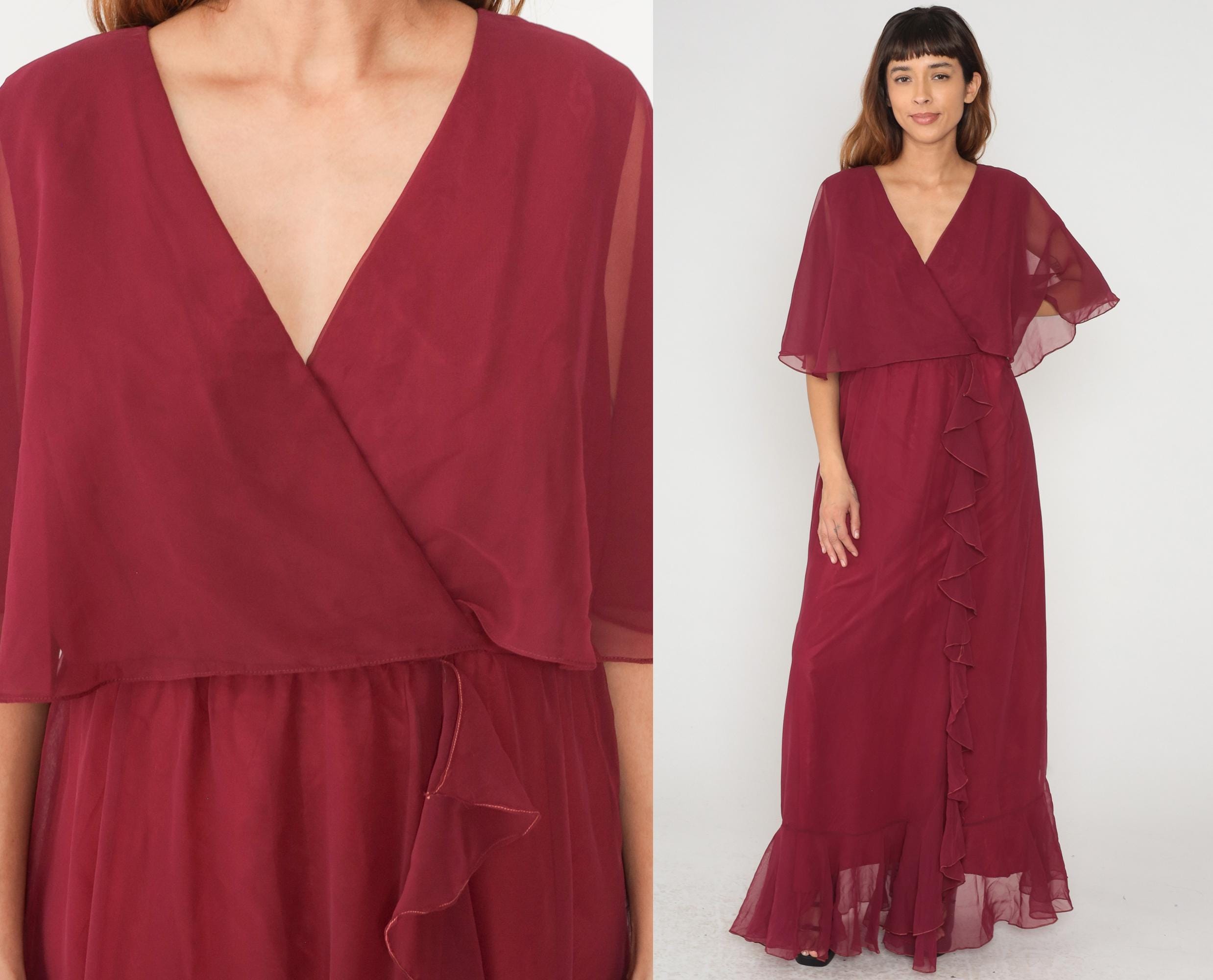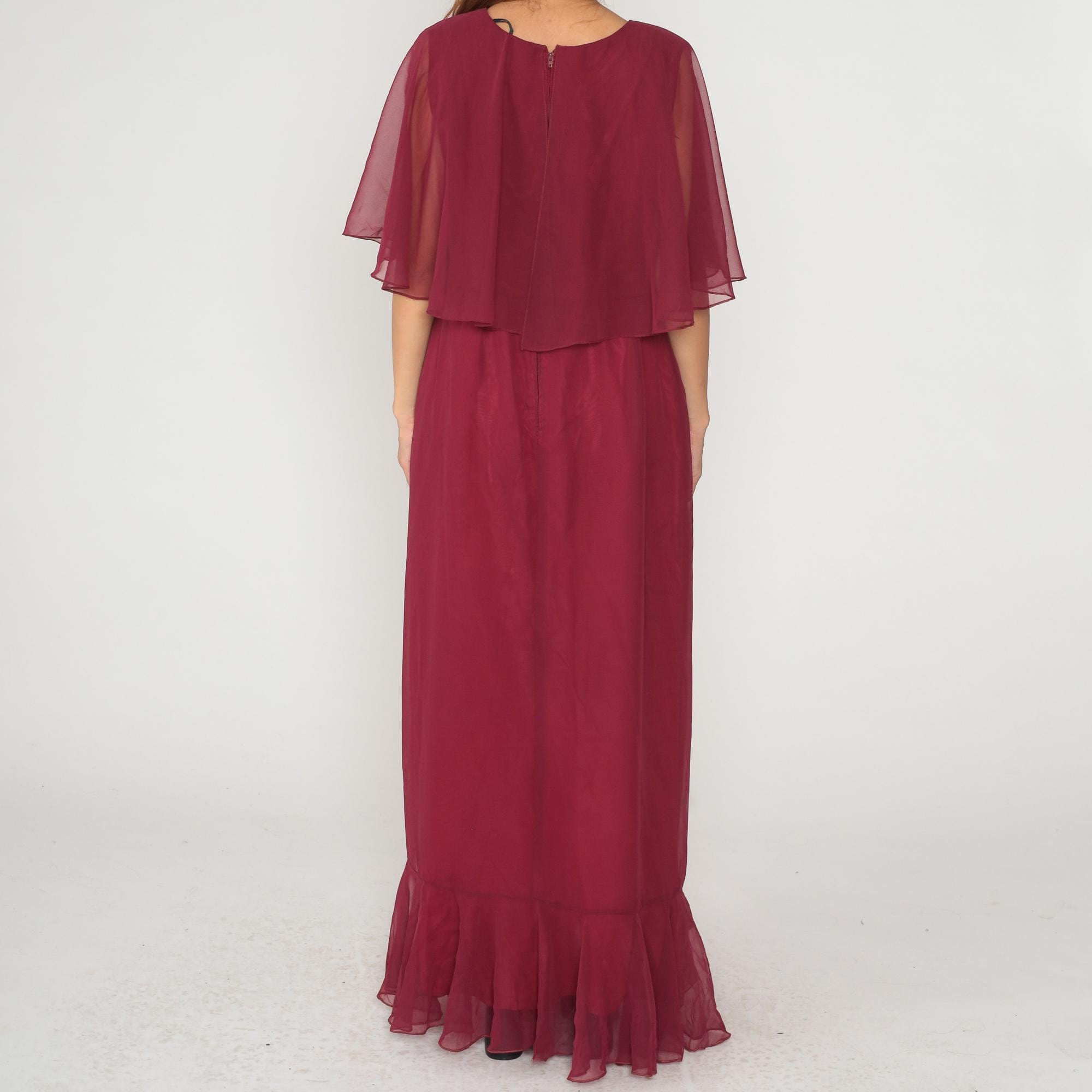 70s burgundy maxi dress with cape overlay and V-neck bodice. Short flutter sleeves form a cape-like overlay across the shoulders, cascading ruffle trim down the front, gathered waist, and ruffled hemline. Back zipper closure.