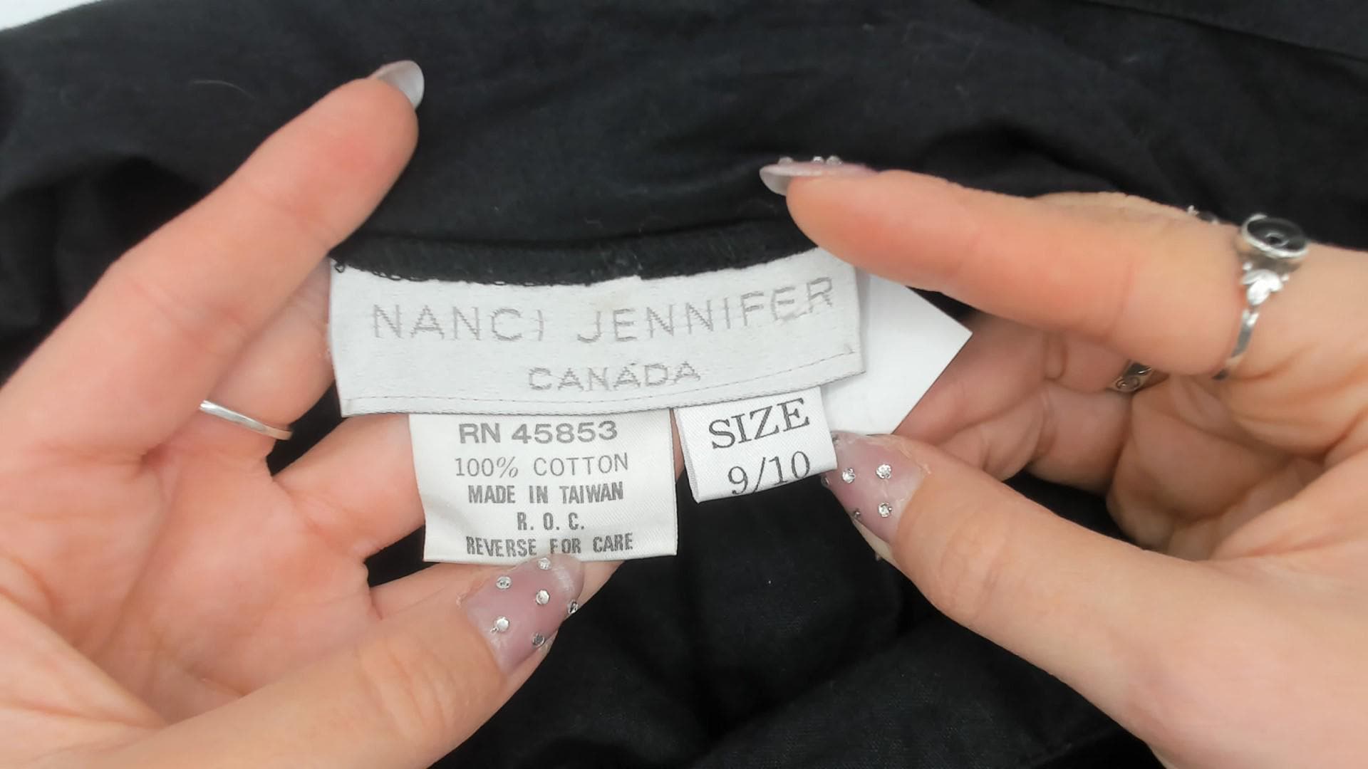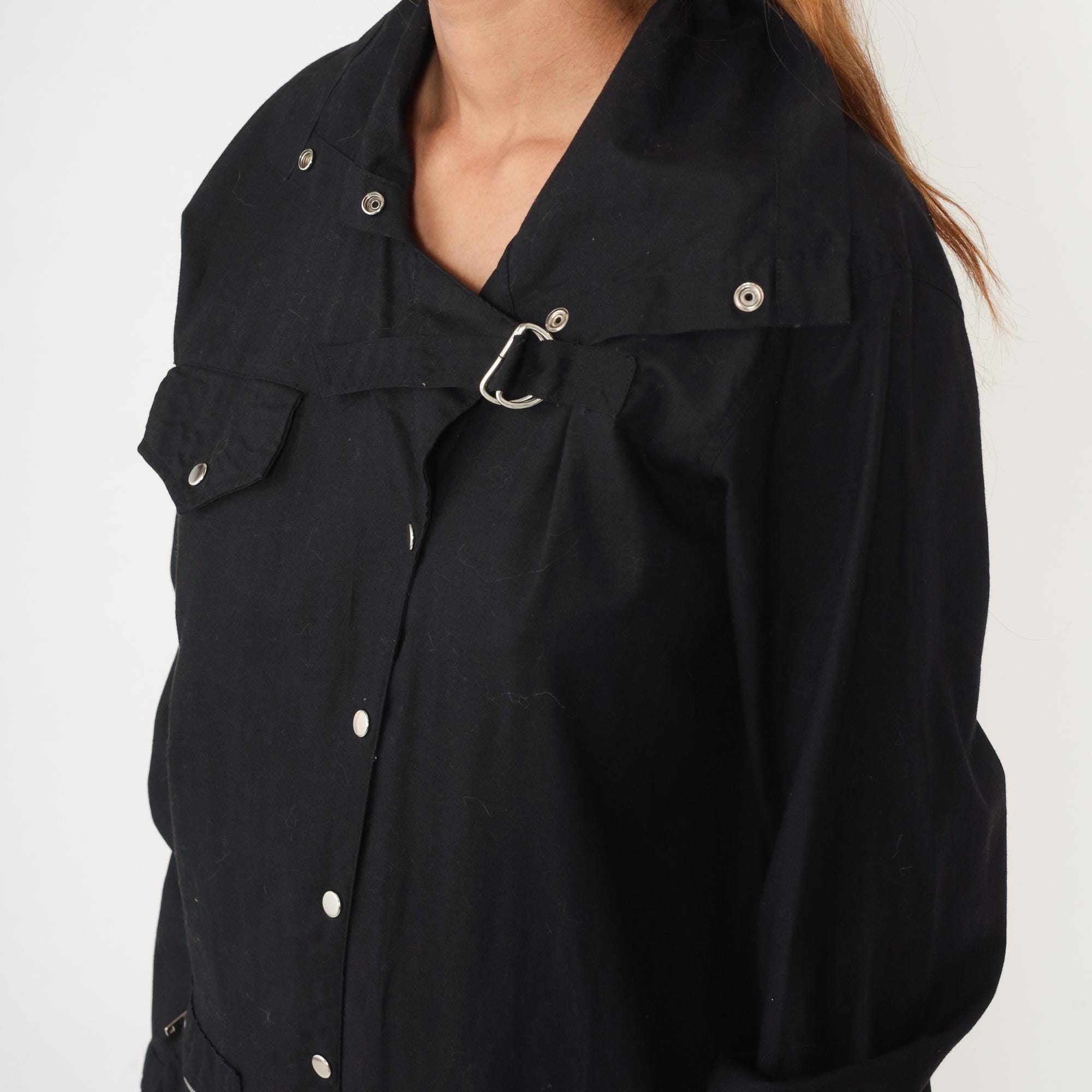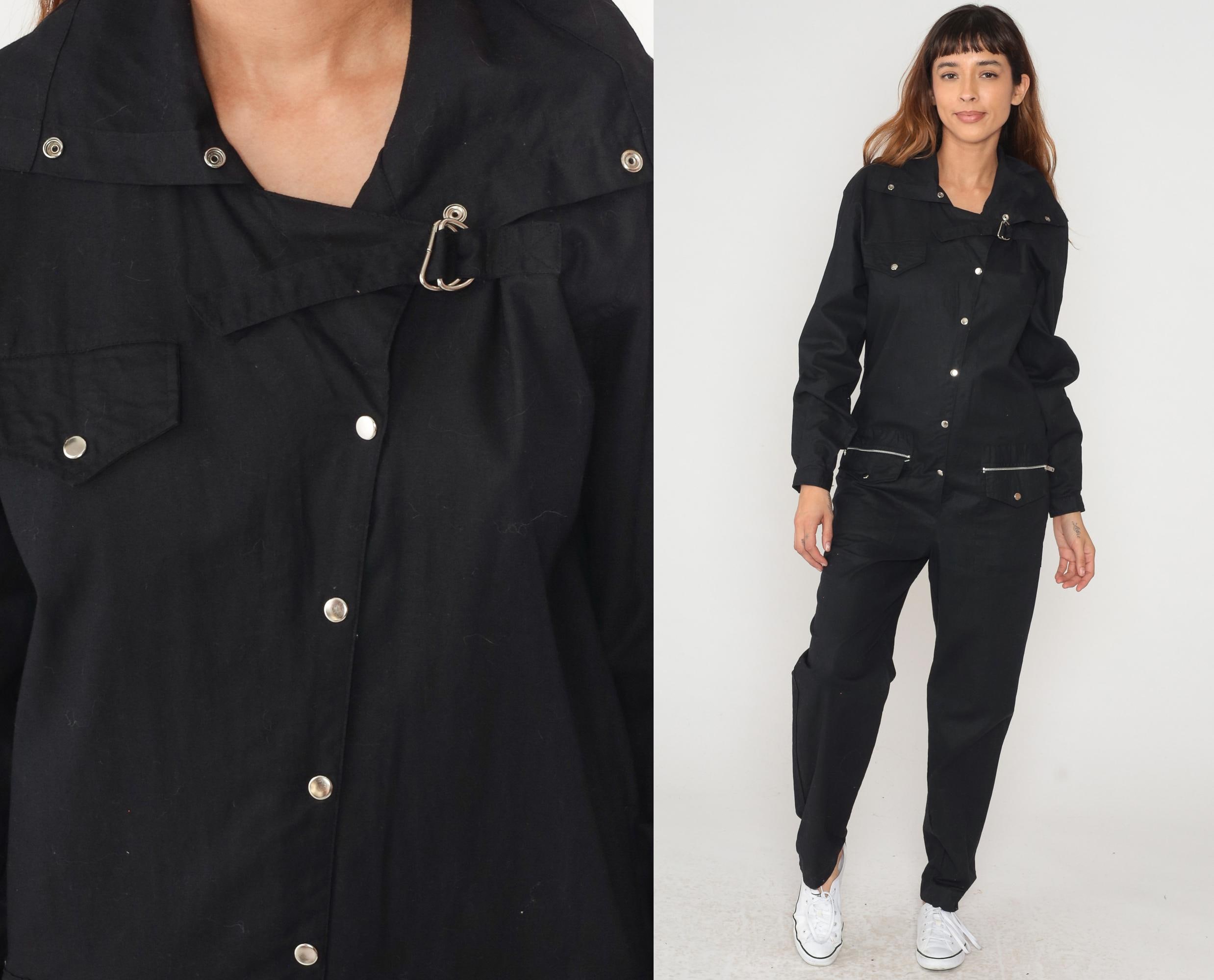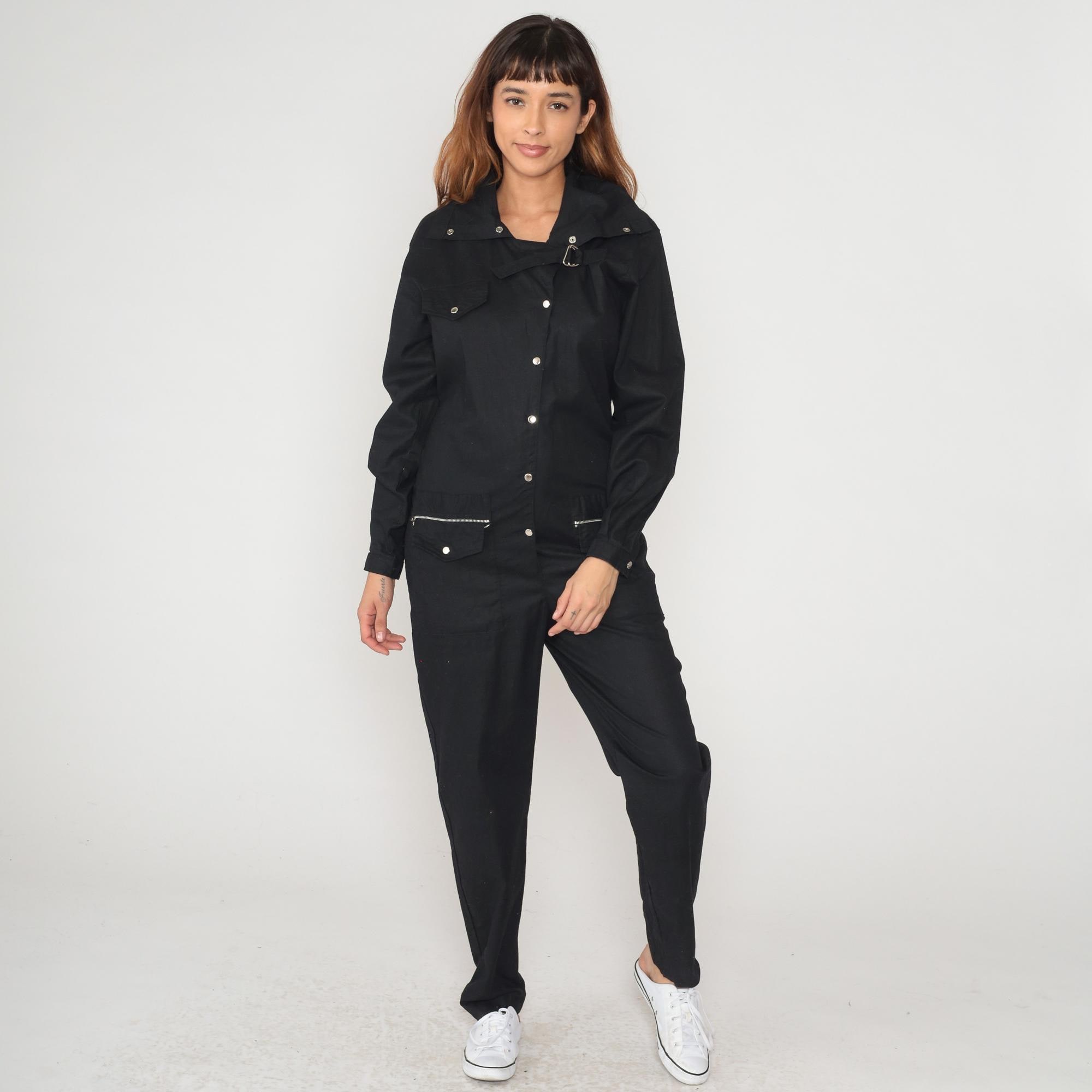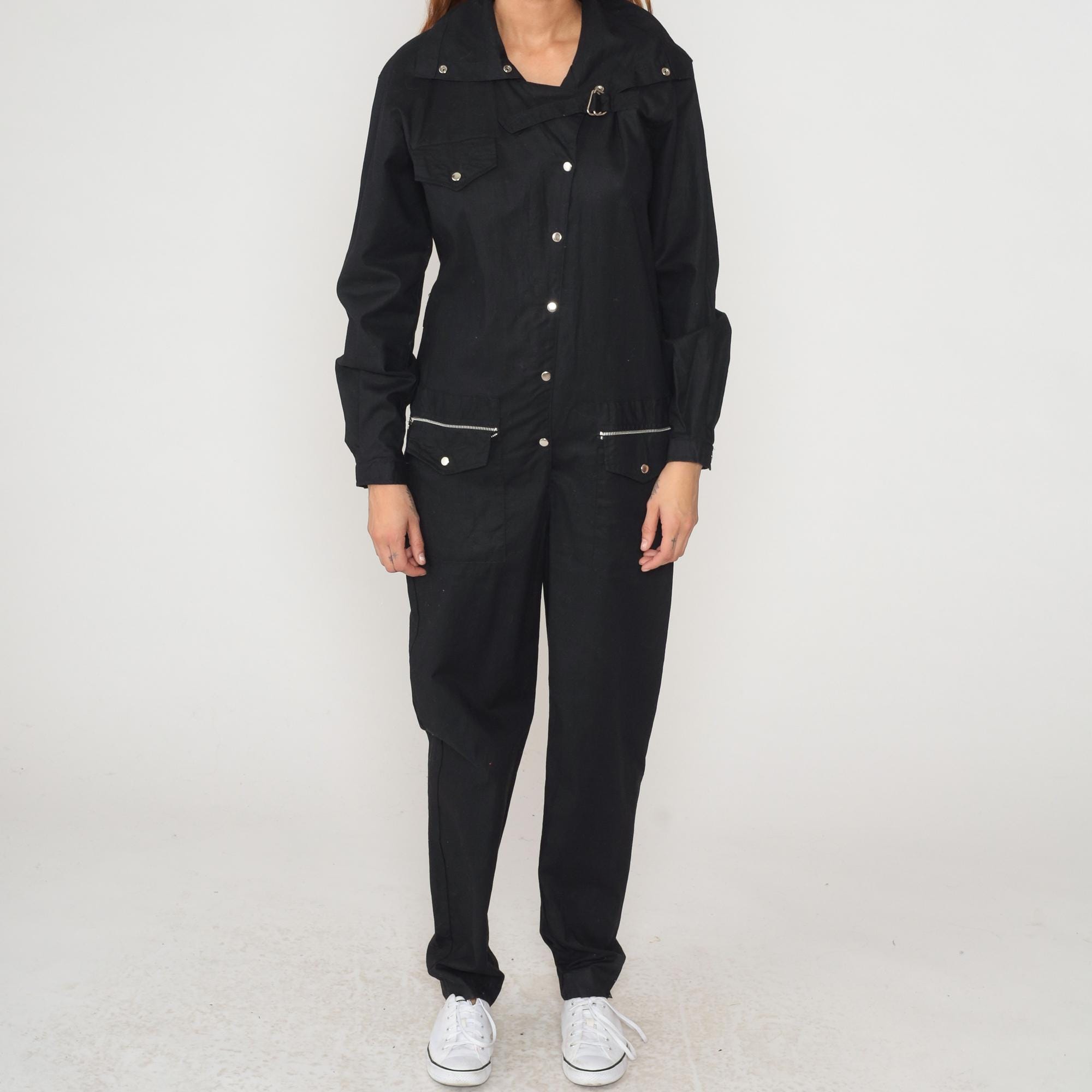 90s black cotton jumpsuit from Nanci Jennifer with utility workwear styling. Button front closure with snap buttons, snap collar, chest pockets with button flaps and decorative safety pin detail. Hip pockets with exposed zipper accents, long sleeves with button cuffs, elastic waist and ankles.