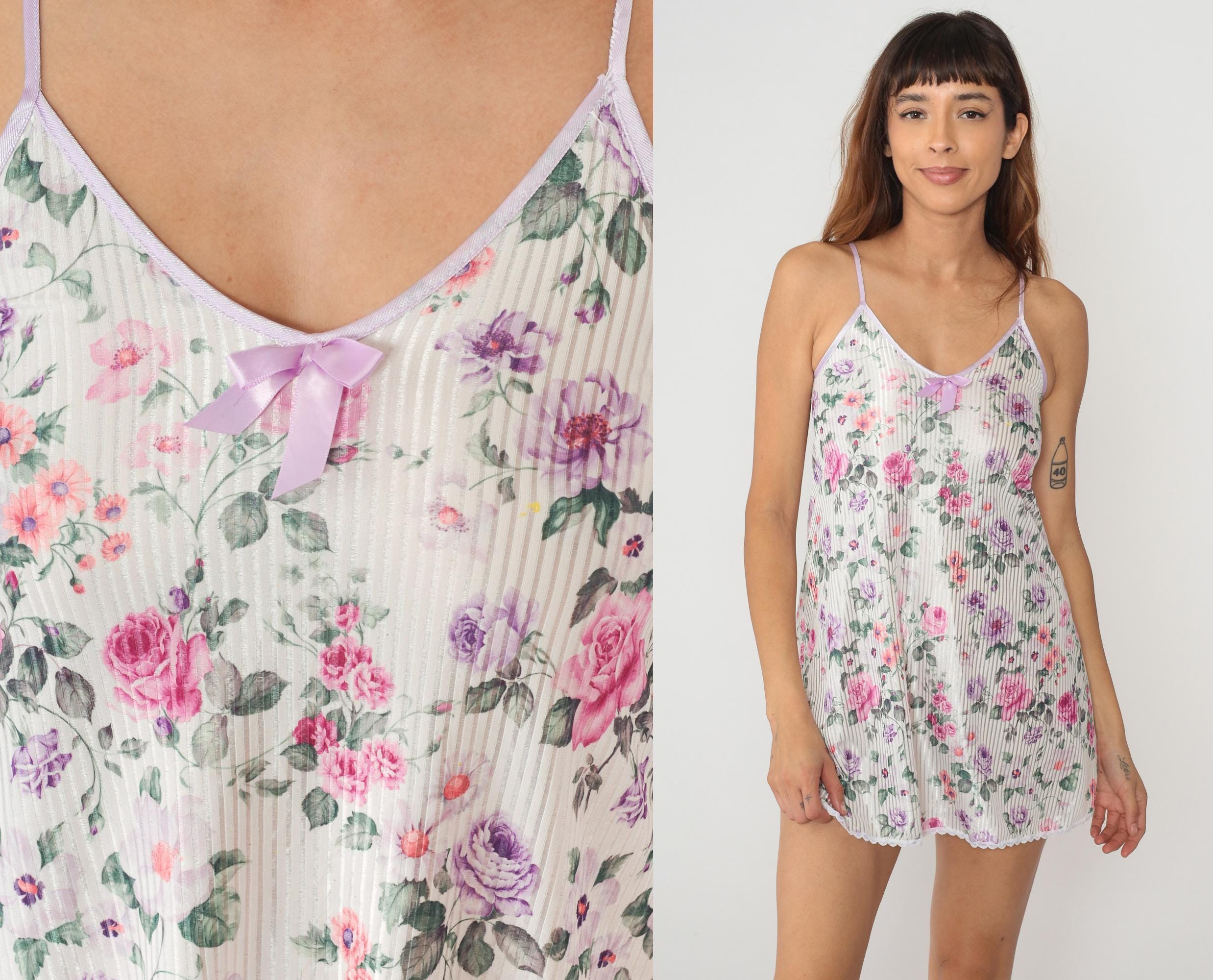 90s white floral mini dress with pleated texture throughout the fabric. Pink and purple roses with green leaves printed across cream base, lavender spaghetti straps and purple bow detail at V-neckline.