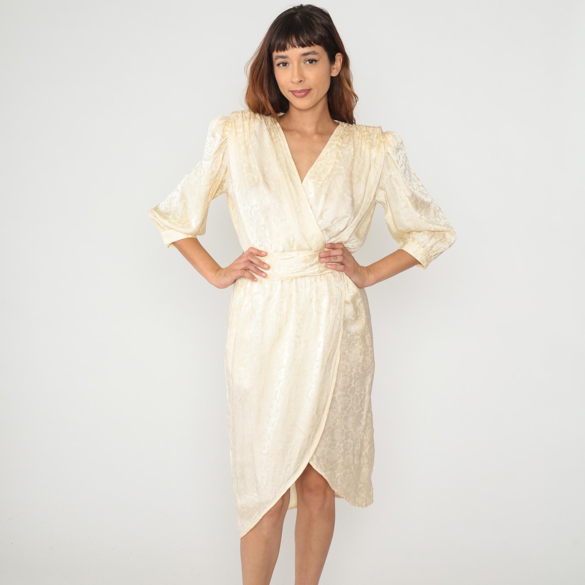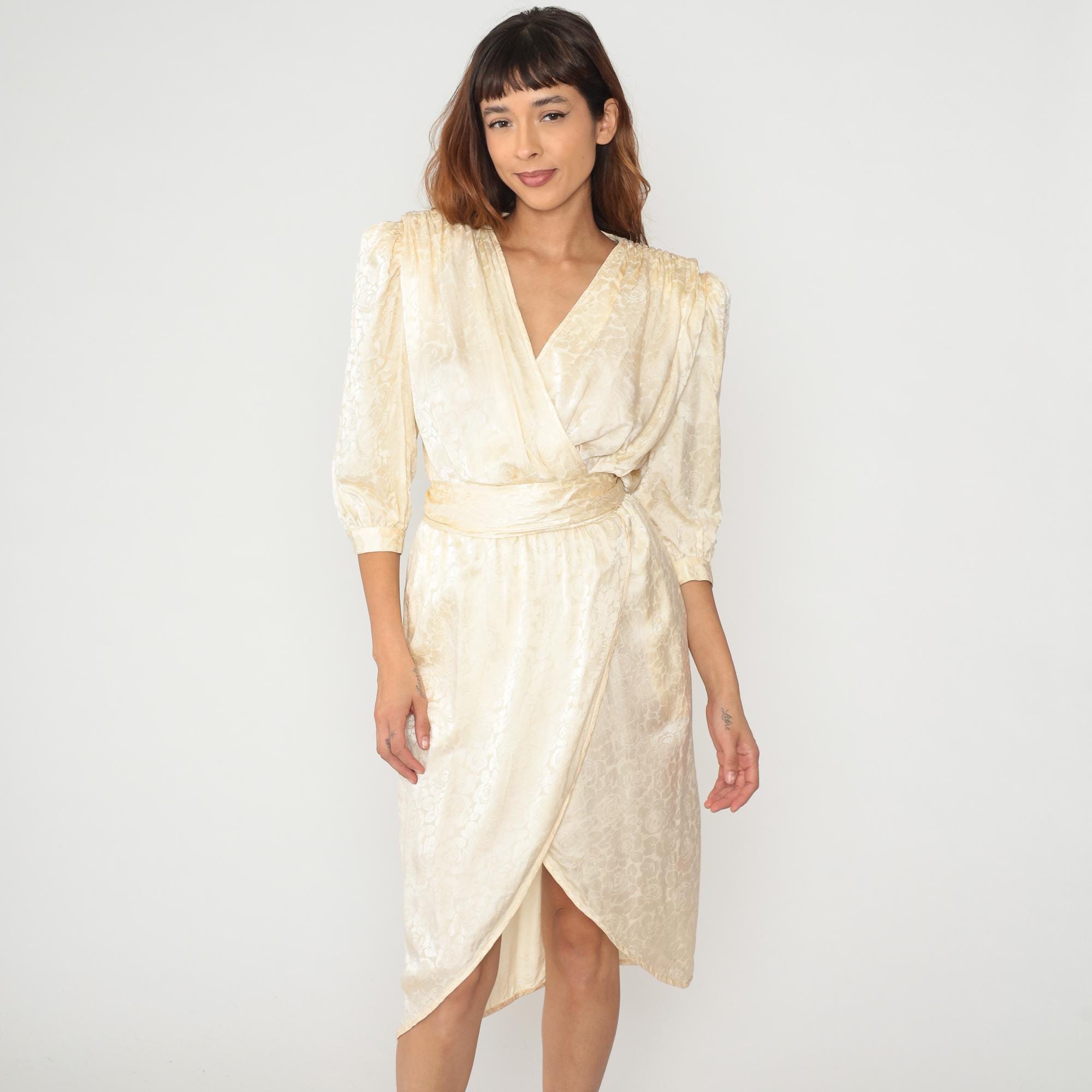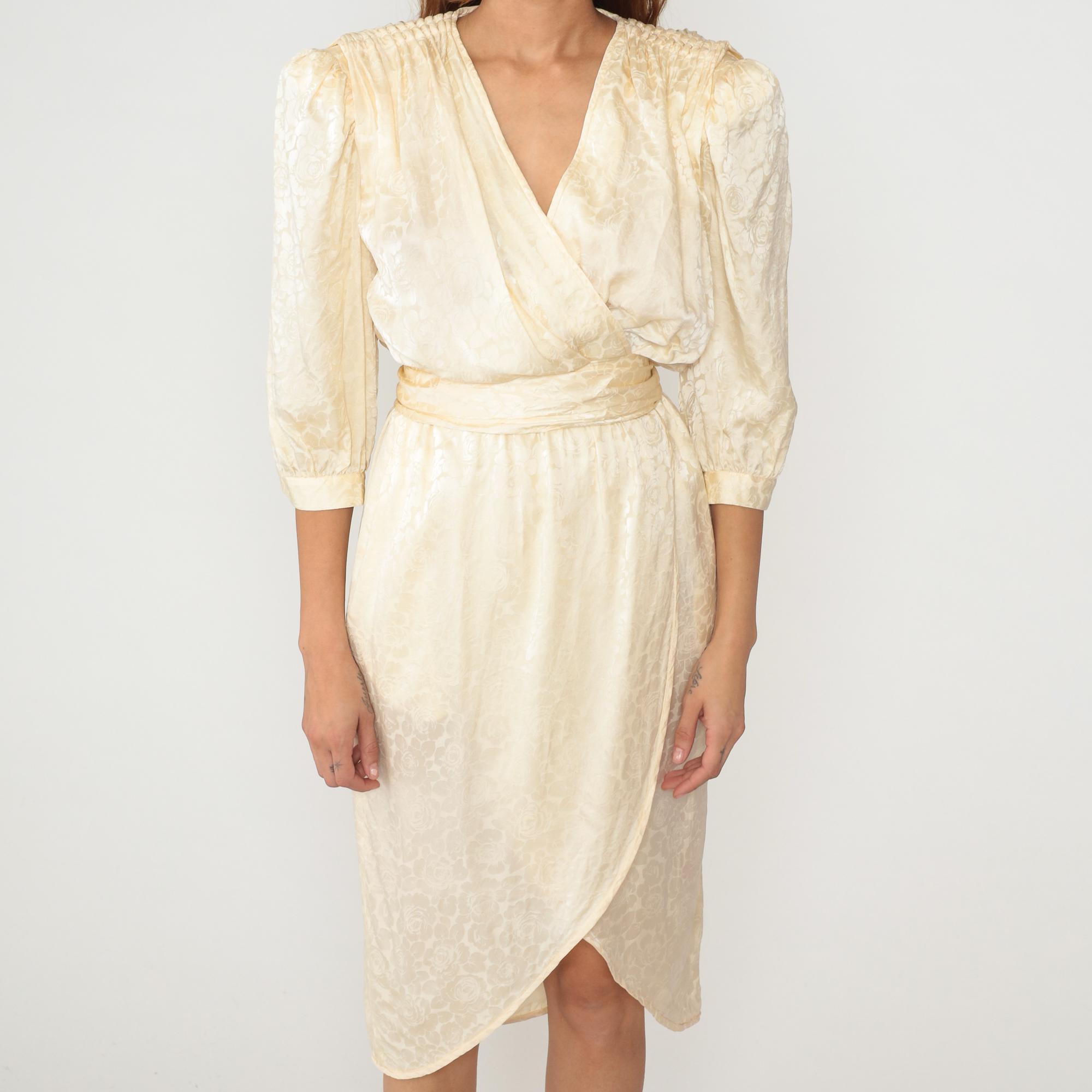 90s cream wrap dress from argenti in silk with subtle floral jacquard pattern throughout the fabric. V-neckline with surplice bodice, three-quarter sleeves with gathered cuffs, elasticated waist with attached sash tie.