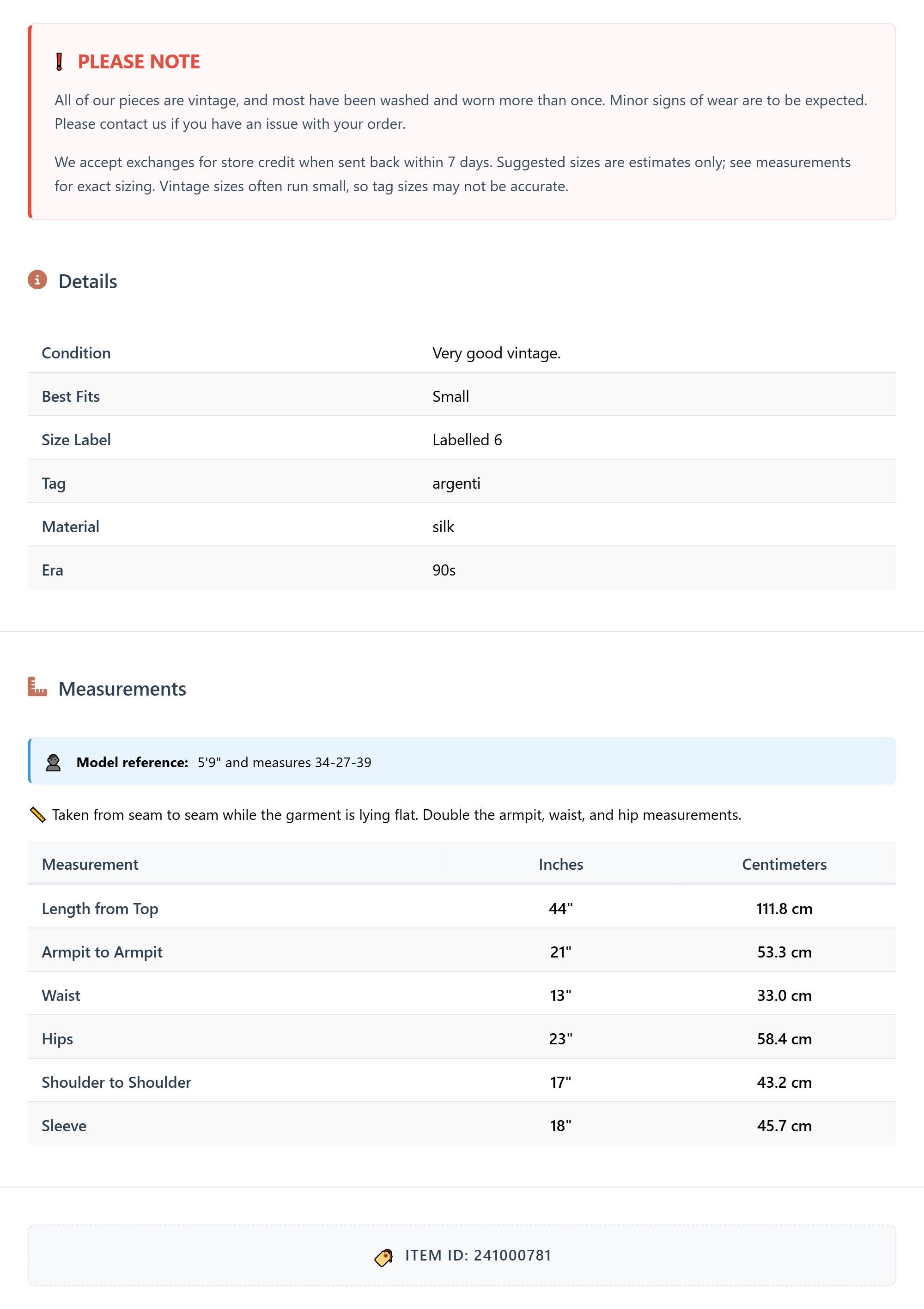 All of our pieces are vintage, and most have been washed and worn more than once. Minor signs of wear are to be expected. Please contact us if you have an issue with your order. We accept exchanges for store credit when sent back within 7 days.
