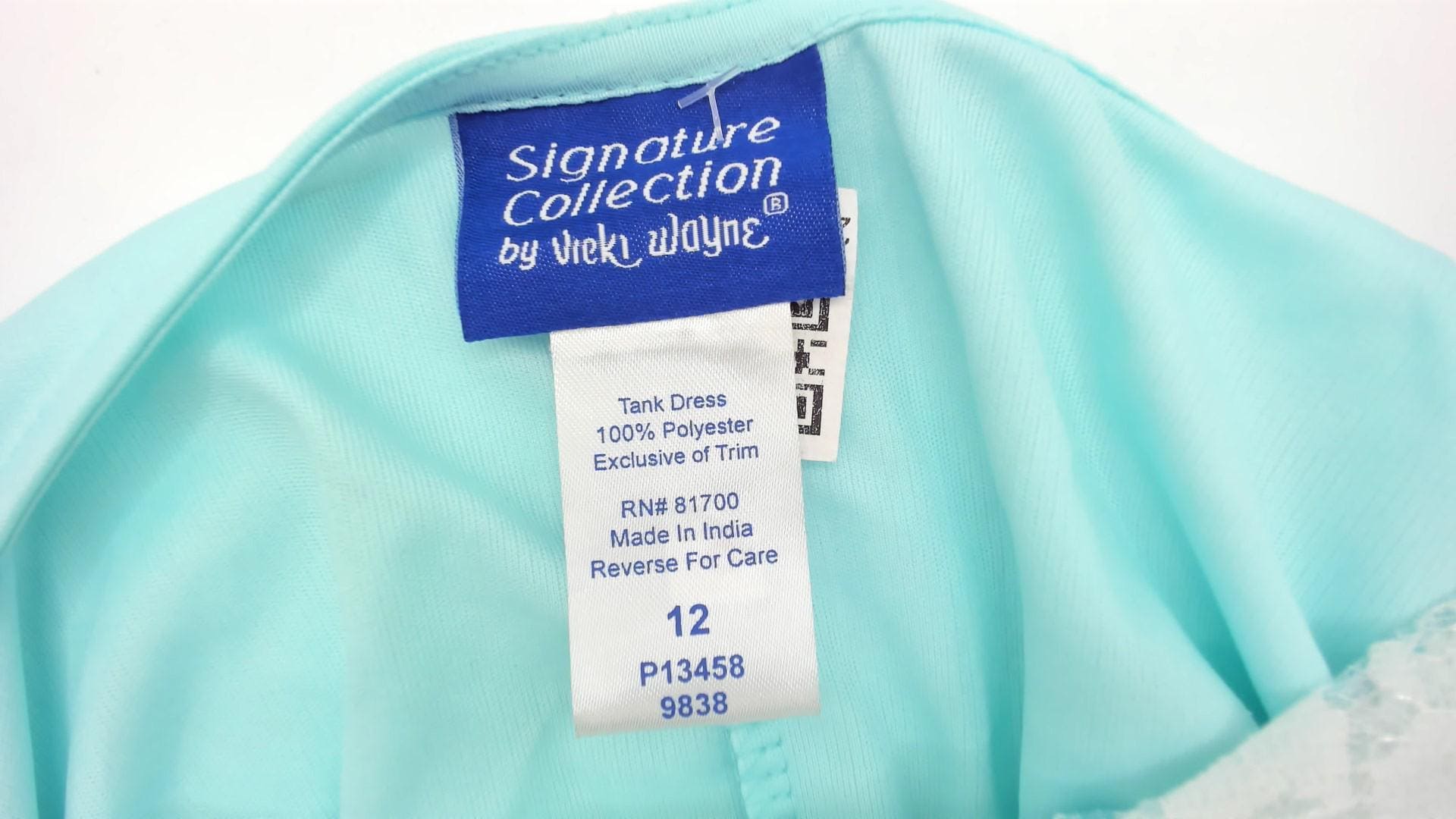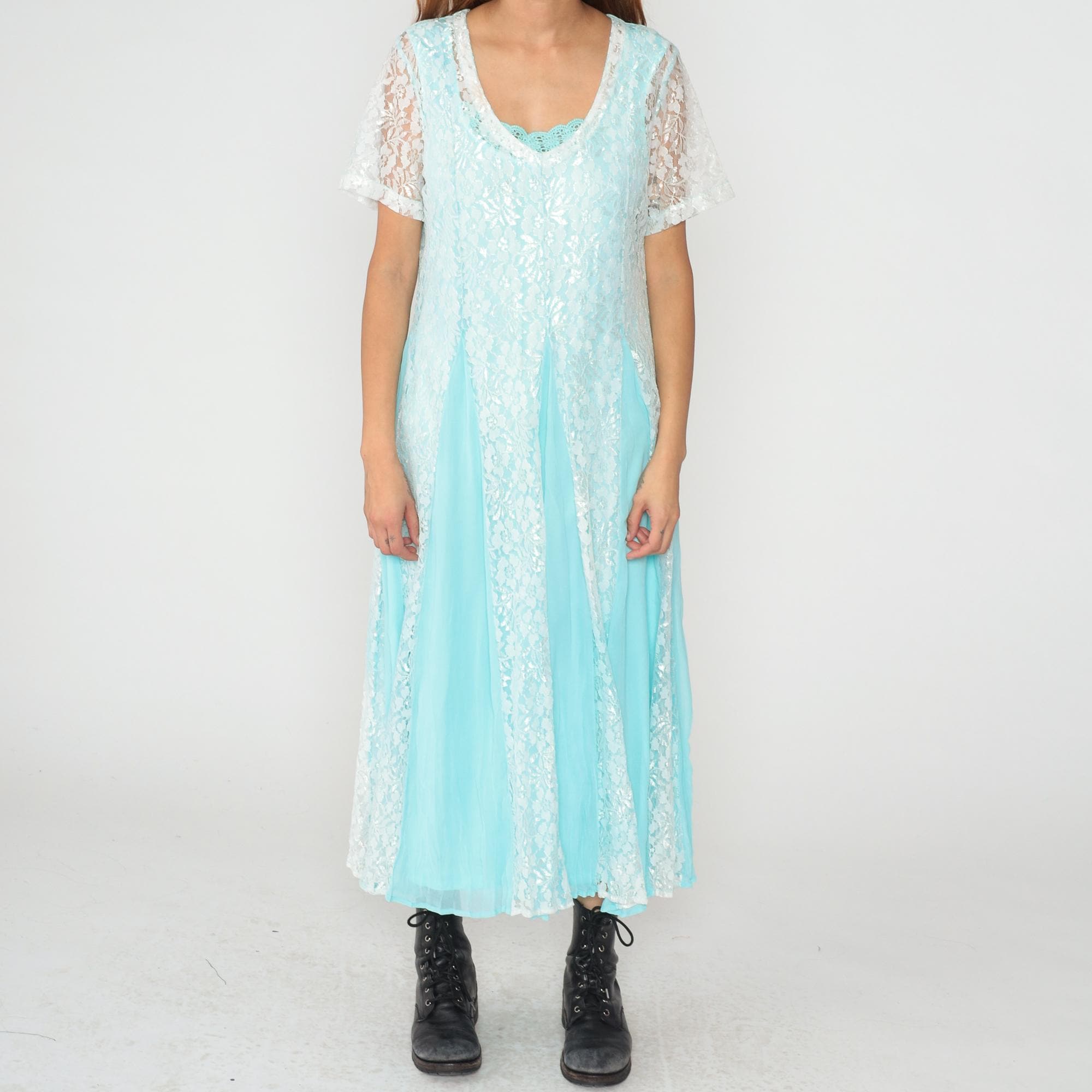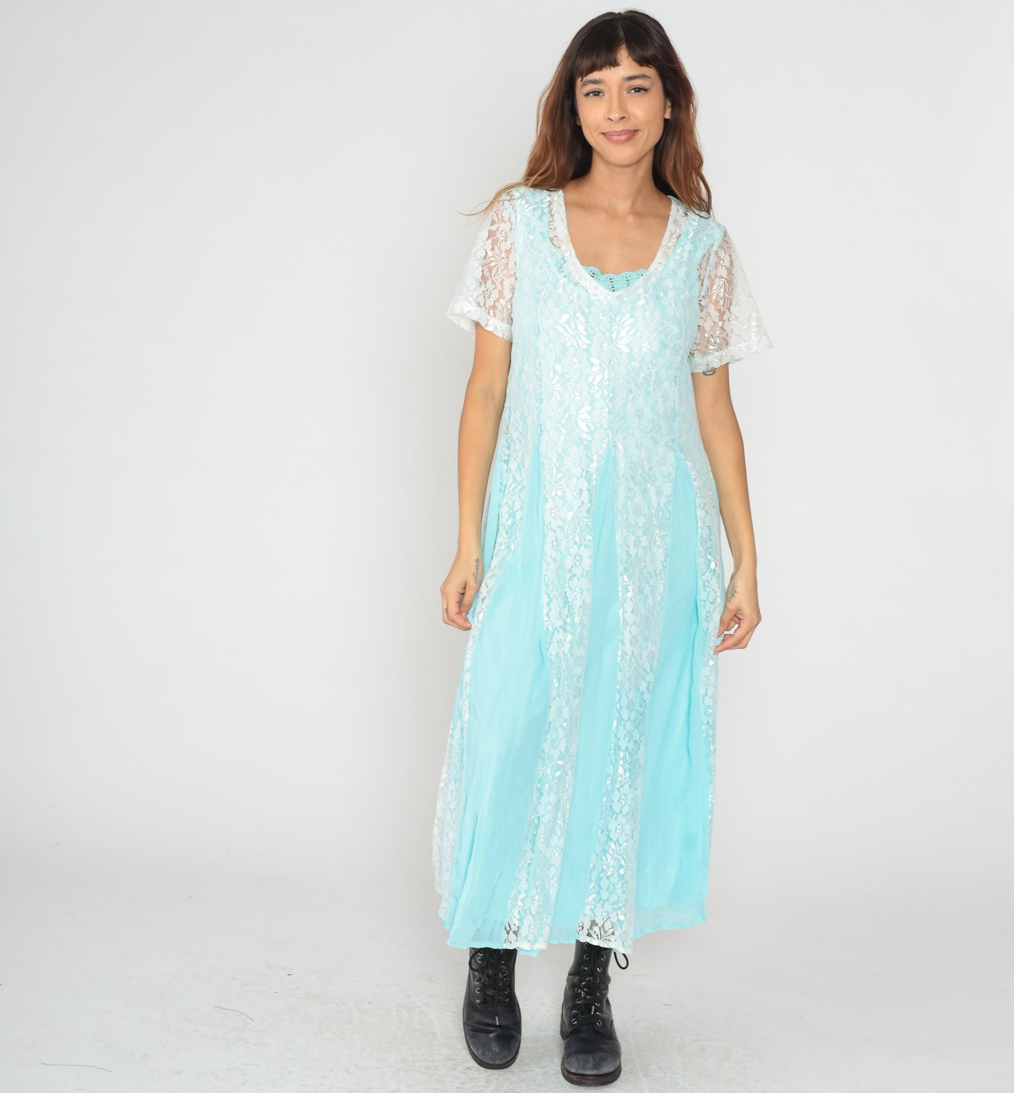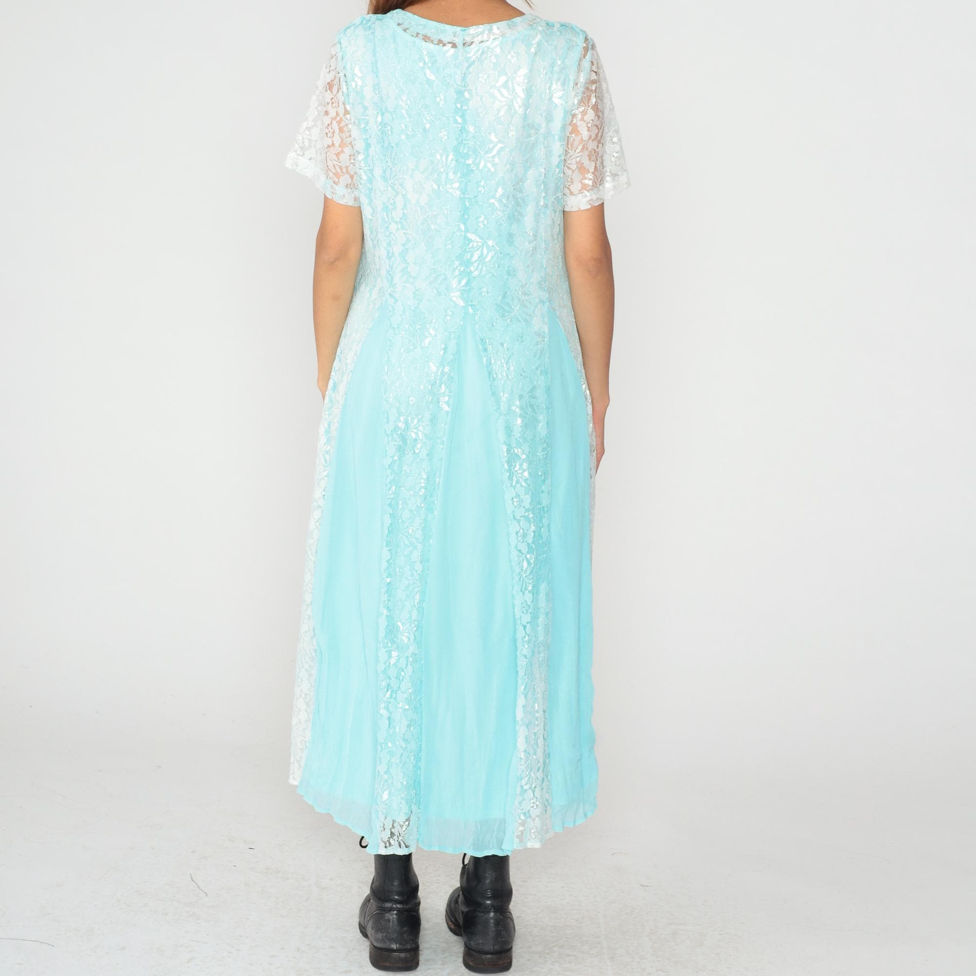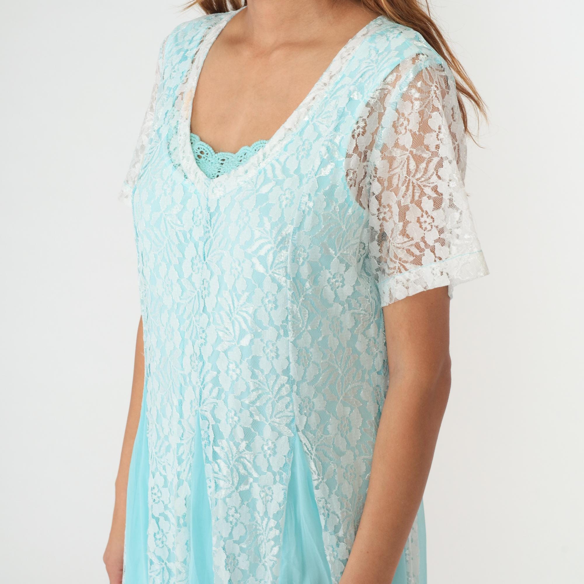 Aqua blue lace maxi dress from the 90s by Vicki Wayne with white lace short sleeves and white lace underlayer visible throughout. V-neckline with crochet trim detail, full-length straight skirt.