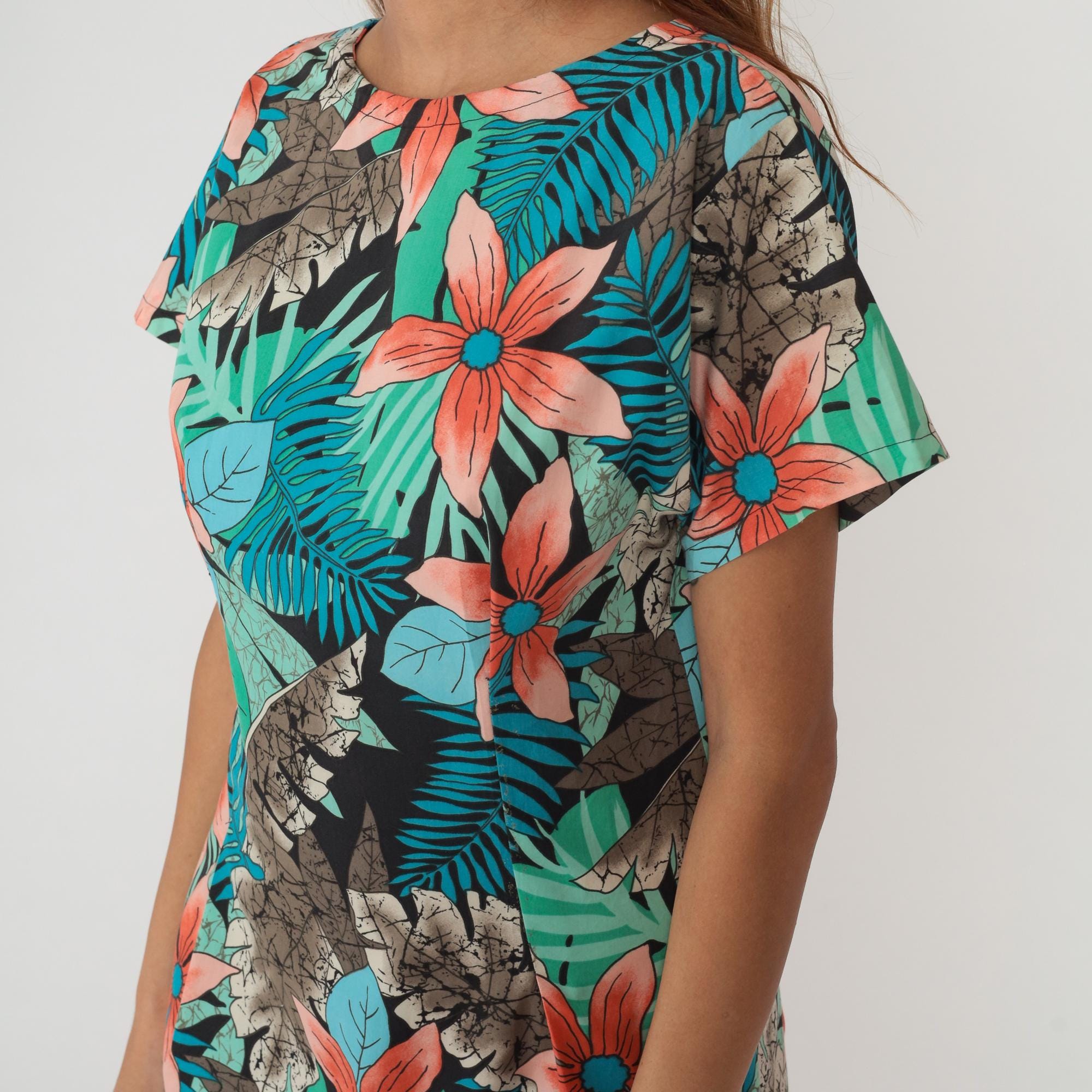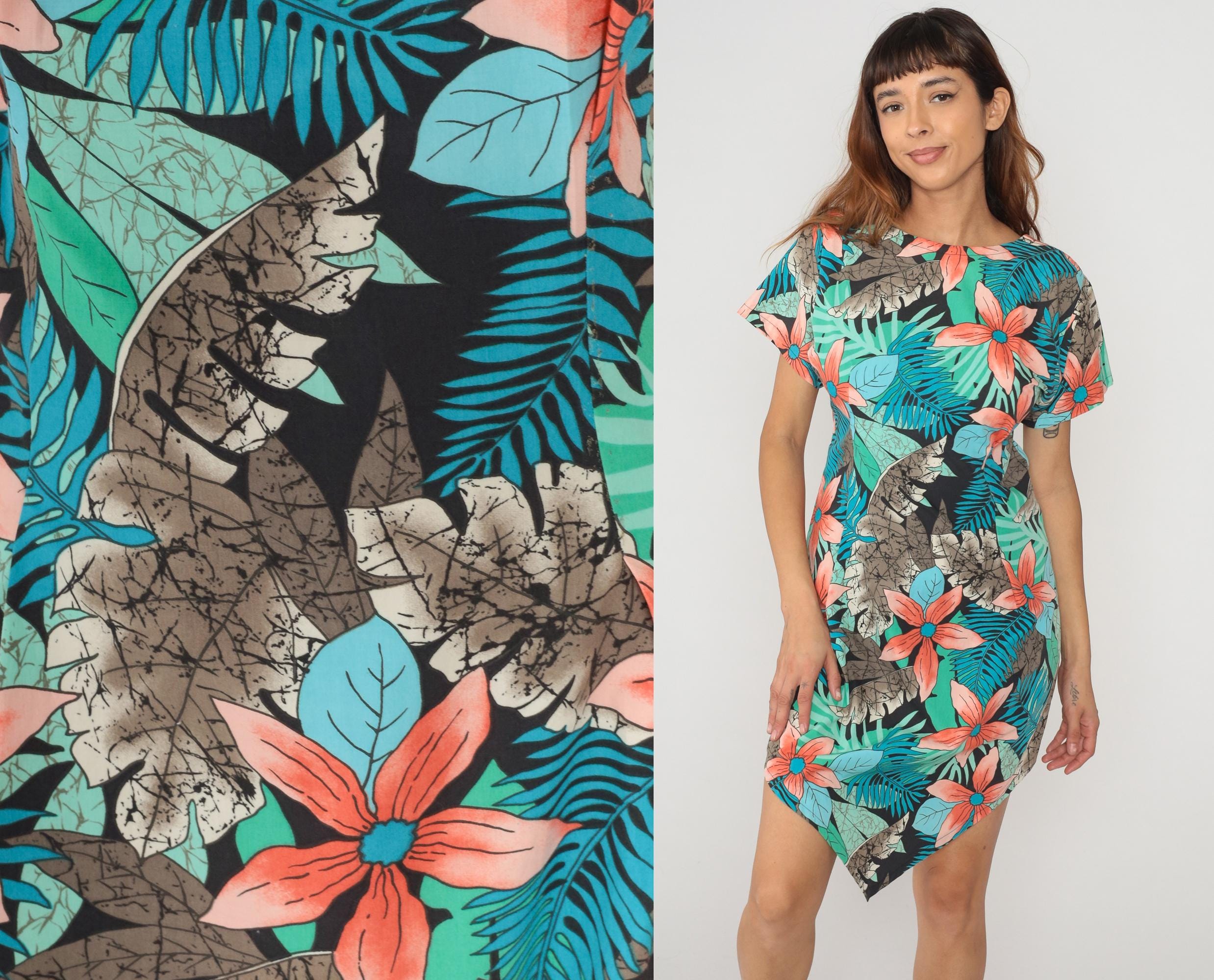 80s tropical print dress with turquoise, coral, mint green, and gray palm leaves and flowers across the fabric. Short sleeves, crew neckline, fitted silhouette with asymmetrical pointed hem.