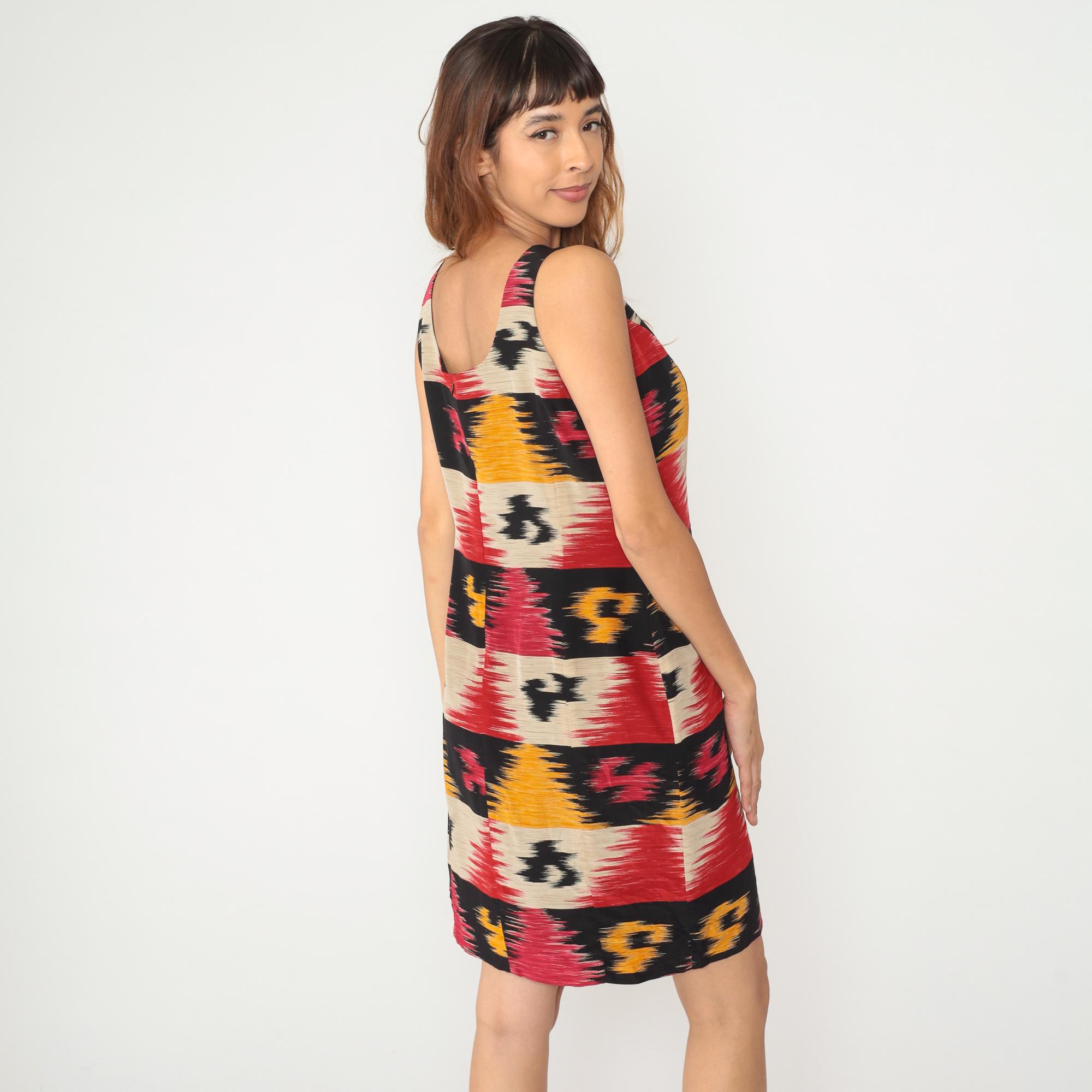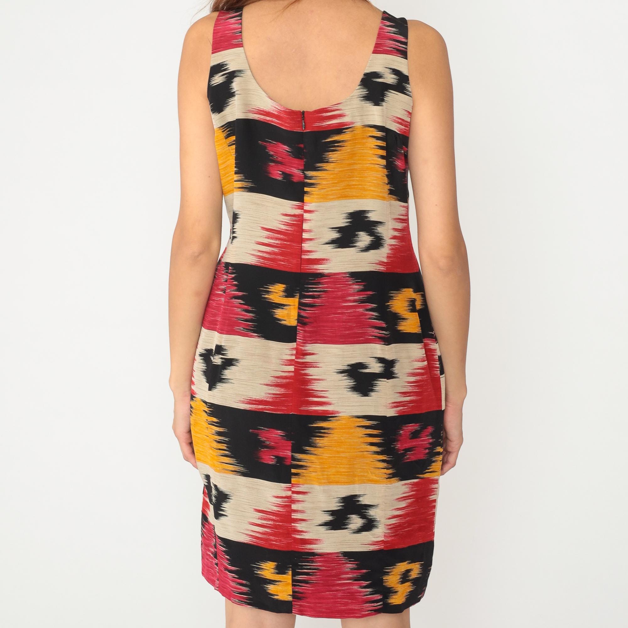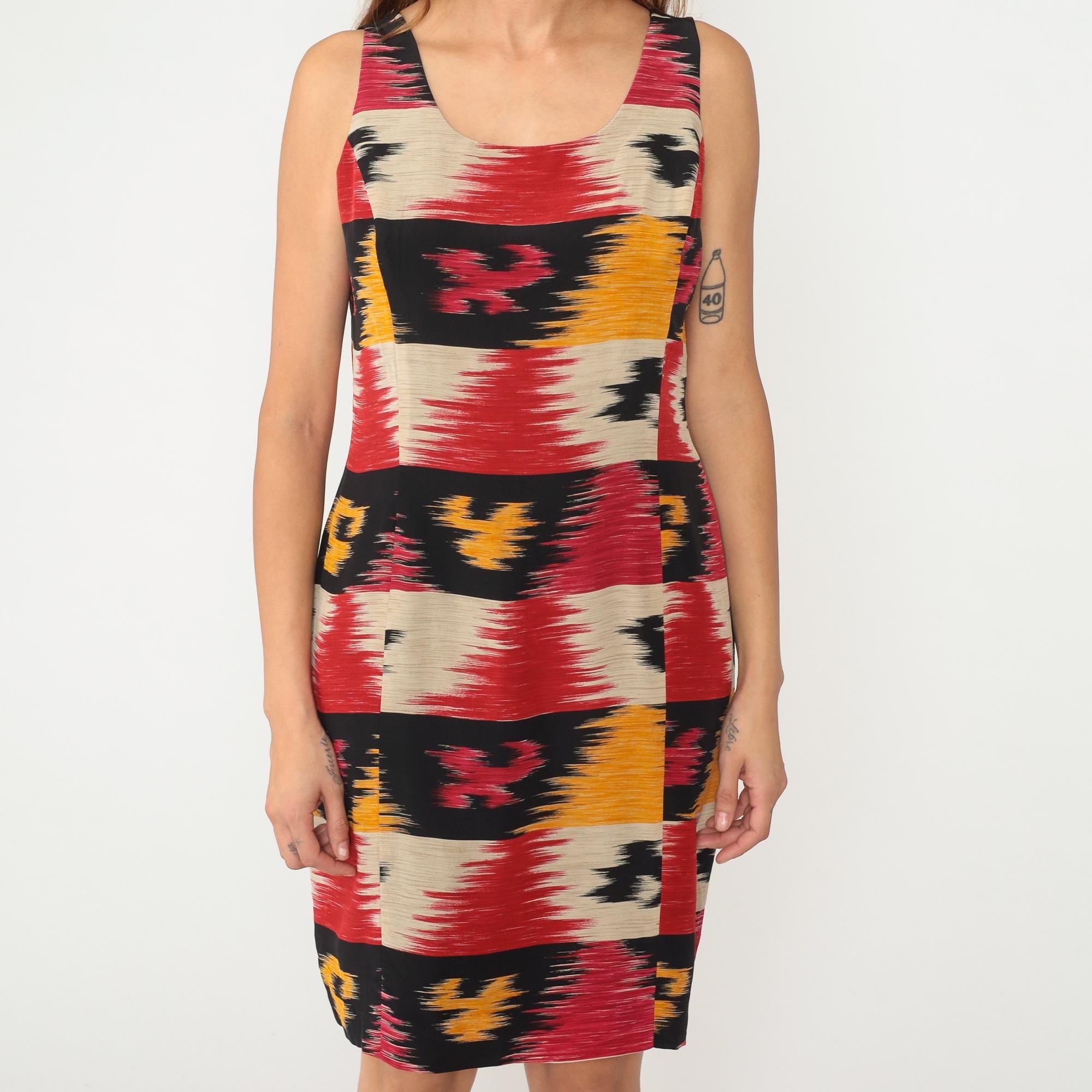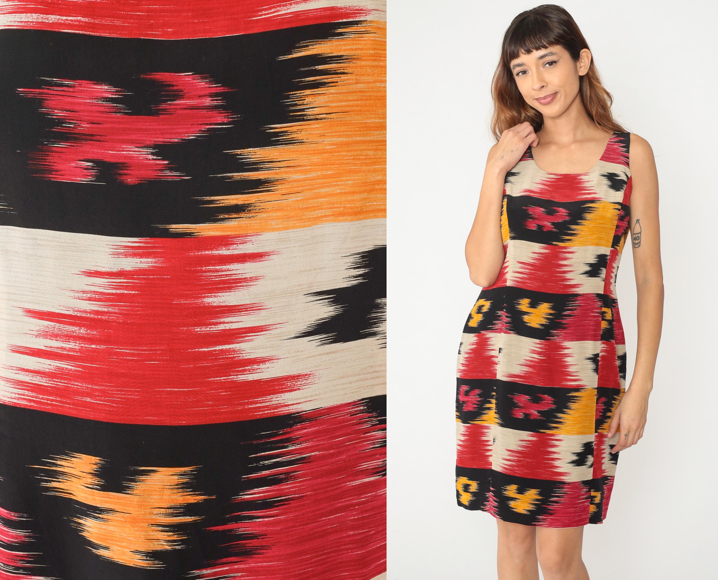 Y2K sleeveless dress from Jones New York with horizontal ikat stripe pattern in bands of red, orange, black, and beige. Scoop neckline, fitted silhouette through bodice and hips, above-knee length.