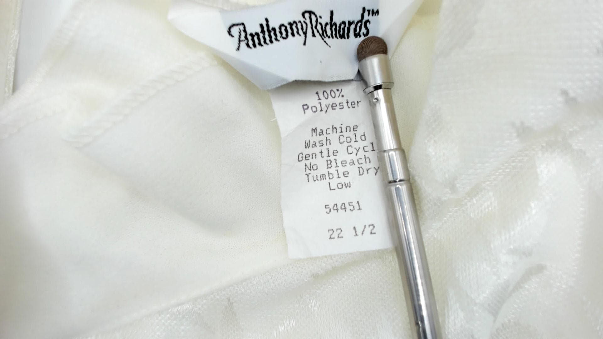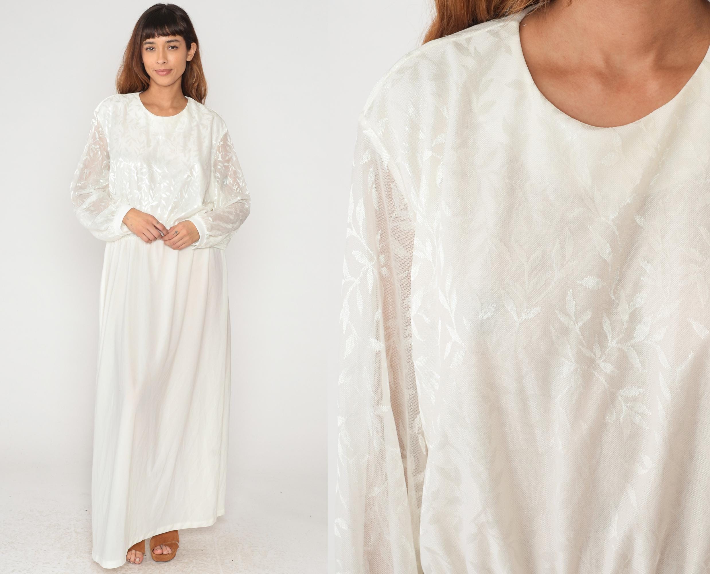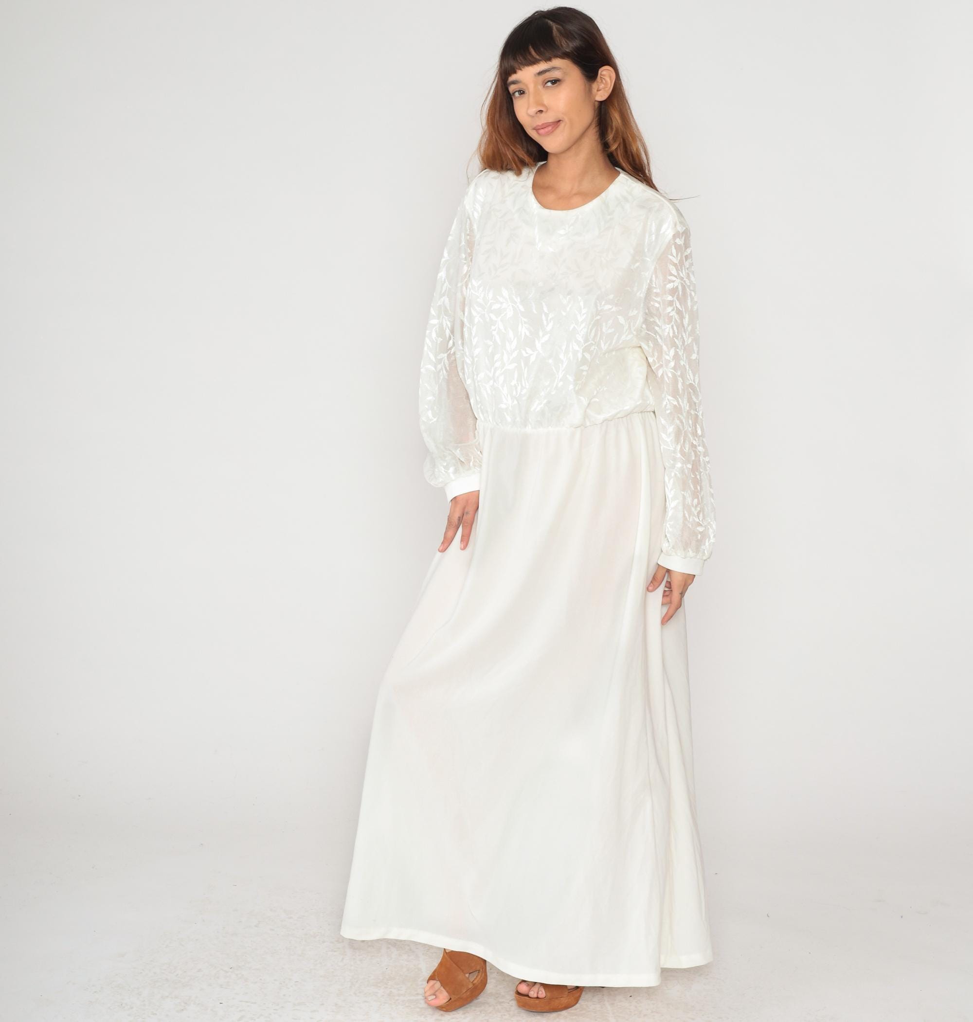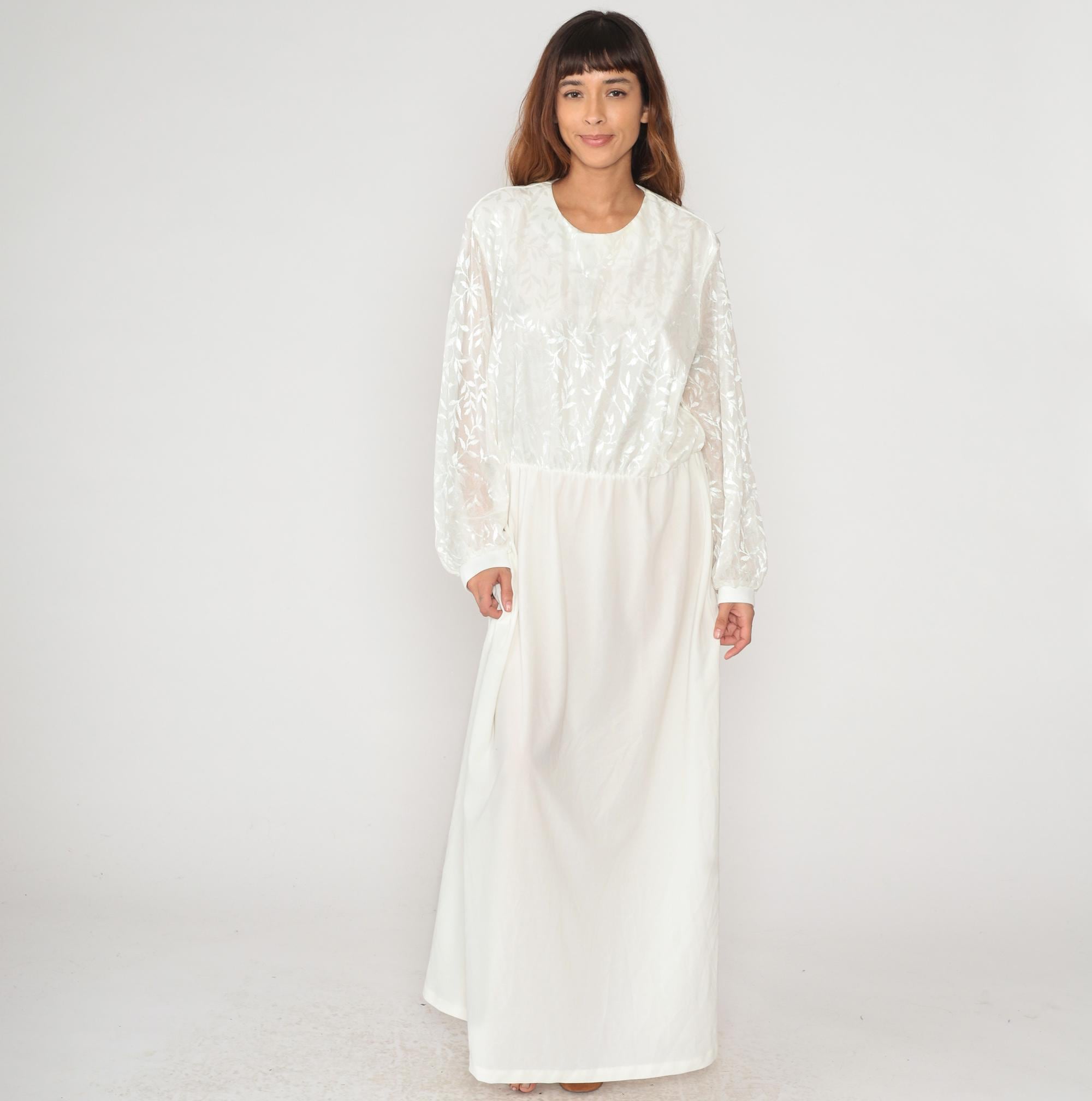 90s white maxi dress from Anthony Richards with sheer mesh sleeves and upper bodice featuring embroidered floral pattern. Round neckline with keyhole button closure at back of neck, long fitted sleeves with button cuffs, elastic gathered waistline.
