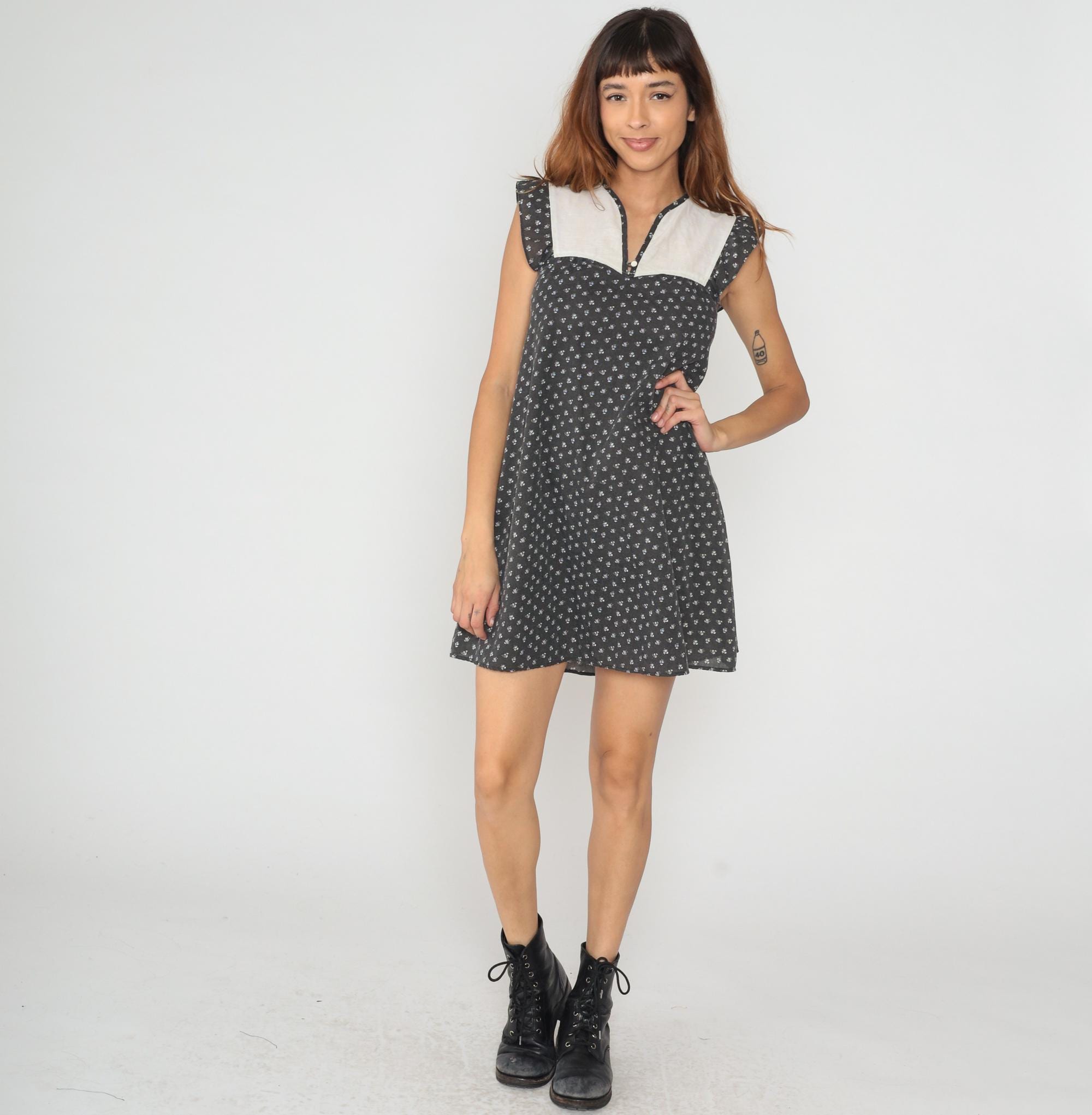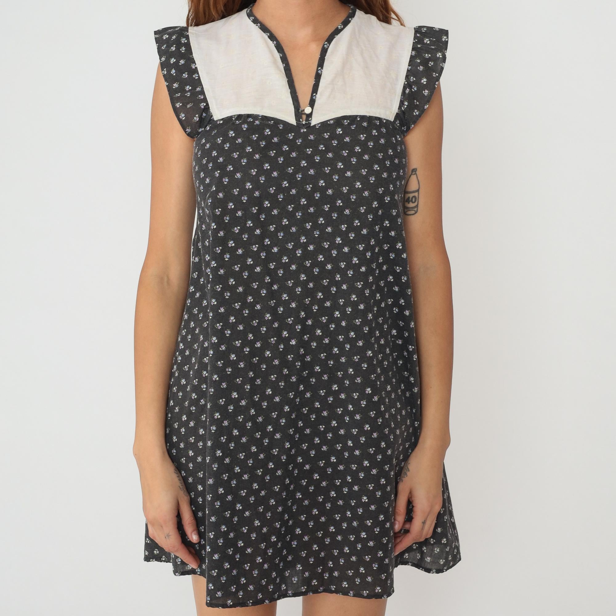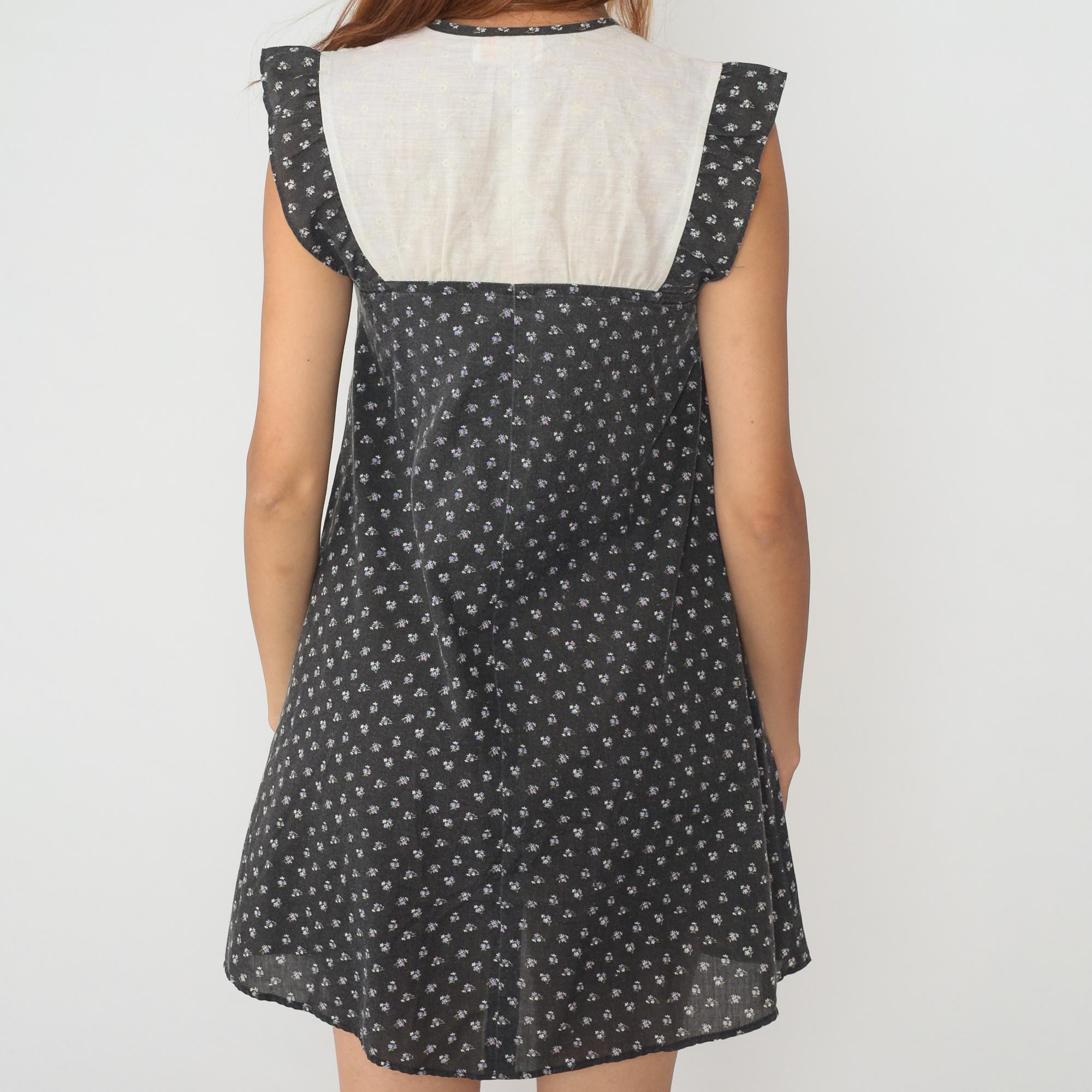 80s black floral mini dress with small white flower print and contrast cream yoke panel. V-neckline with matching trim, short flutter sleeves, empire waist seam below bust.