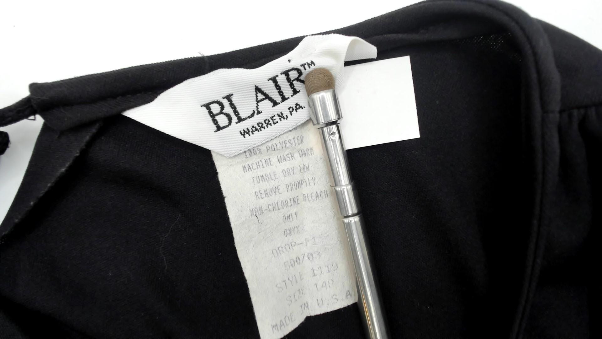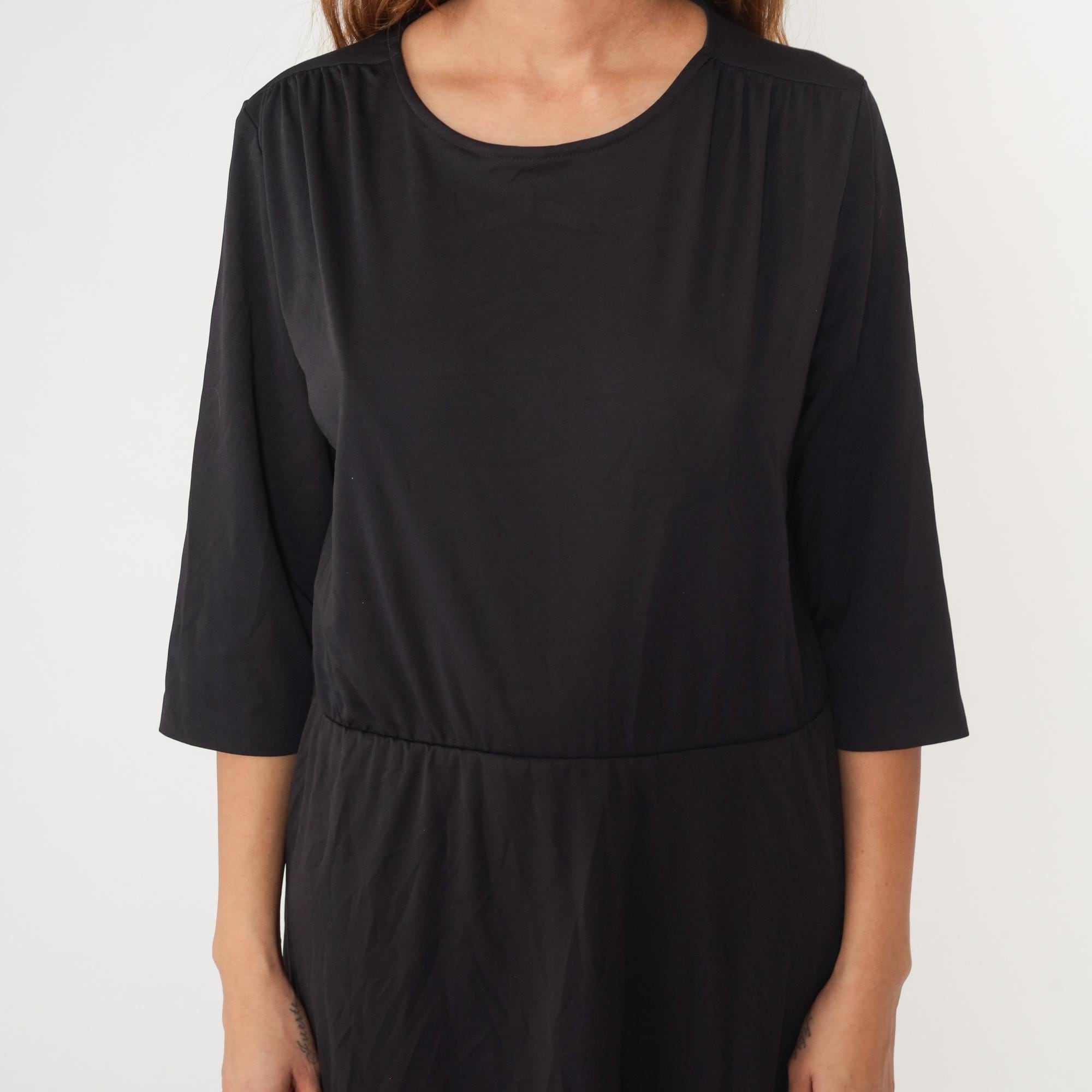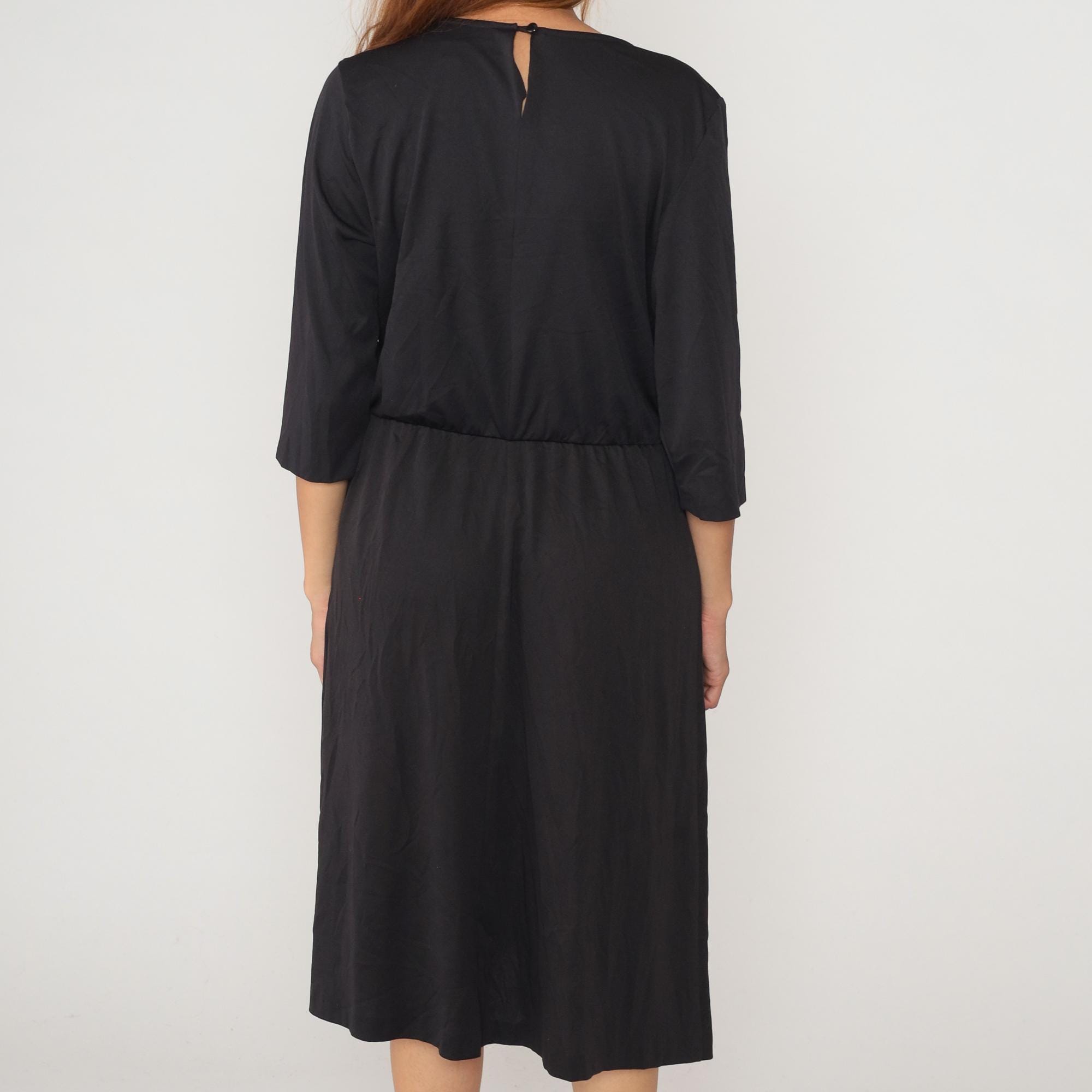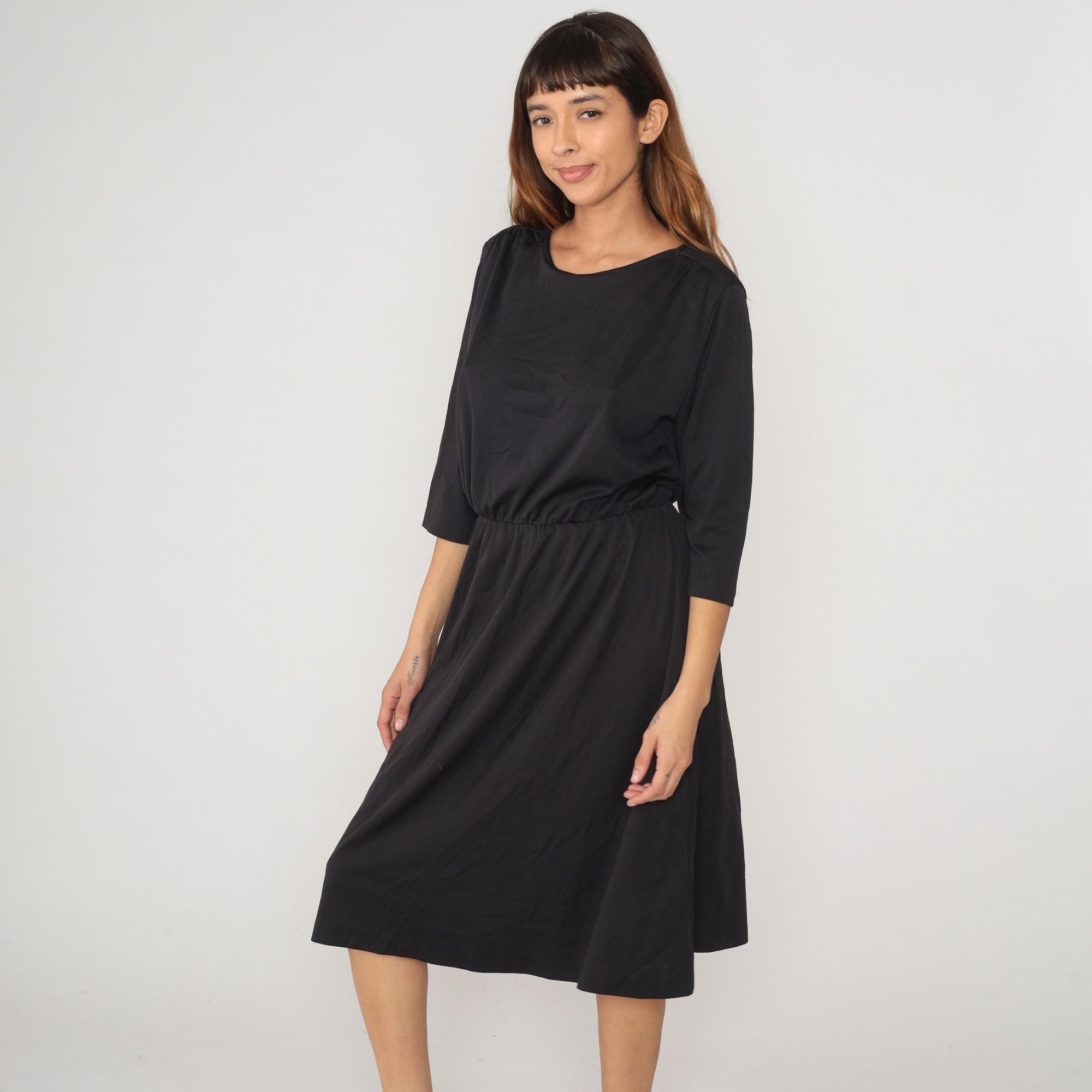 80s black midi dress from Blair with crew neckline and 3/4 sleeves. Defined waist seam, A-line skirt, back keyhole closure at neck.