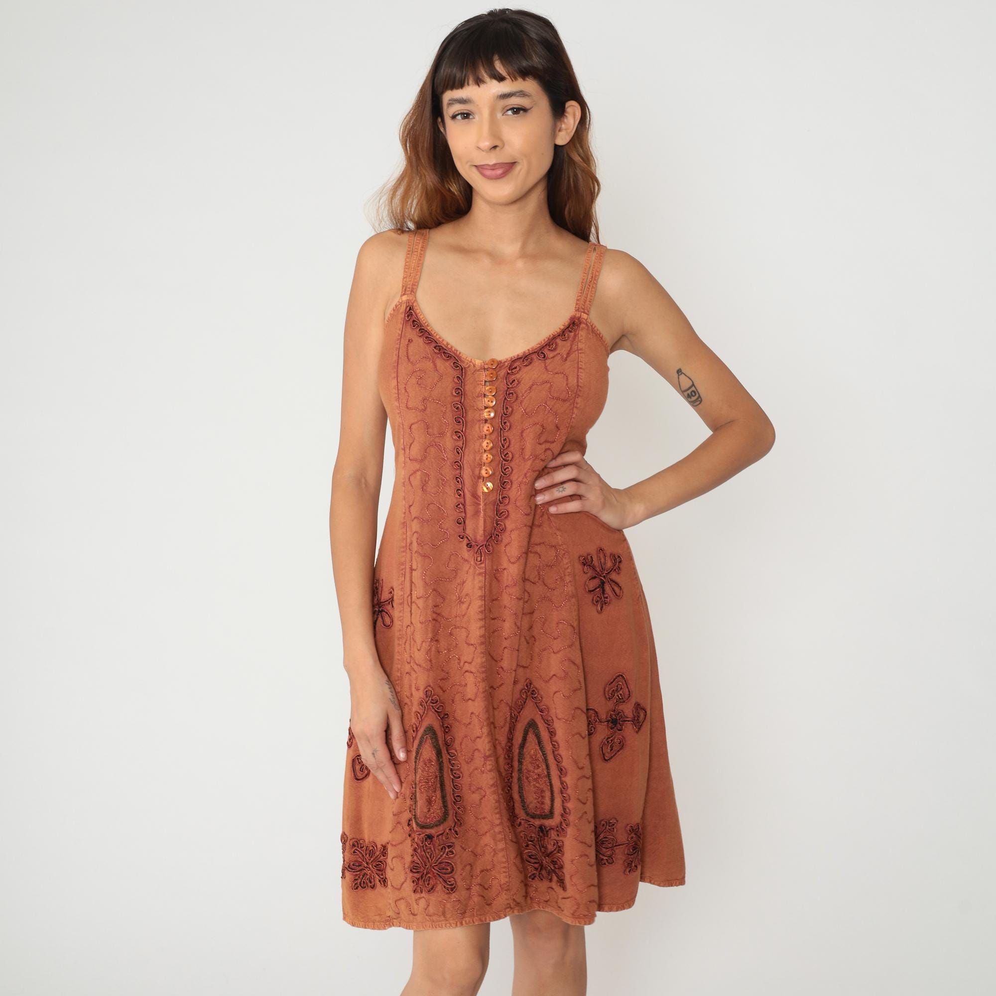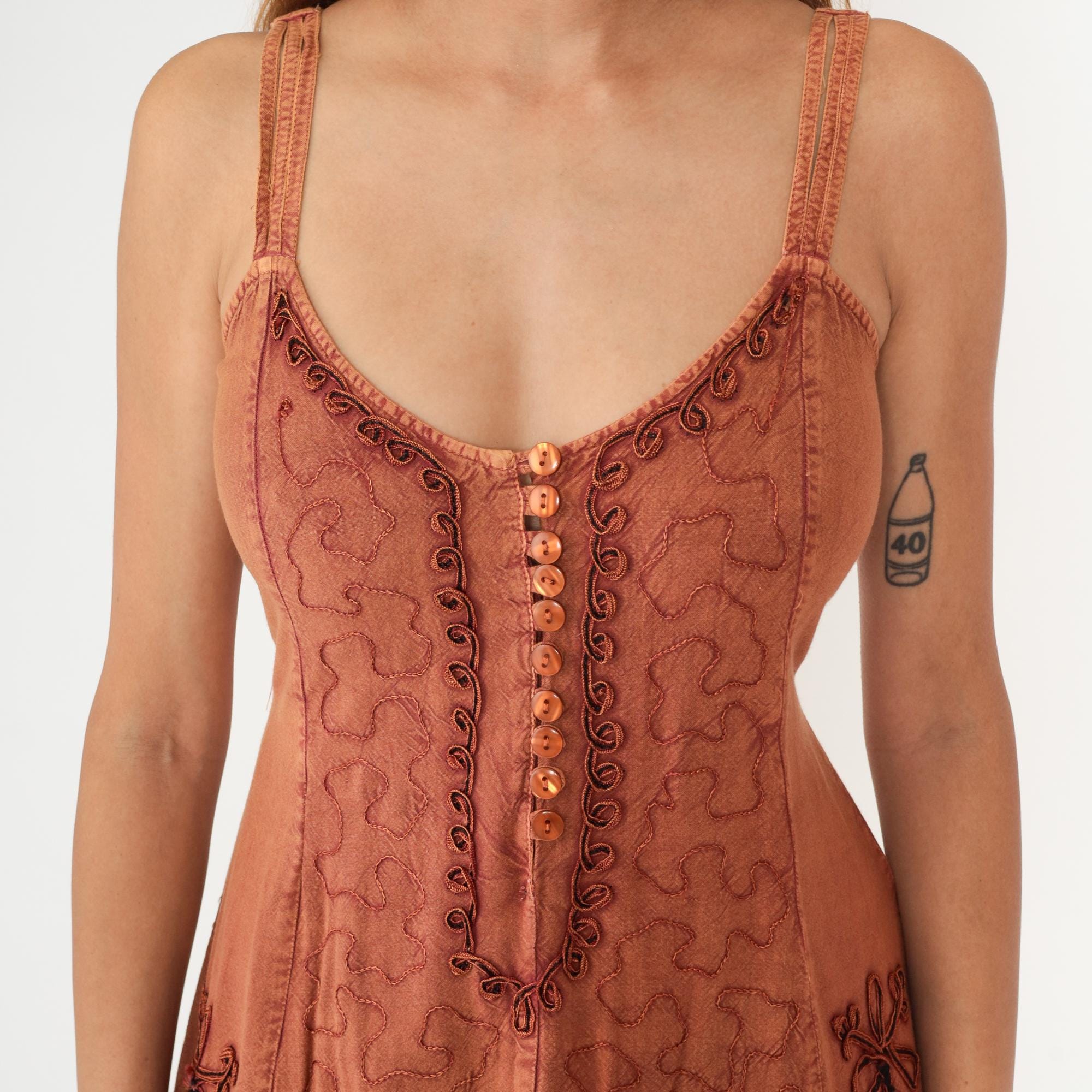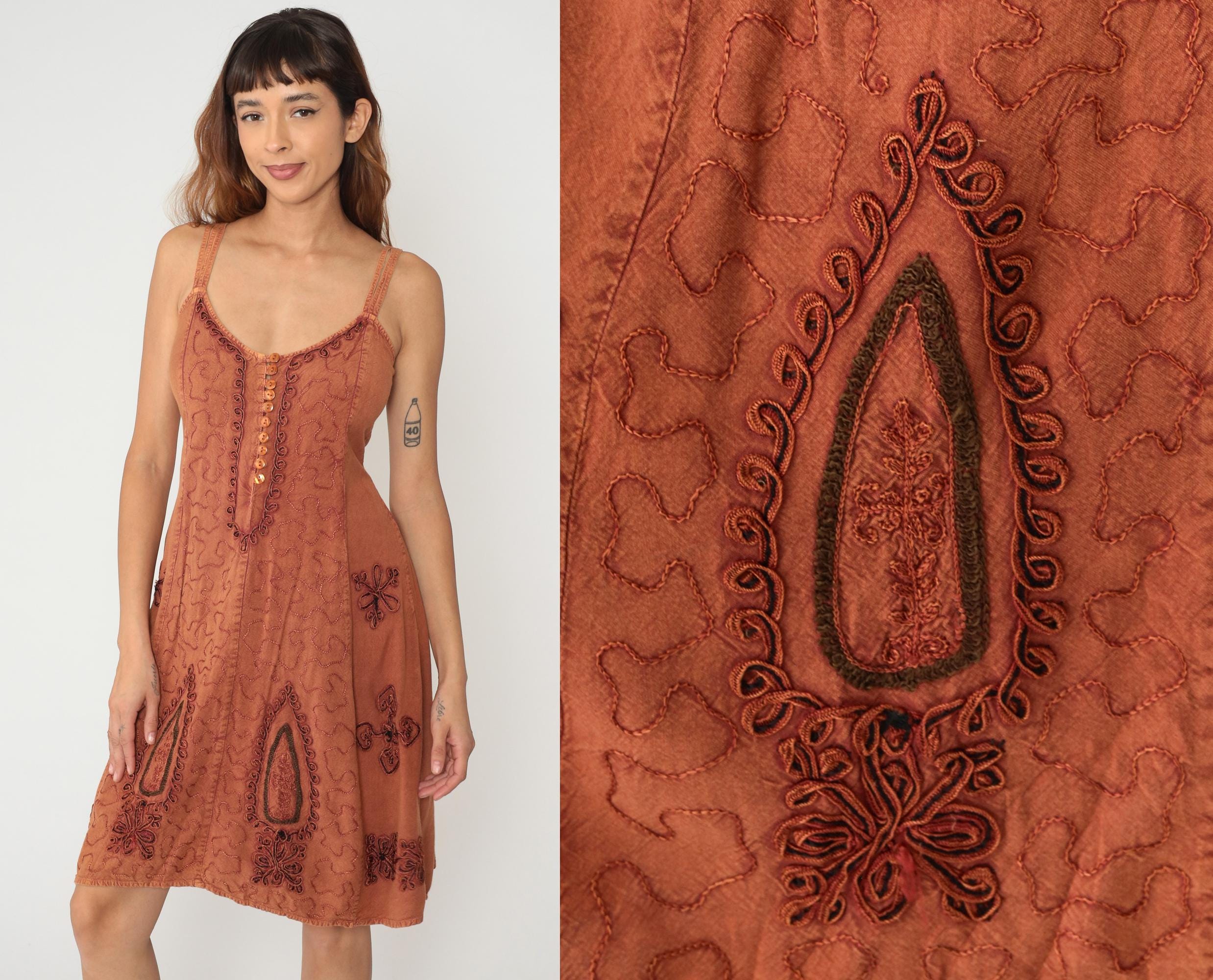 90s rust colored dress with embroidered swirl and teardrop motifs in darker tones throughout the fabric. Button front closure with spaghetti straps, back tie belt, decorative embroidery at neckline, hips, and hem. Rayon. Labeled Free size, fits Small to medium. .