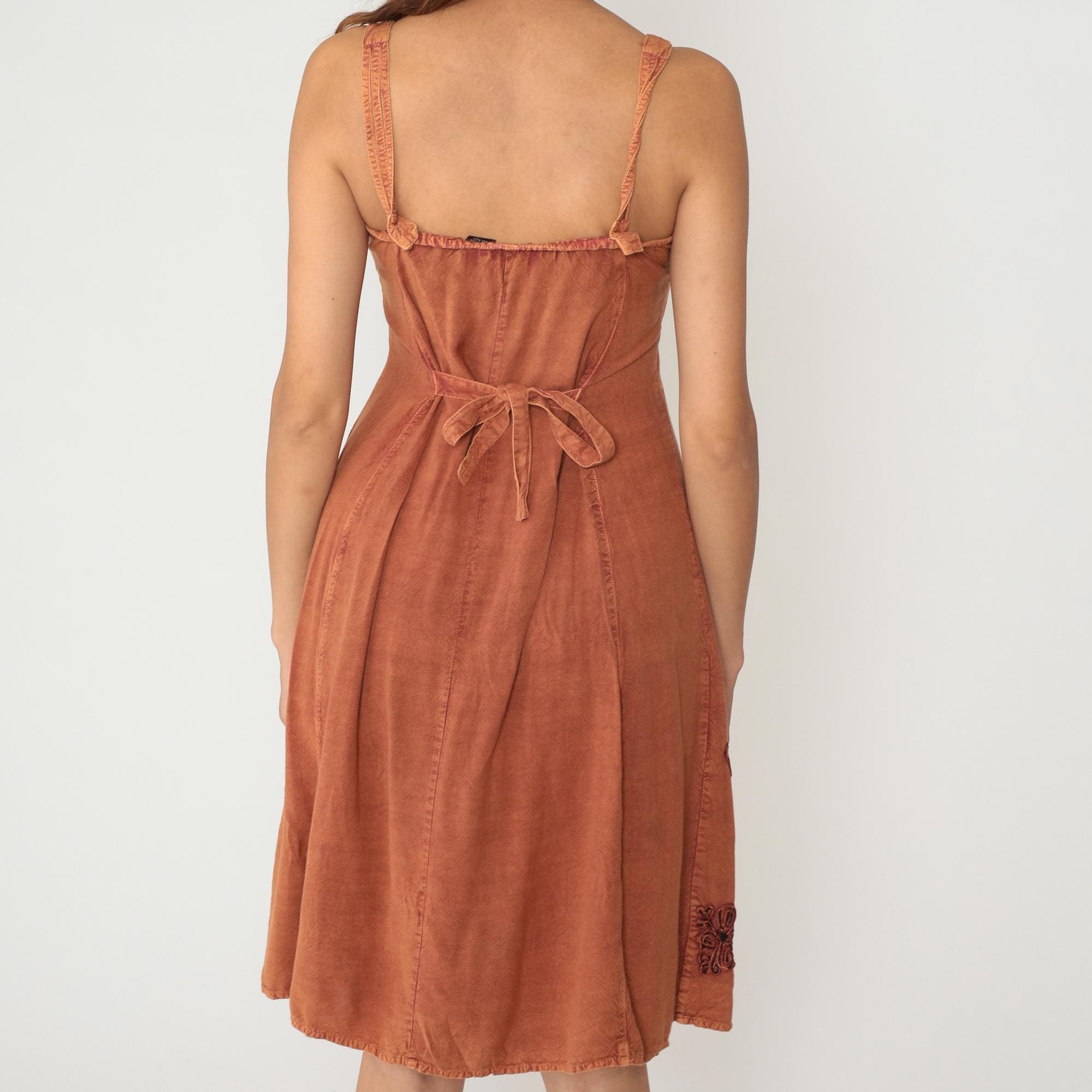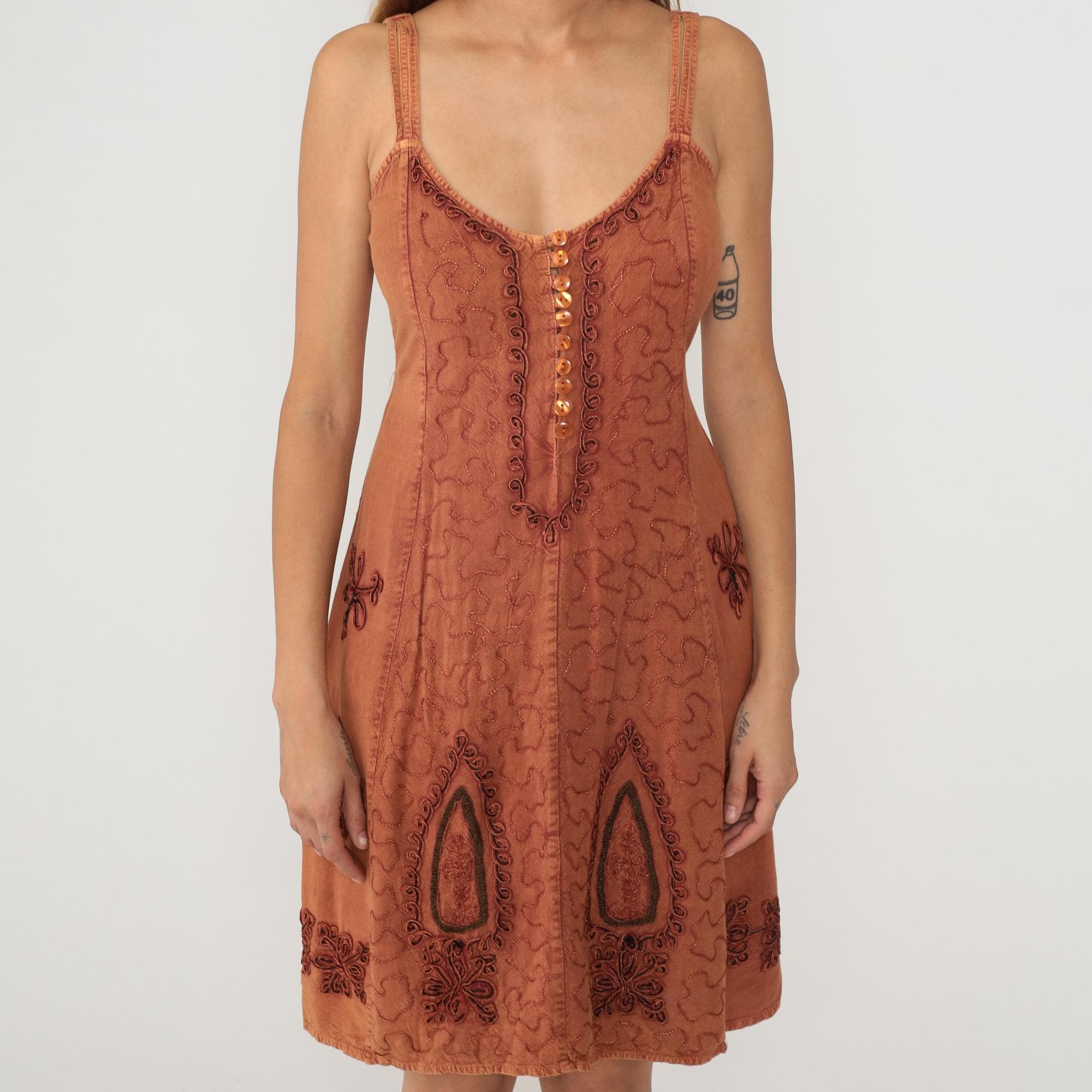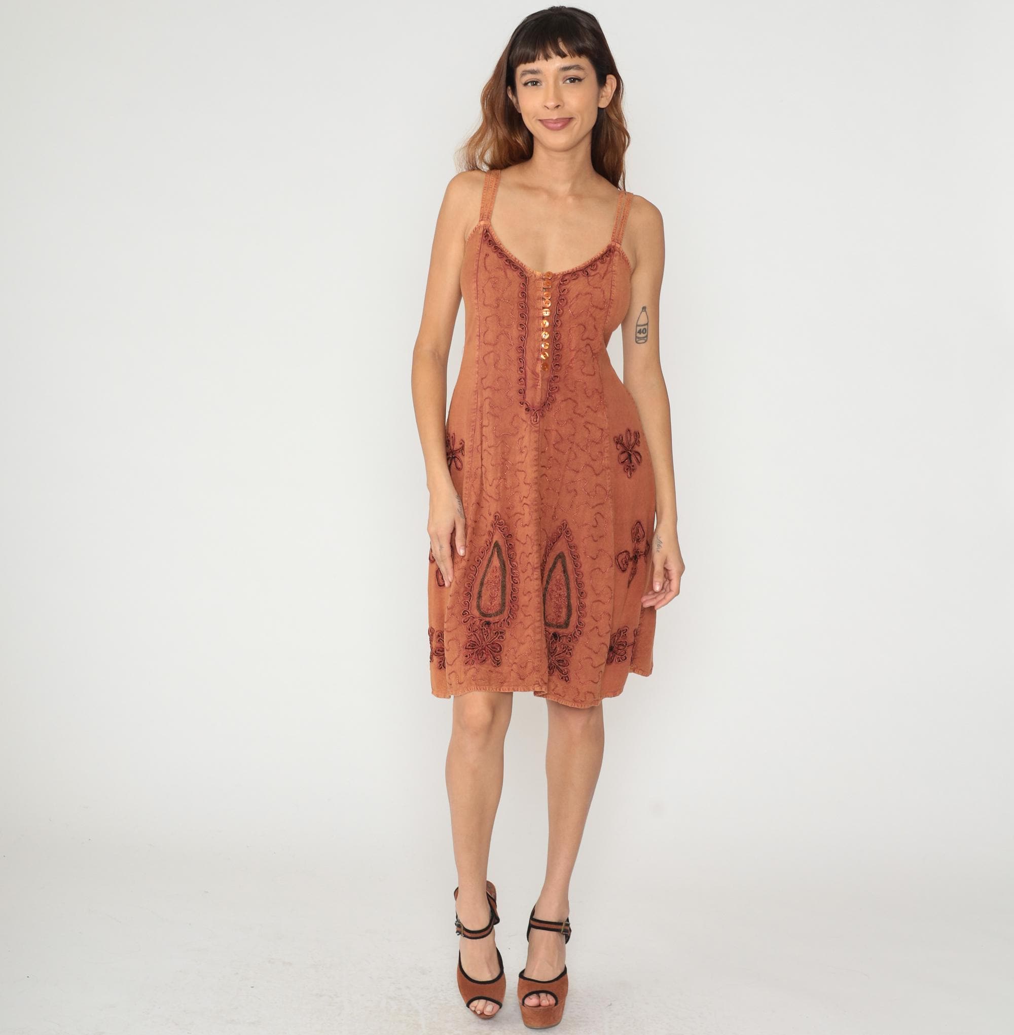 90s rust colored dress with embroidered swirl and teardrop motifs in darker tones throughout the fabric. Button front closure with spaghetti straps, back tie belt, decorative embroidery at neckline, hips, and hem. Rayon. Labeled Free size, fits Small to medium. .