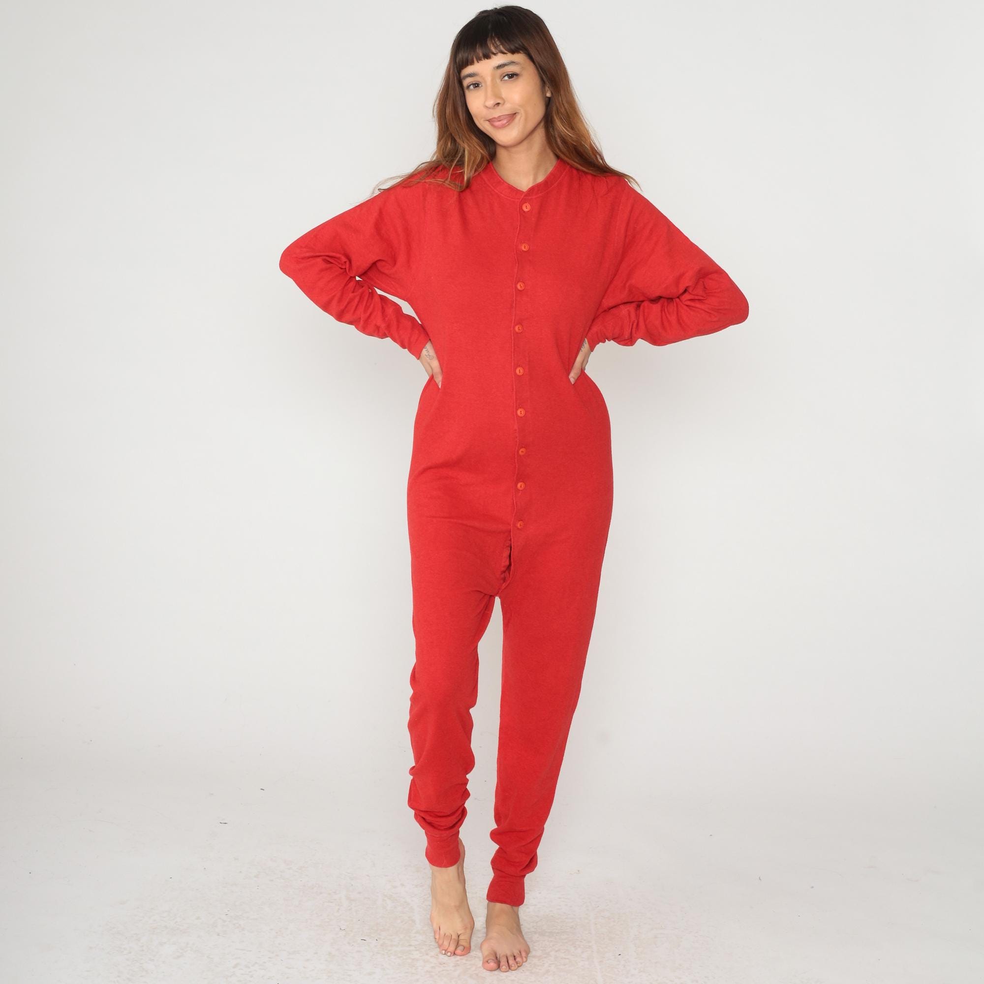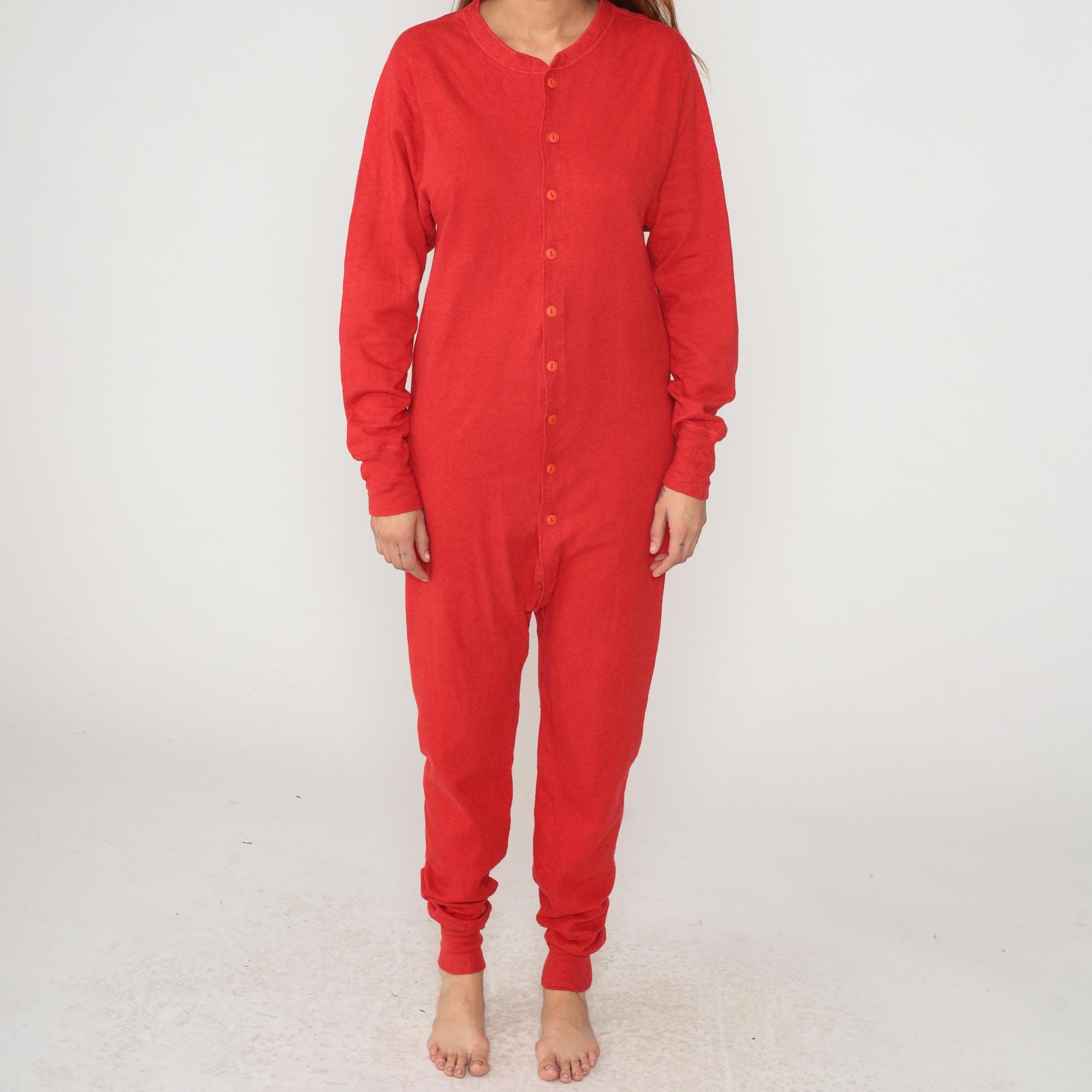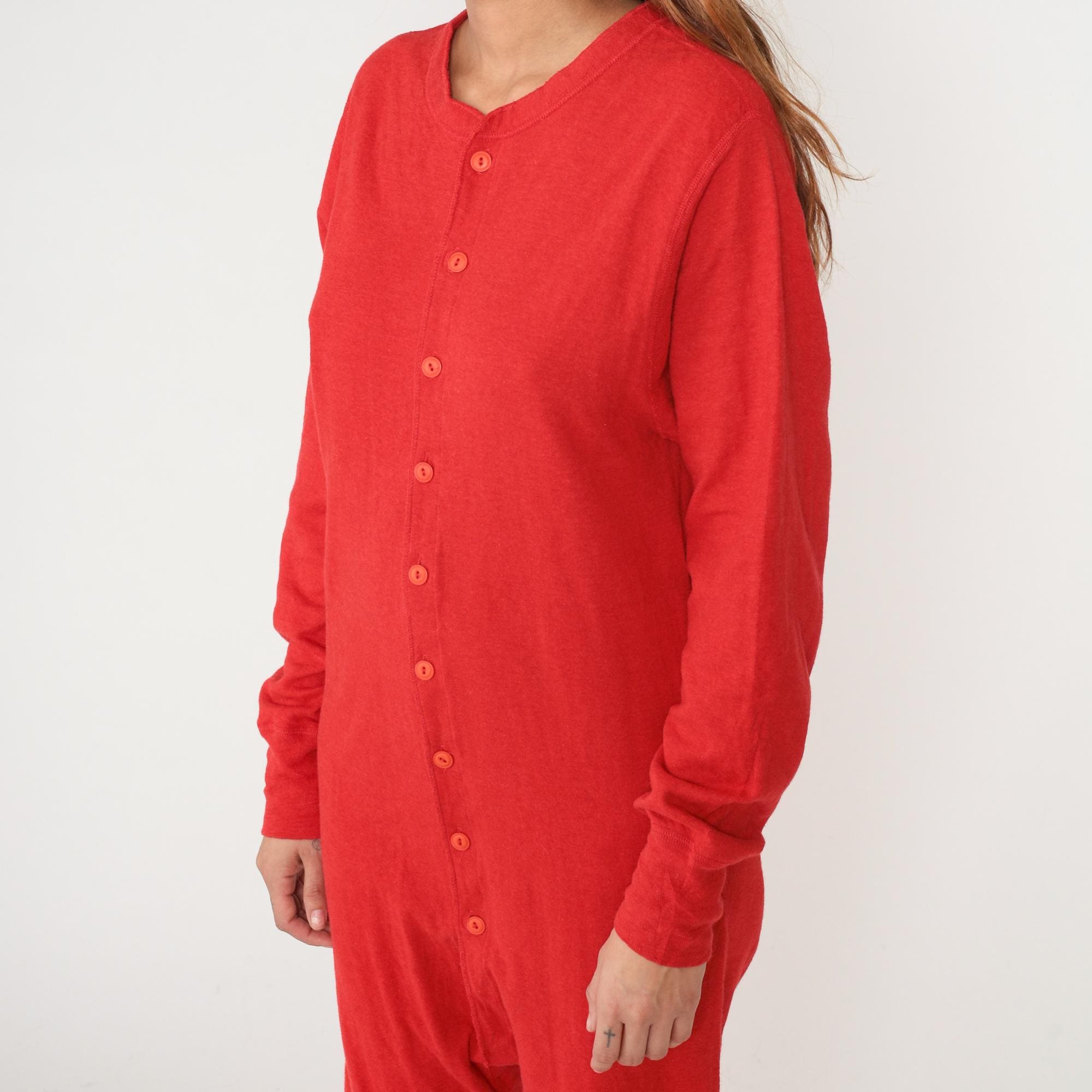 80s red union suit from ll bean with button front closure and ribbed knit construction throughout. Long sleeves and full length legs, both with ribbed cuffs, ribbed collar neckline.