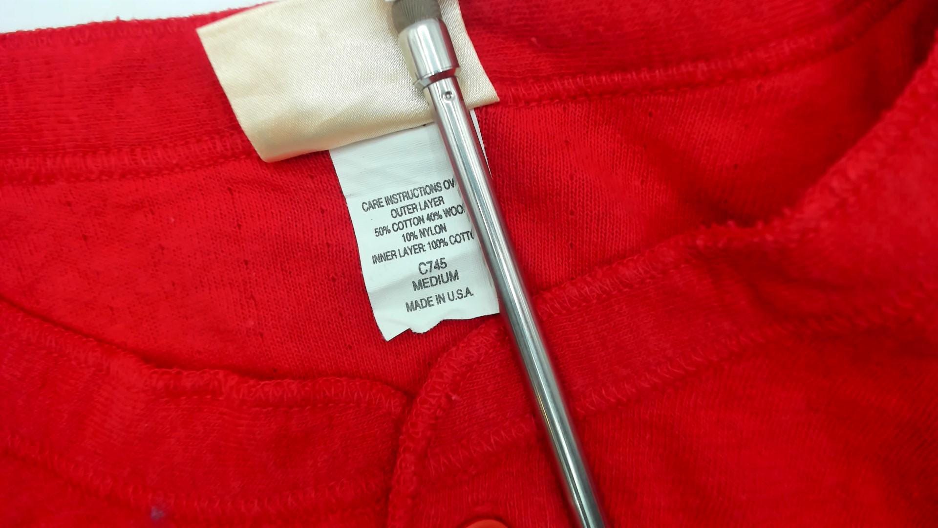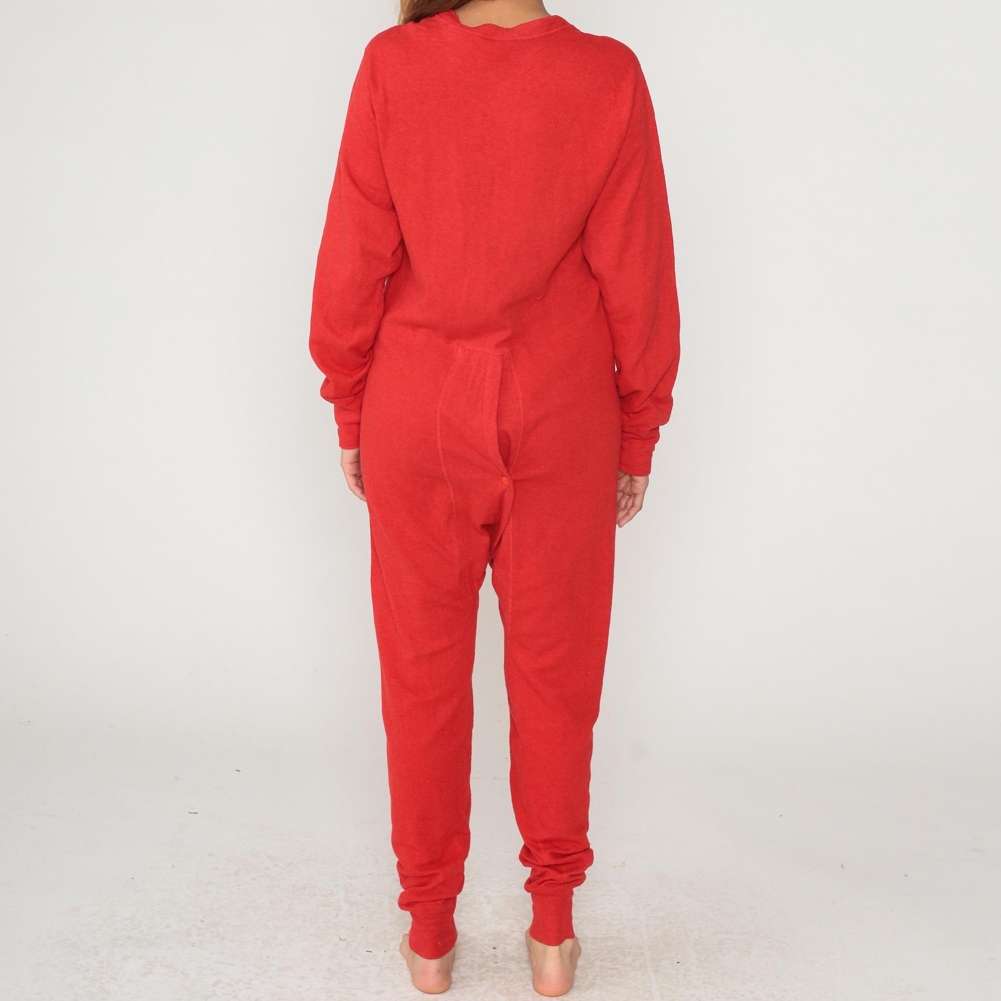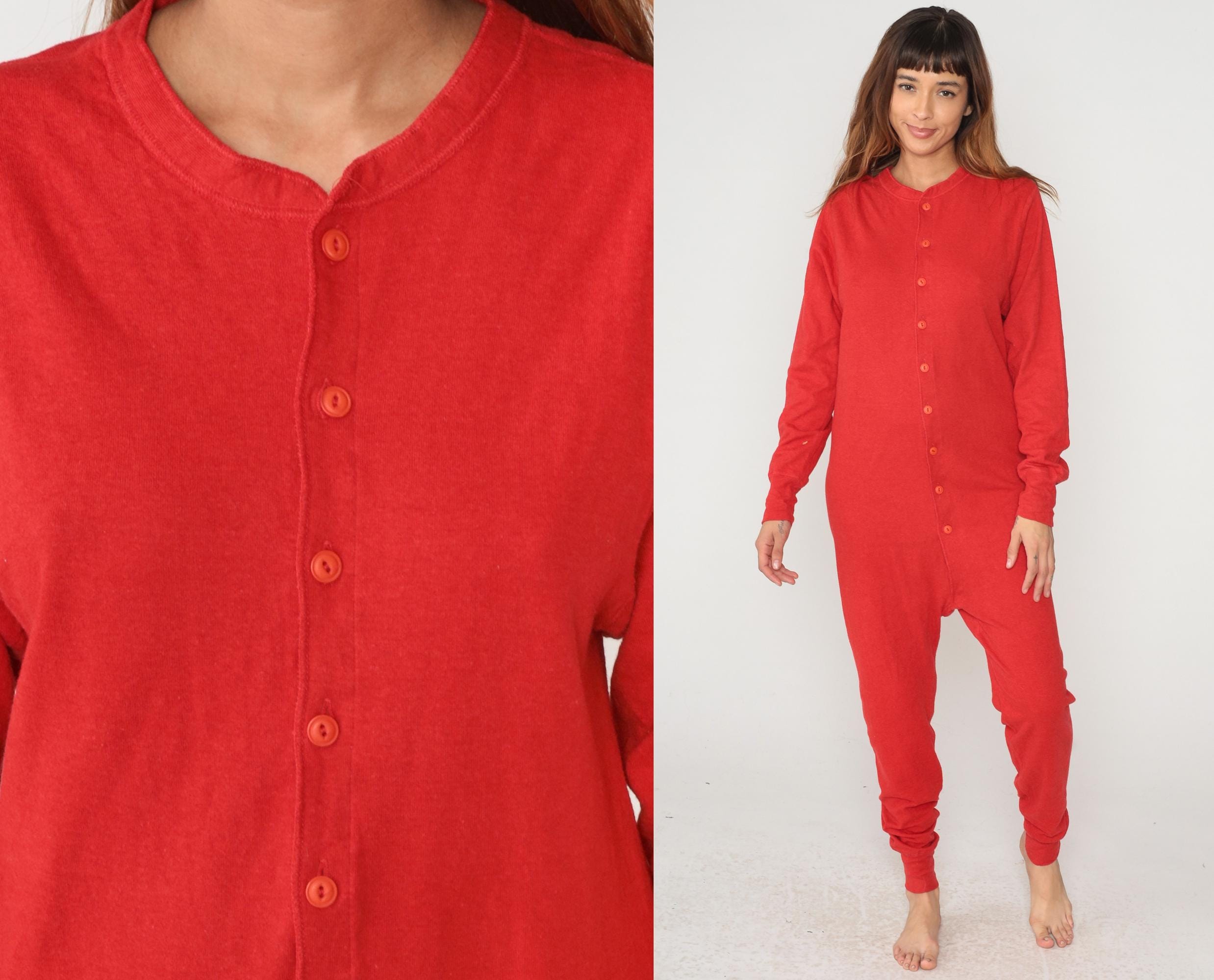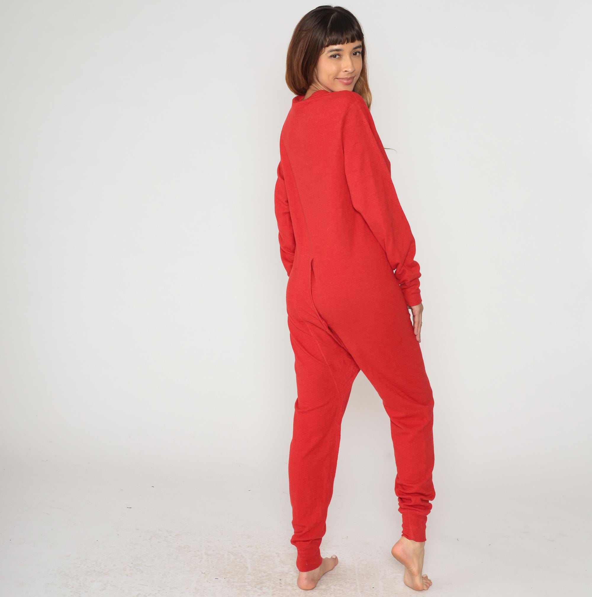 80s red union suit from ll bean with button front closure and ribbed knit construction throughout. Long sleeves and full length legs, both with ribbed cuffs, ribbed collar neckline.