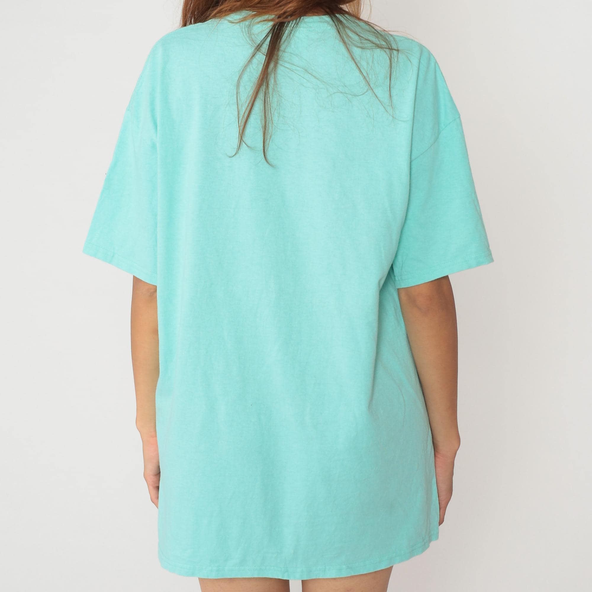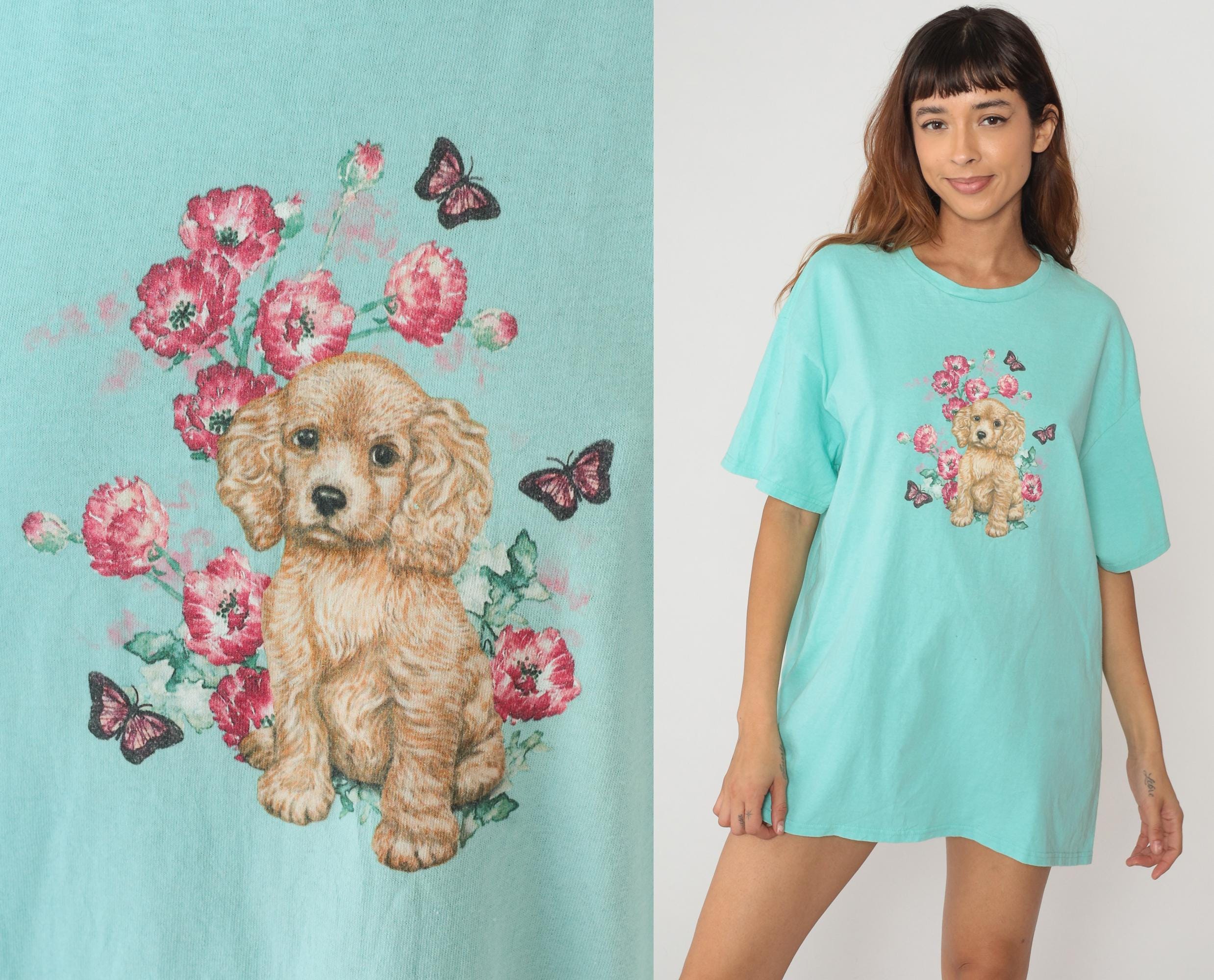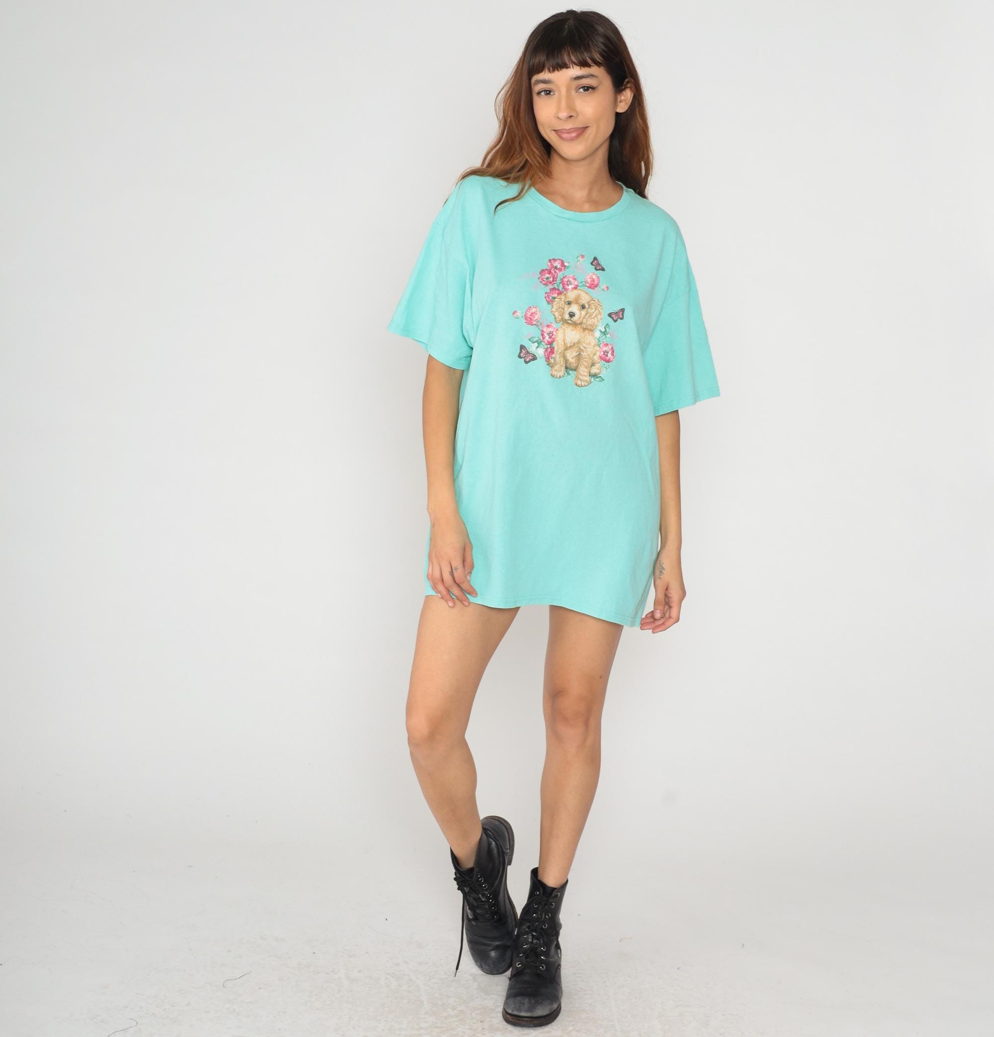 90s turquoise t-shirt dress with front graphic of a cocker spaniel puppy surrounded by pink flowers and butterflies.