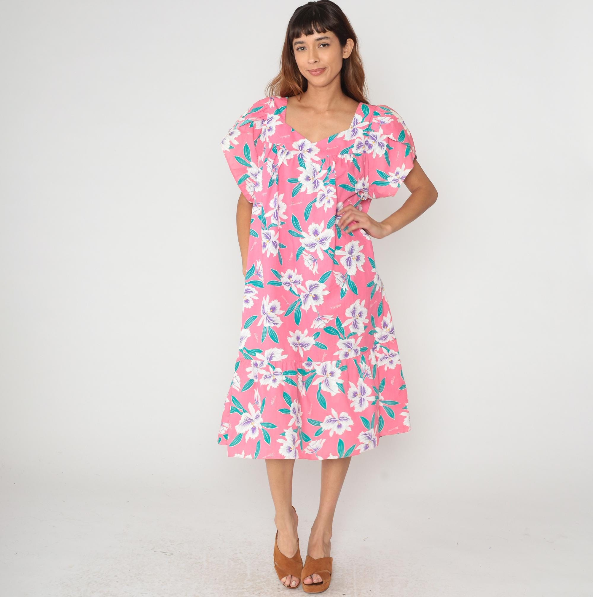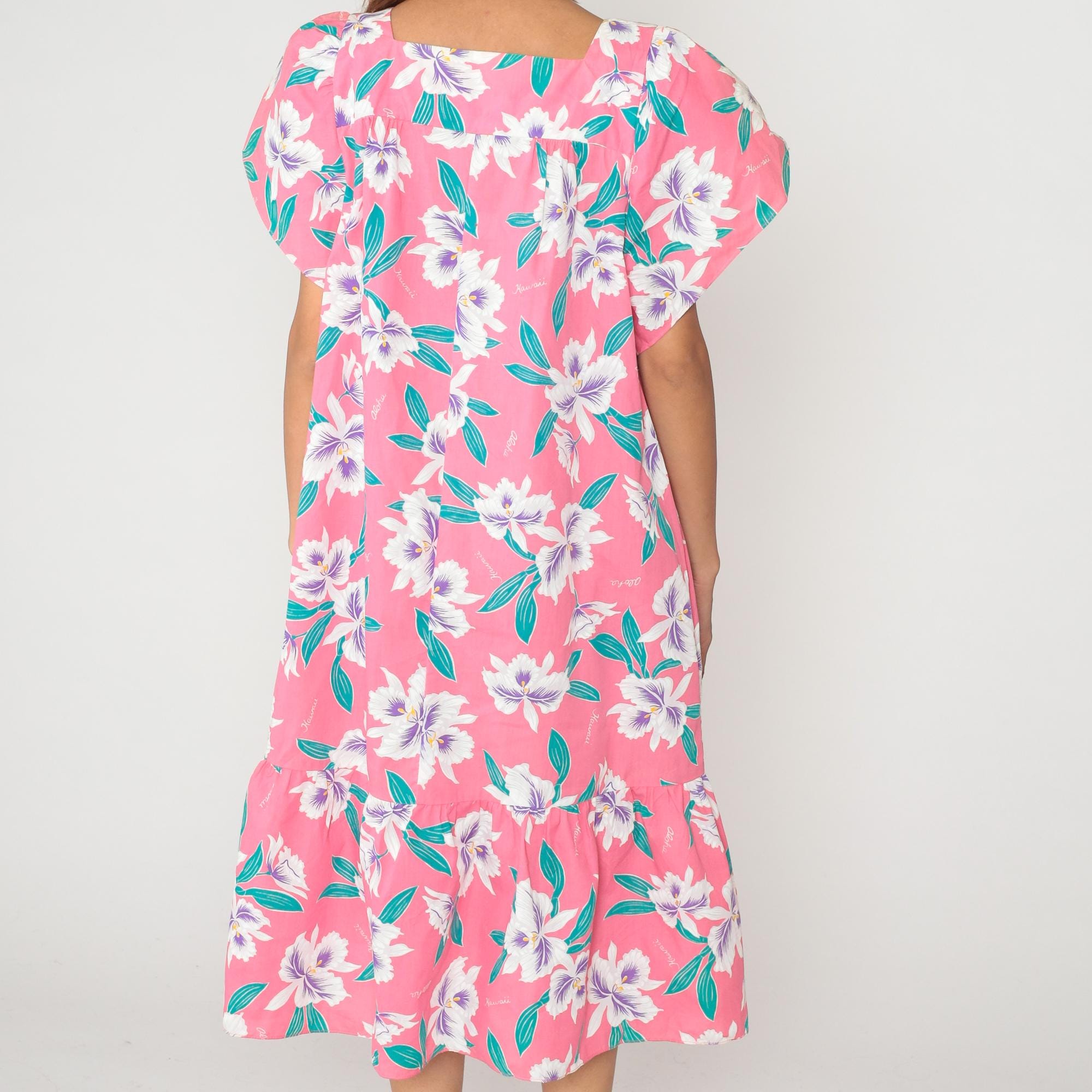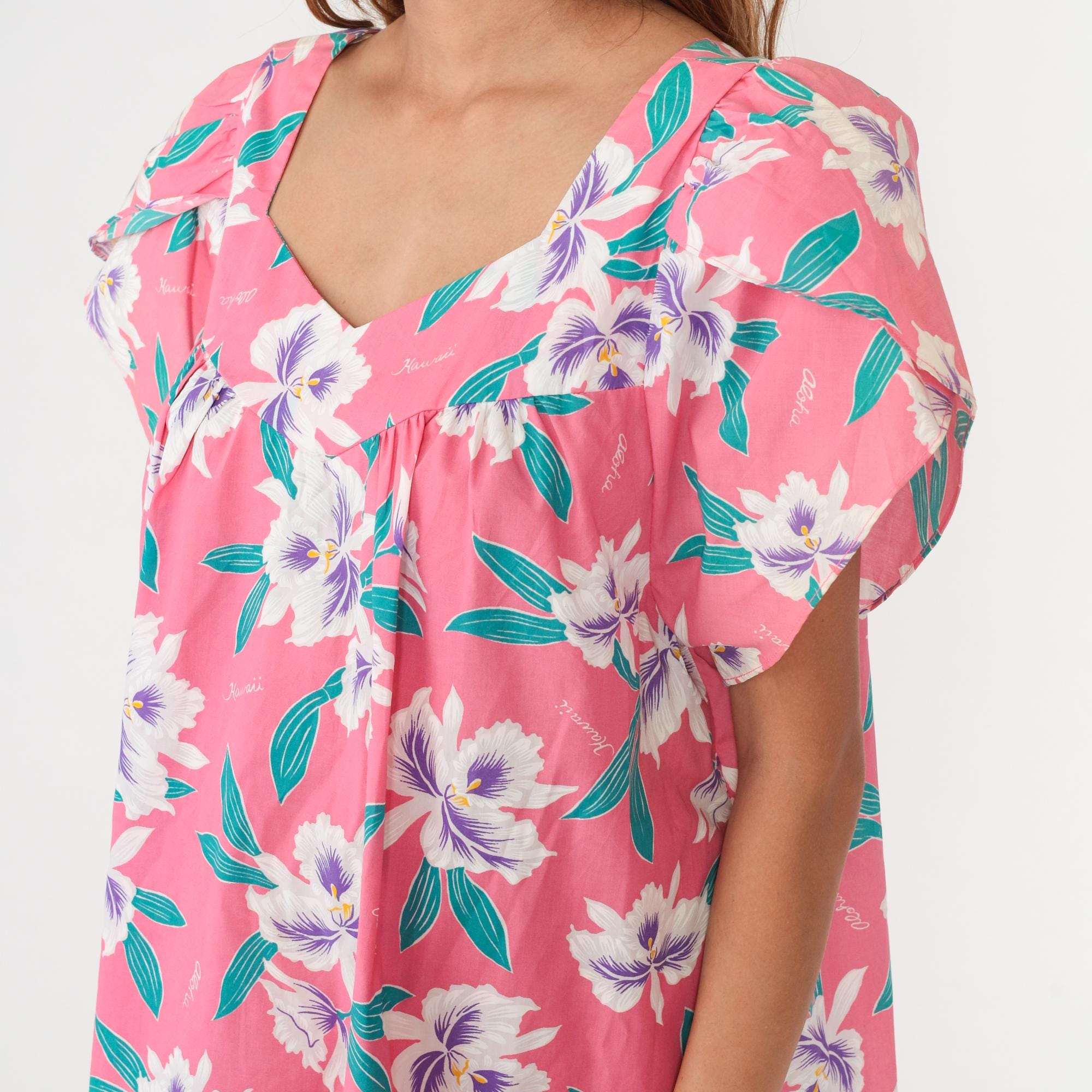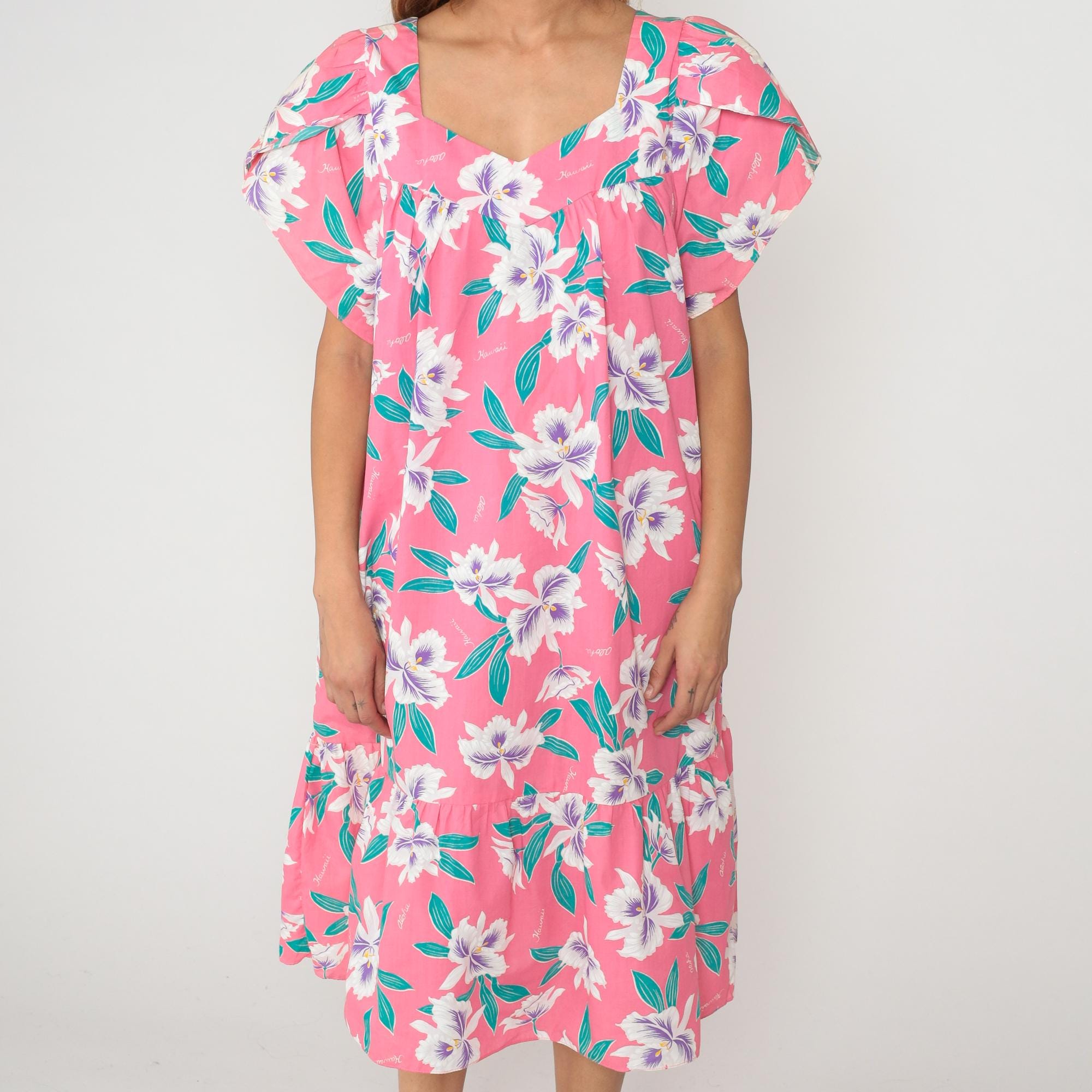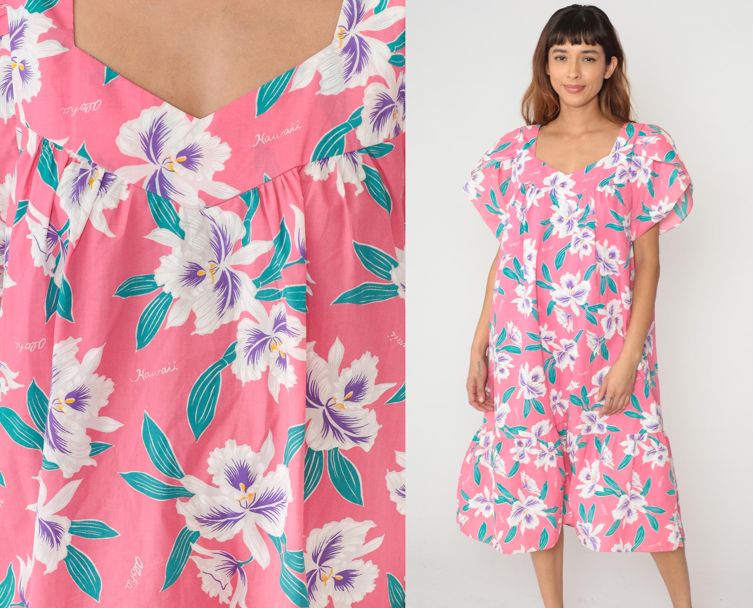 80s pink Hawaiian floral dress with white and purple hibiscus flowers across the fabric. V-neckline, short flutter sleeves, drop waist style with ruffle hem at knee length. Teal green leaves throughout the print. 65% polyester 35% cotton. Tagged size 2XL.