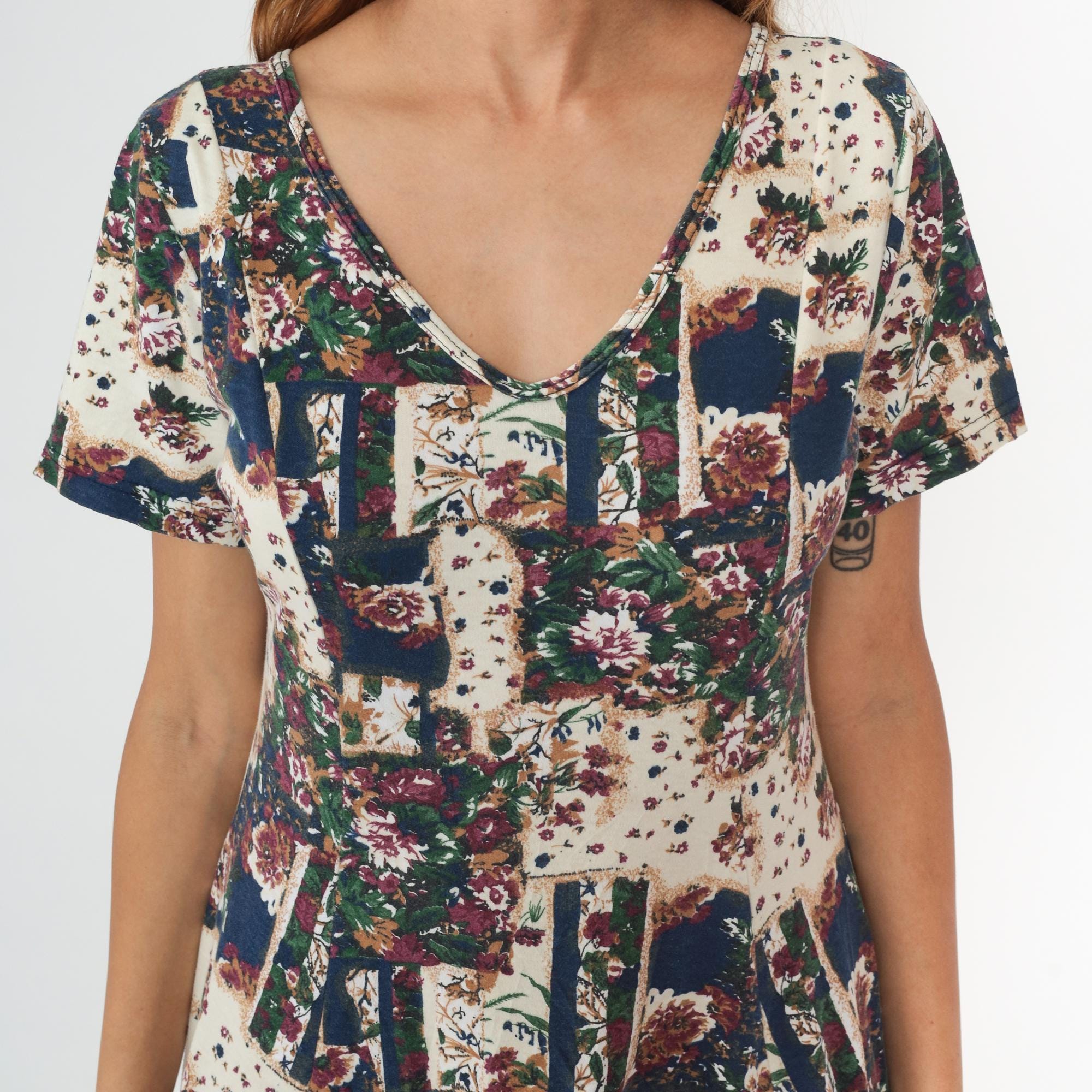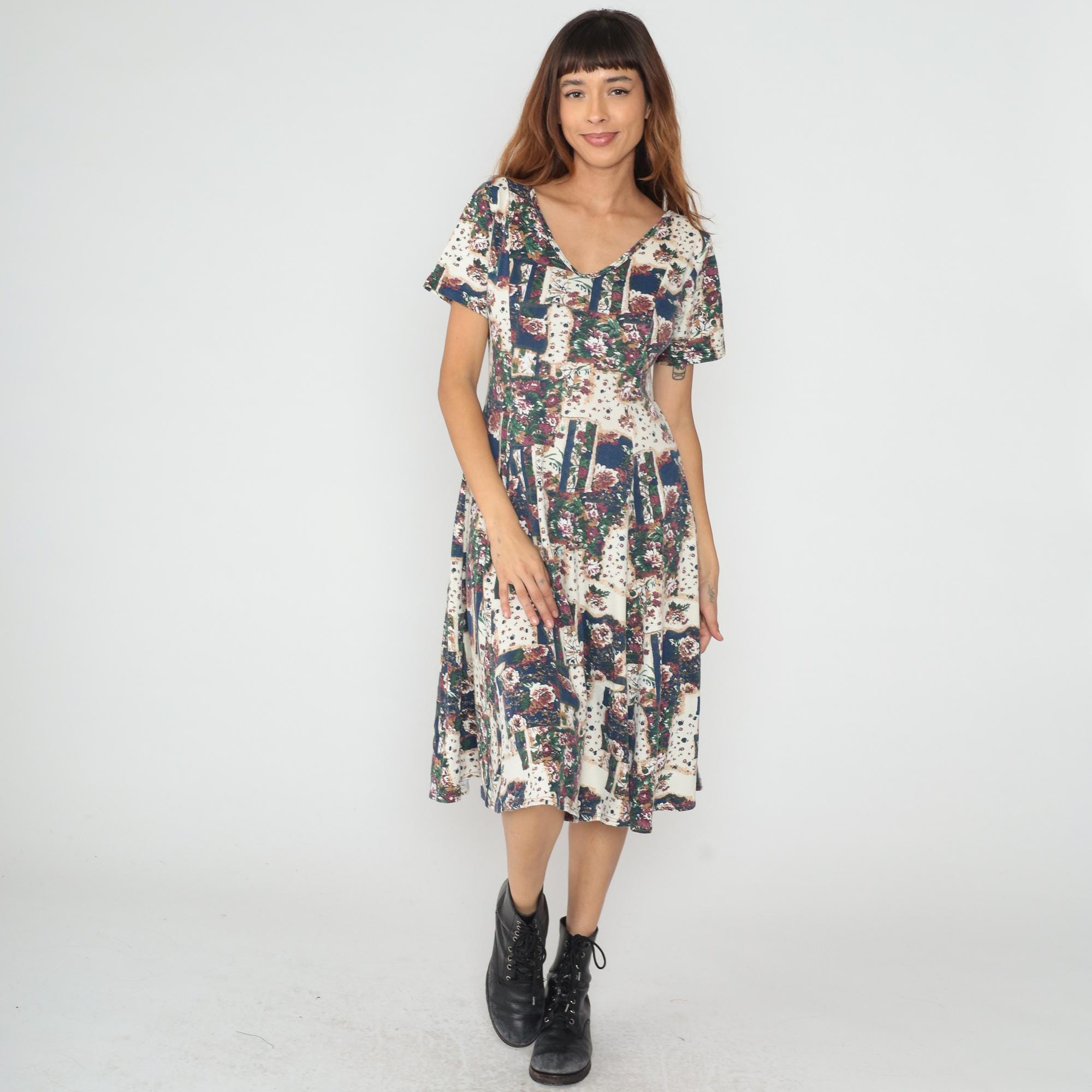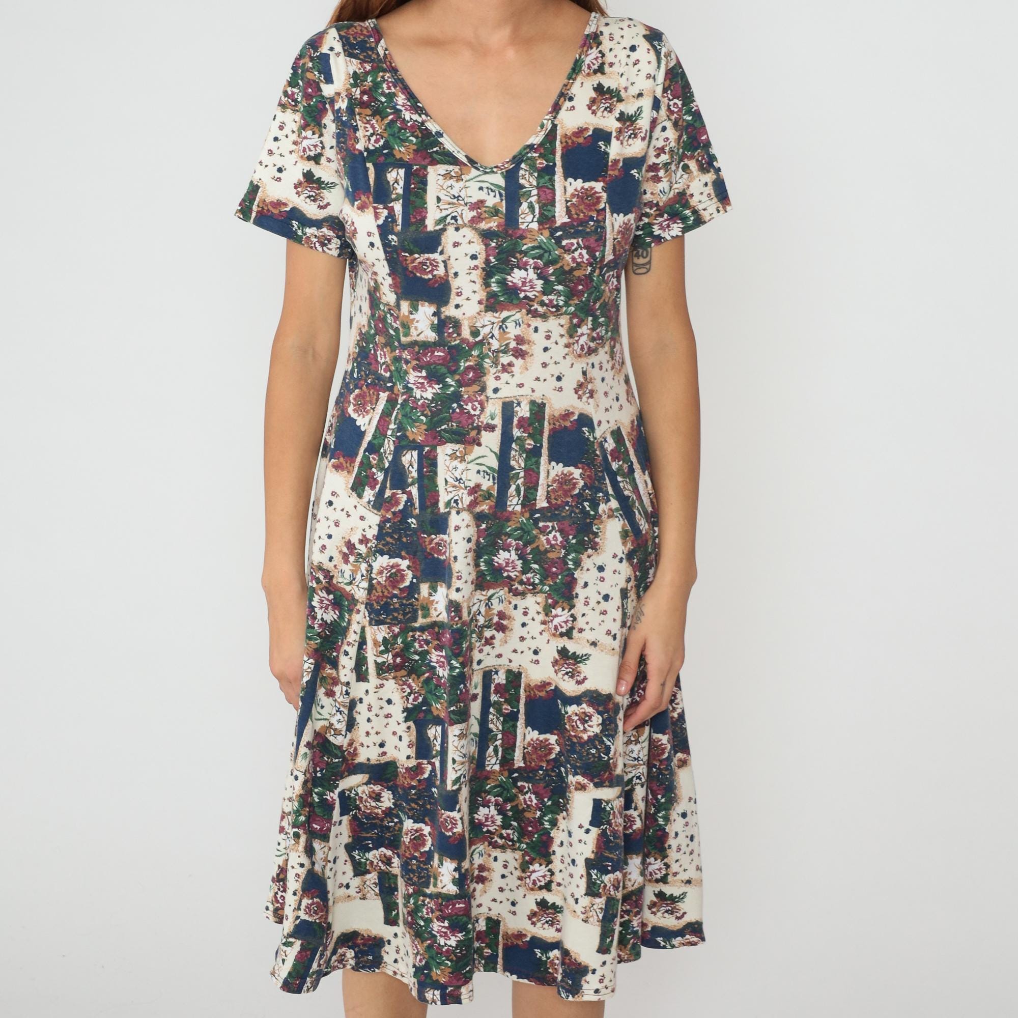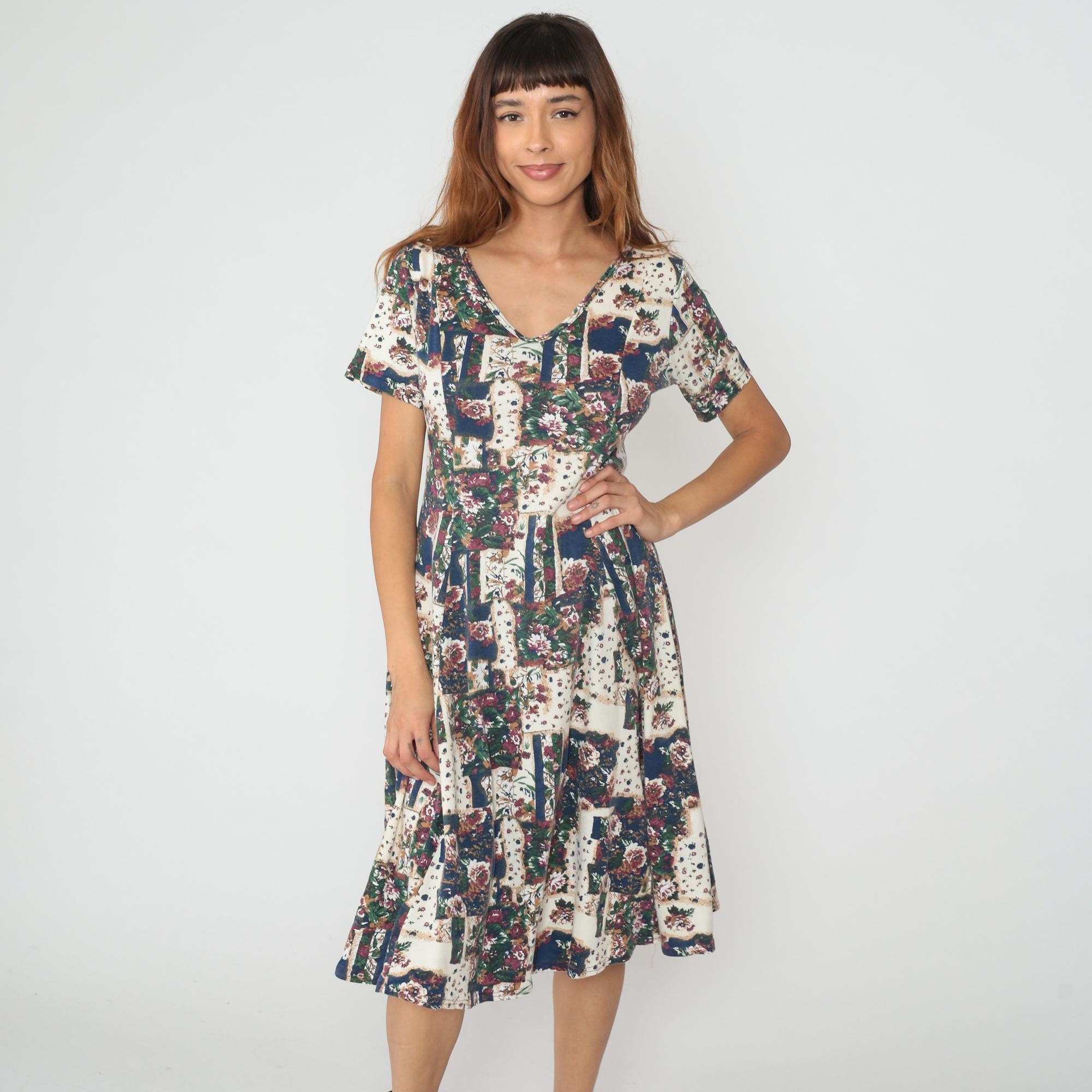 90s patchwork floral dress in cream, navy, burgundy, and green with multiple coordinating floral prints pieced together in blocks across the fabric. V-neckline with button detail, short sleeves, empire waist with gathered skirt falling to knee length. Tagged size Medium.