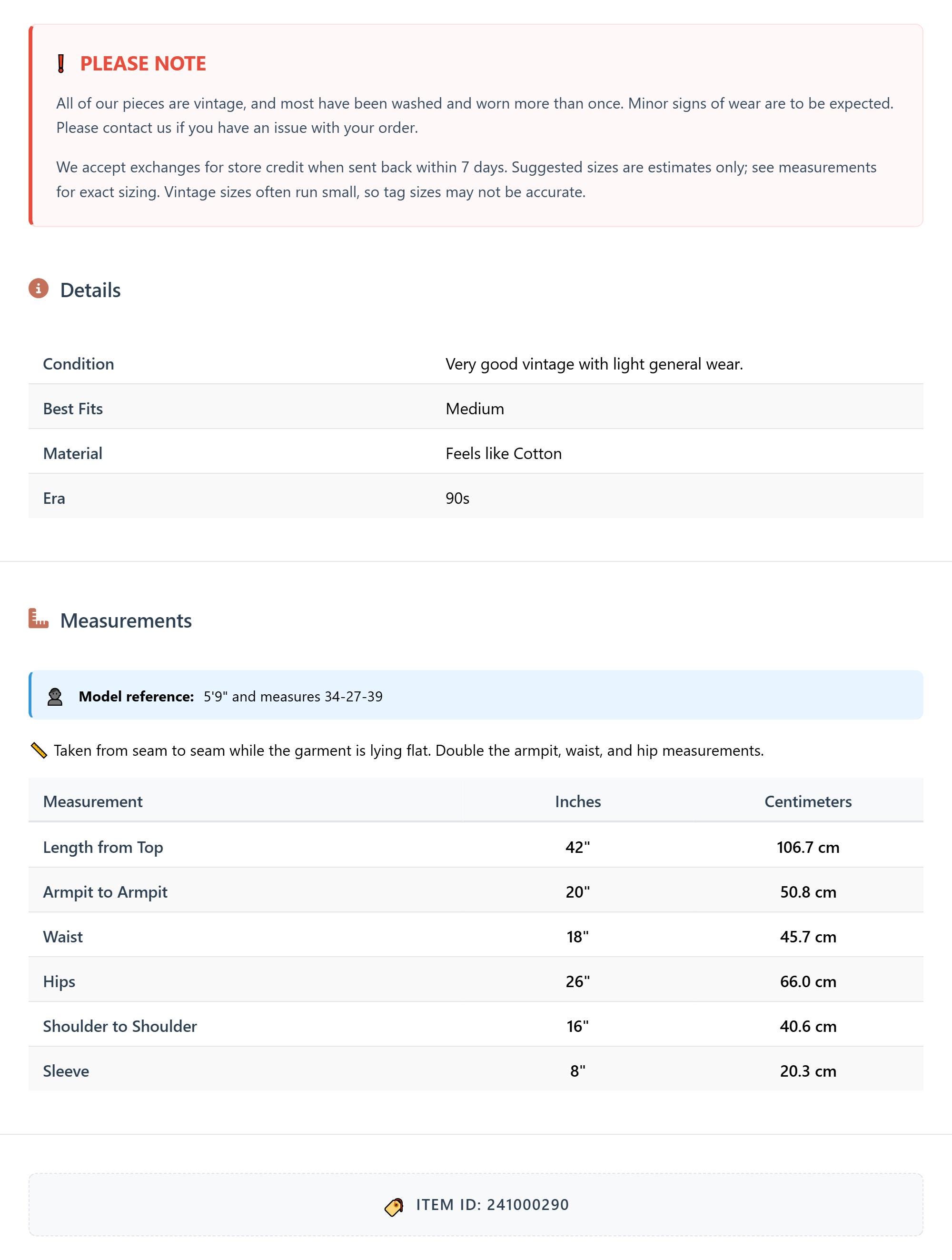 All of our pieces are vintage, and most have been washed and worn more than once. Minor signs of wear are to be expected. Please contact us if you have an issue with your order. We accept exchanges for store credit when sent back within 7 days.