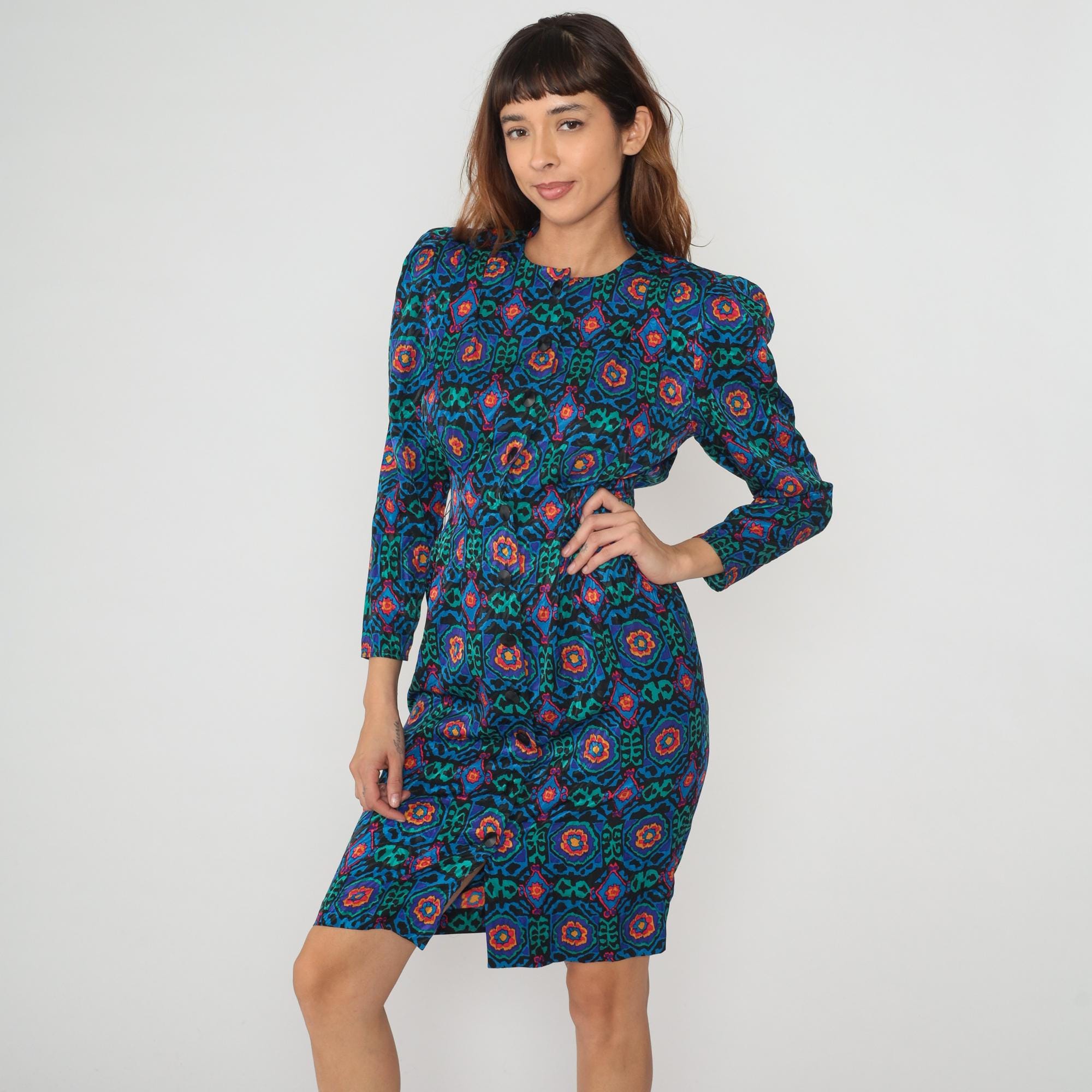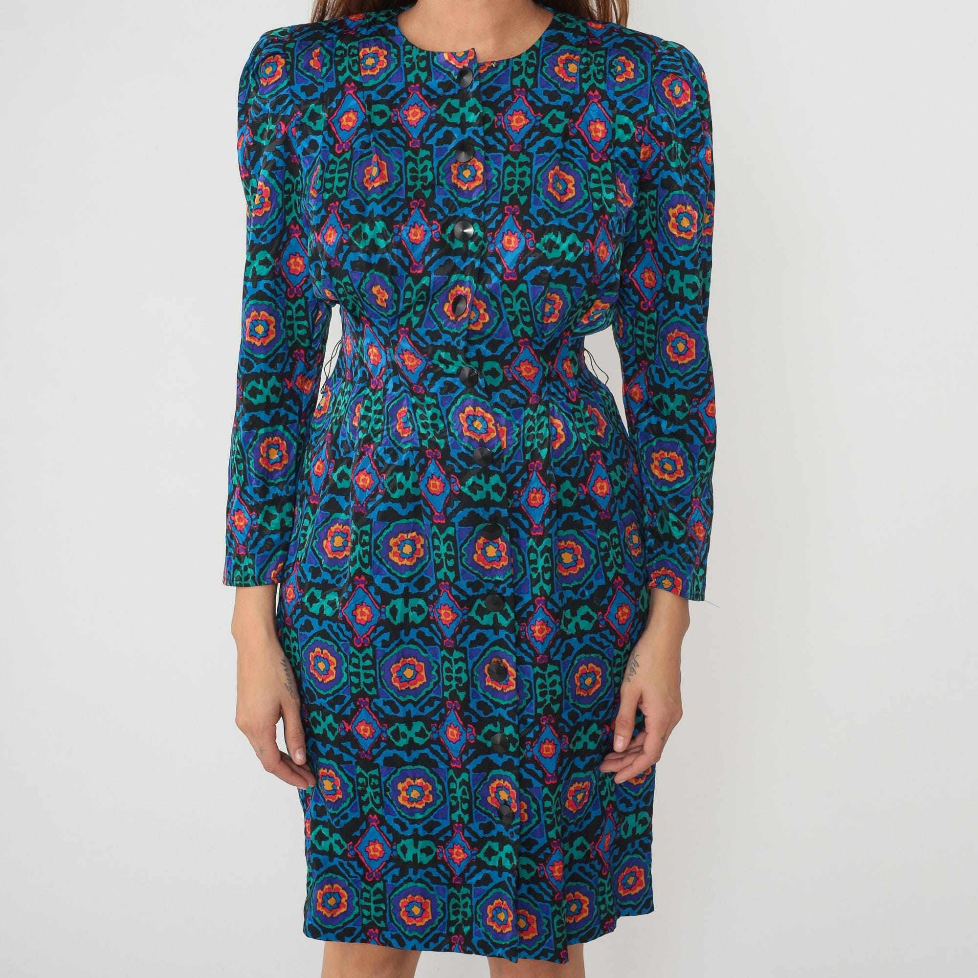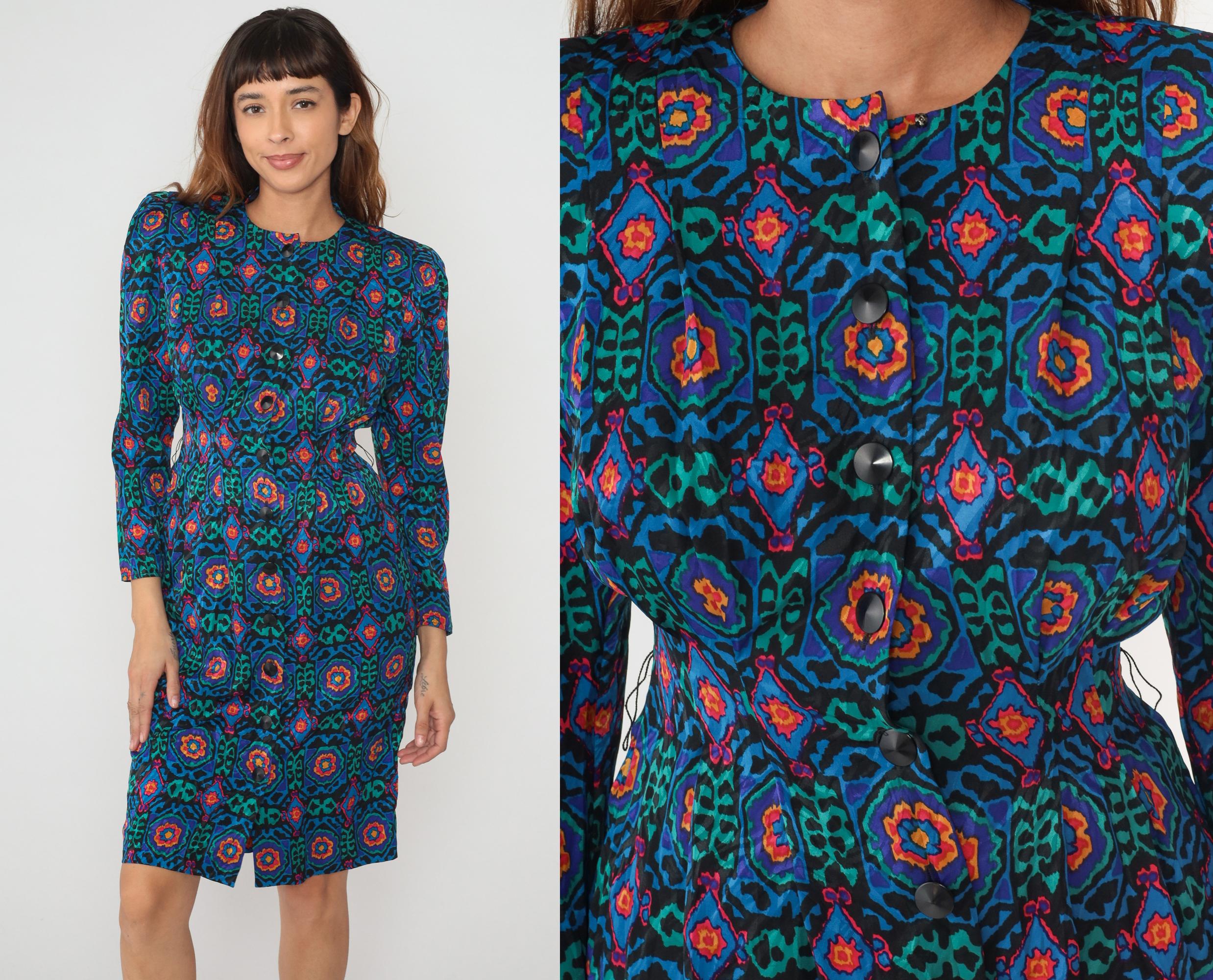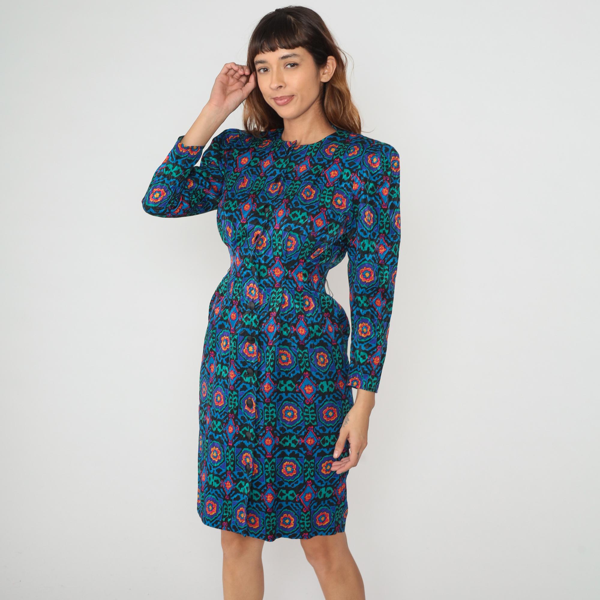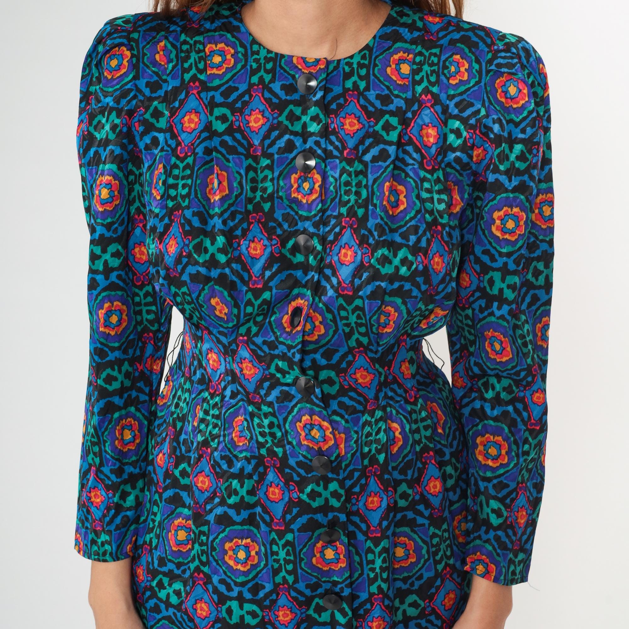 80s geometric print dress from Papell Petites with abstract medallion pattern in teal, blue, green, pink, orange, and yellow on black background. Round neckline, long sleeves, button front closure with dark buttons.