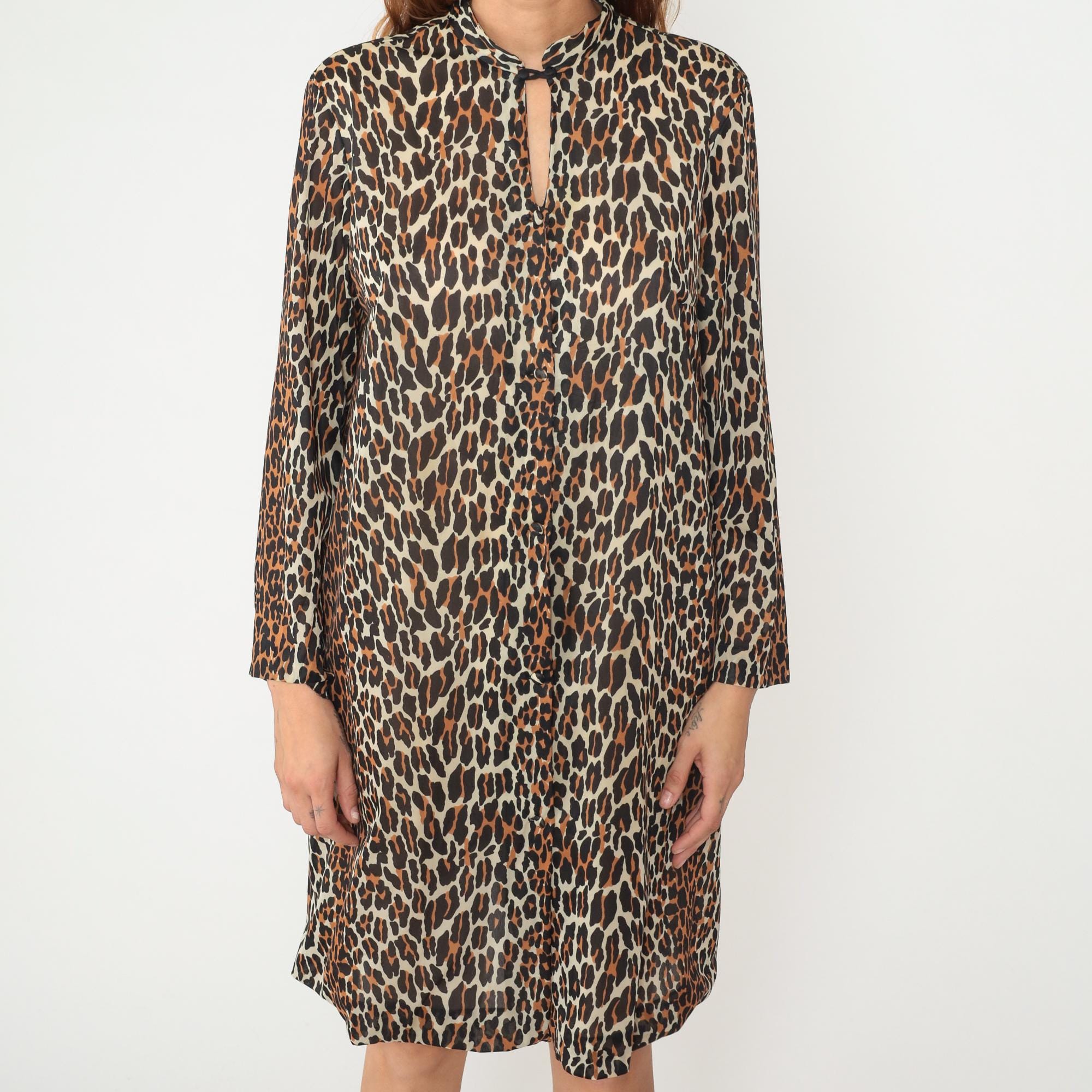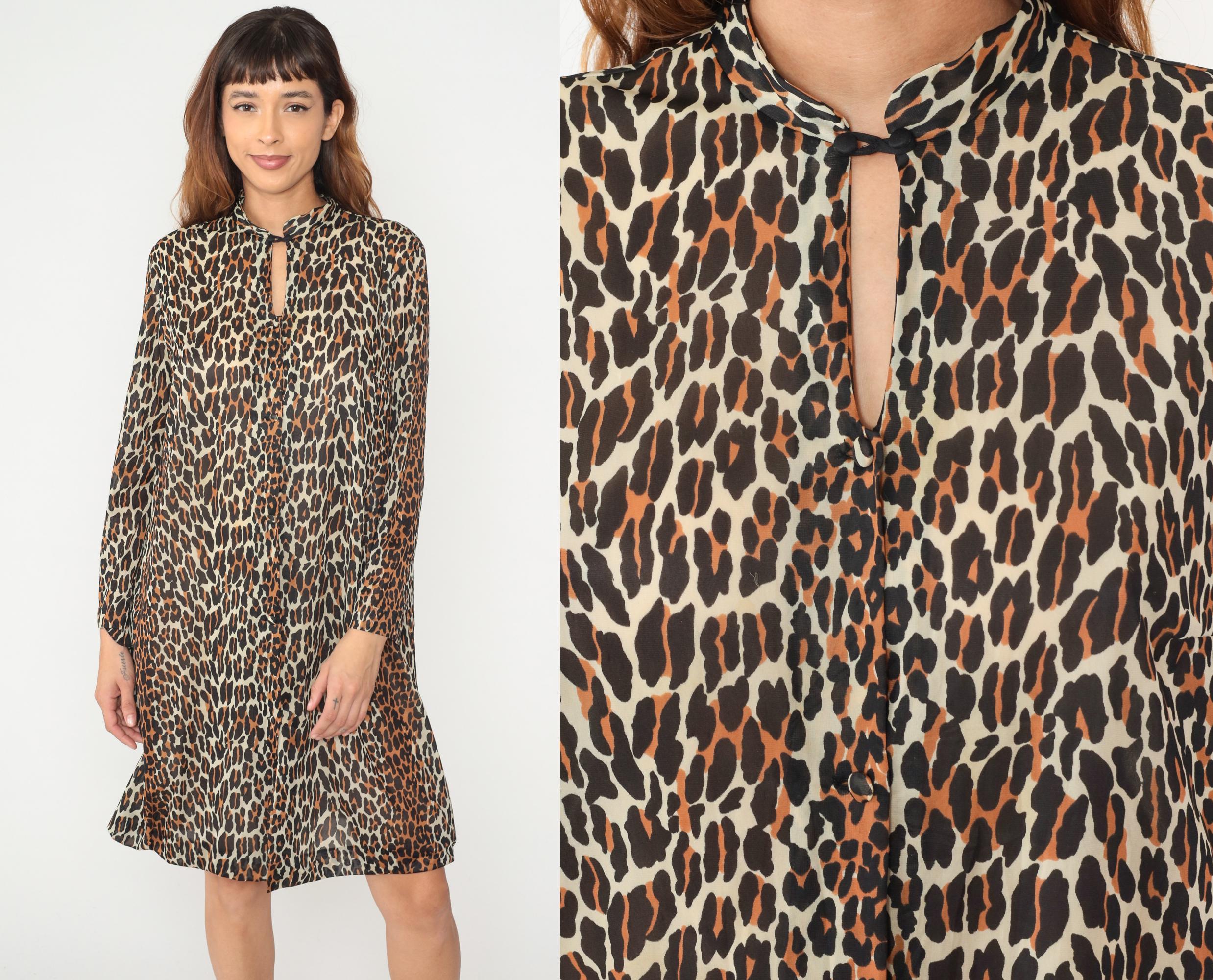 70s leopard print shift dress with mock neck collar, keyhole cutout at front neckline with tie closure. Long sleeves, straight shift silhouette falling to knee length. Brown, tan, and black animal print across fabric.