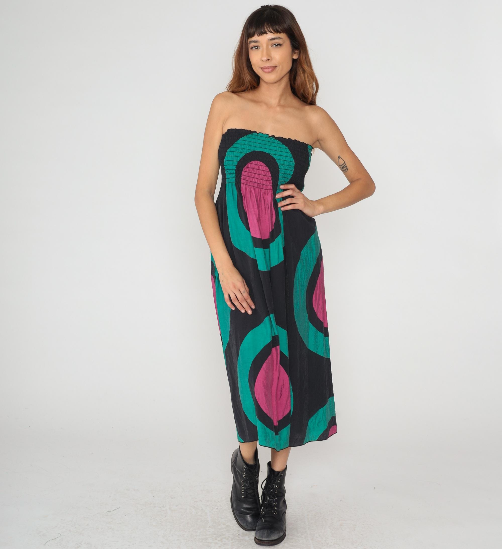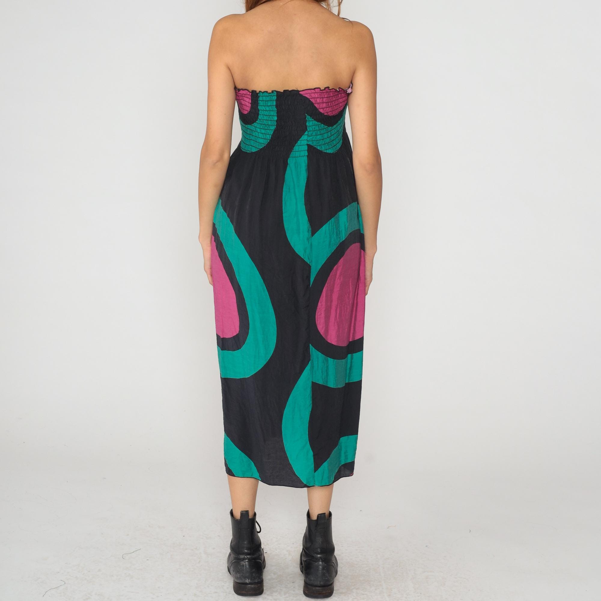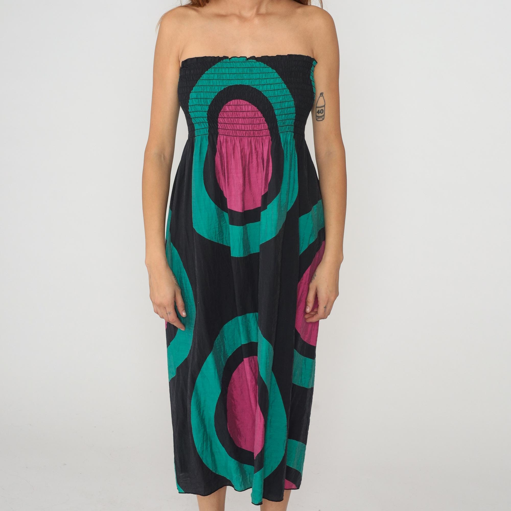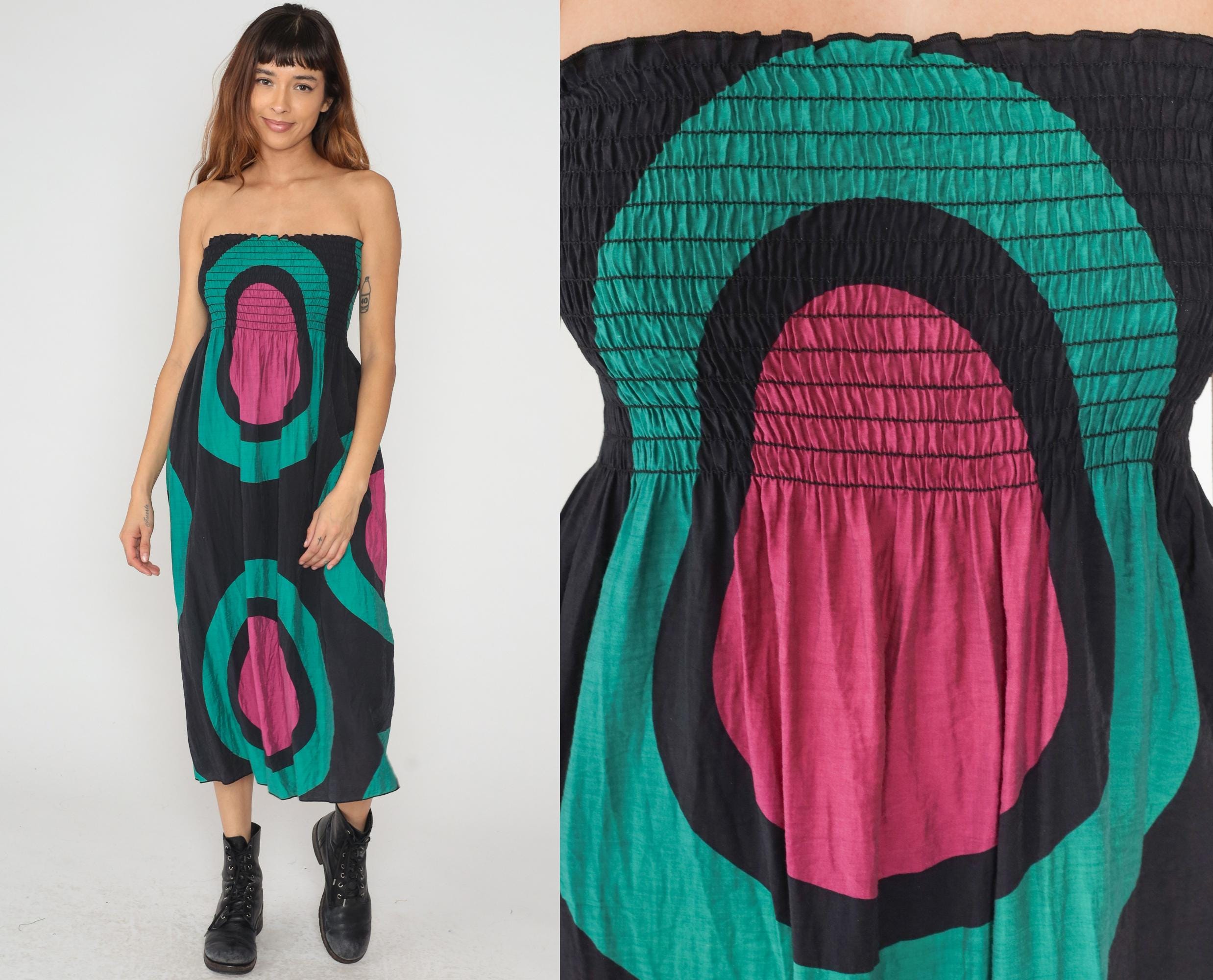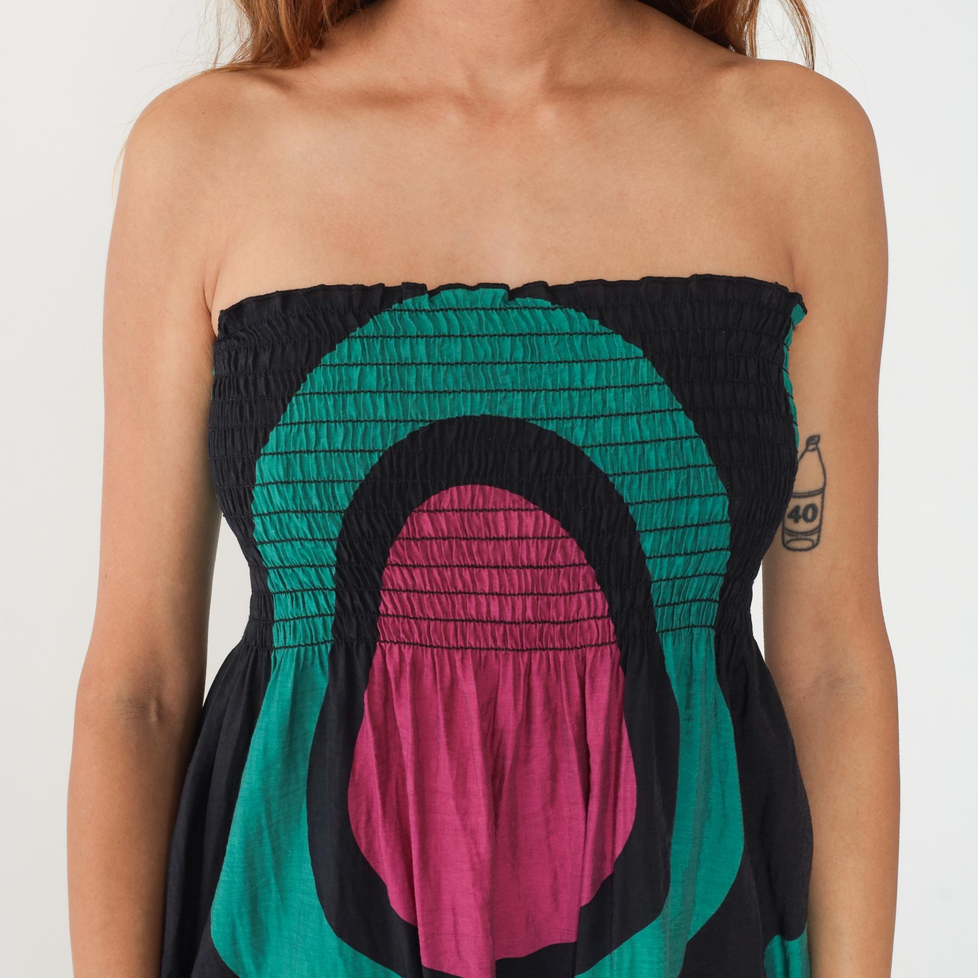 Y2K strapless dress from Hot and Delicious with smocked elastic bodice and bold geometric pattern of concentric ovals in black, turquoise, and magenta. Below-knee length with straight silhouette.