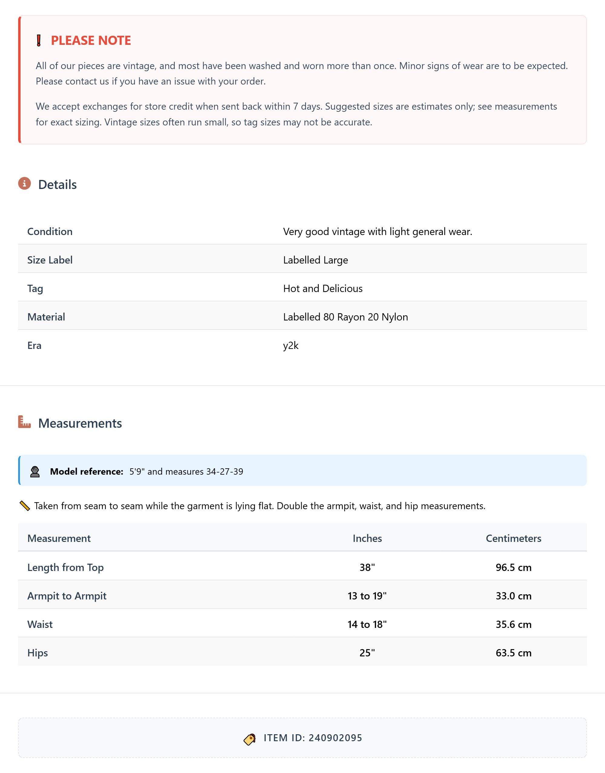 All of our pieces are vintage, and most have been washed and worn more than once. Minor signs of wear are to be expected. Please contact us if you have an issue with your order. We accept exchanges for store credit when sent back within 7 days.