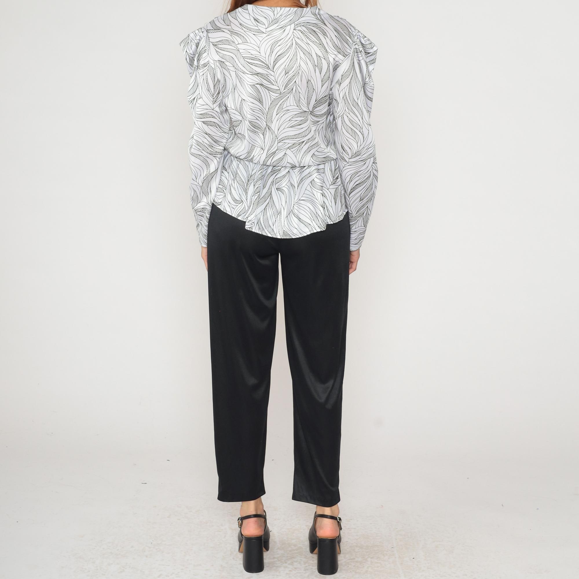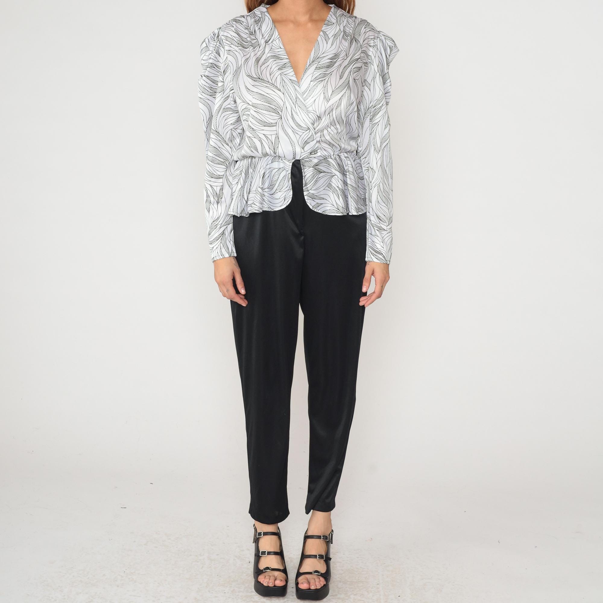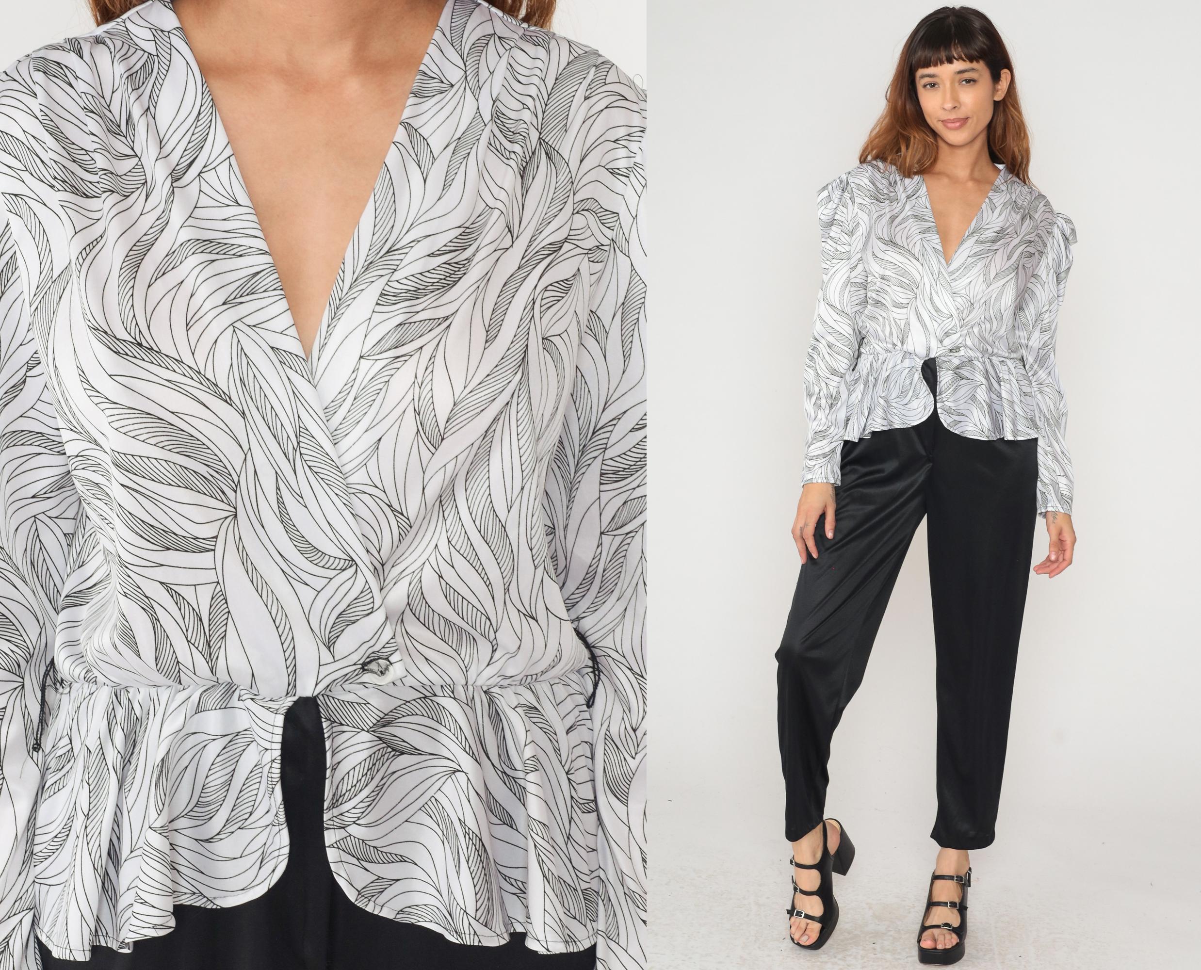 80s white and black wave print peplum blouse with structured shoulder pads and V-neck collar. Long sleeves, single button front closure, gathered waist with flared peplum hem.
