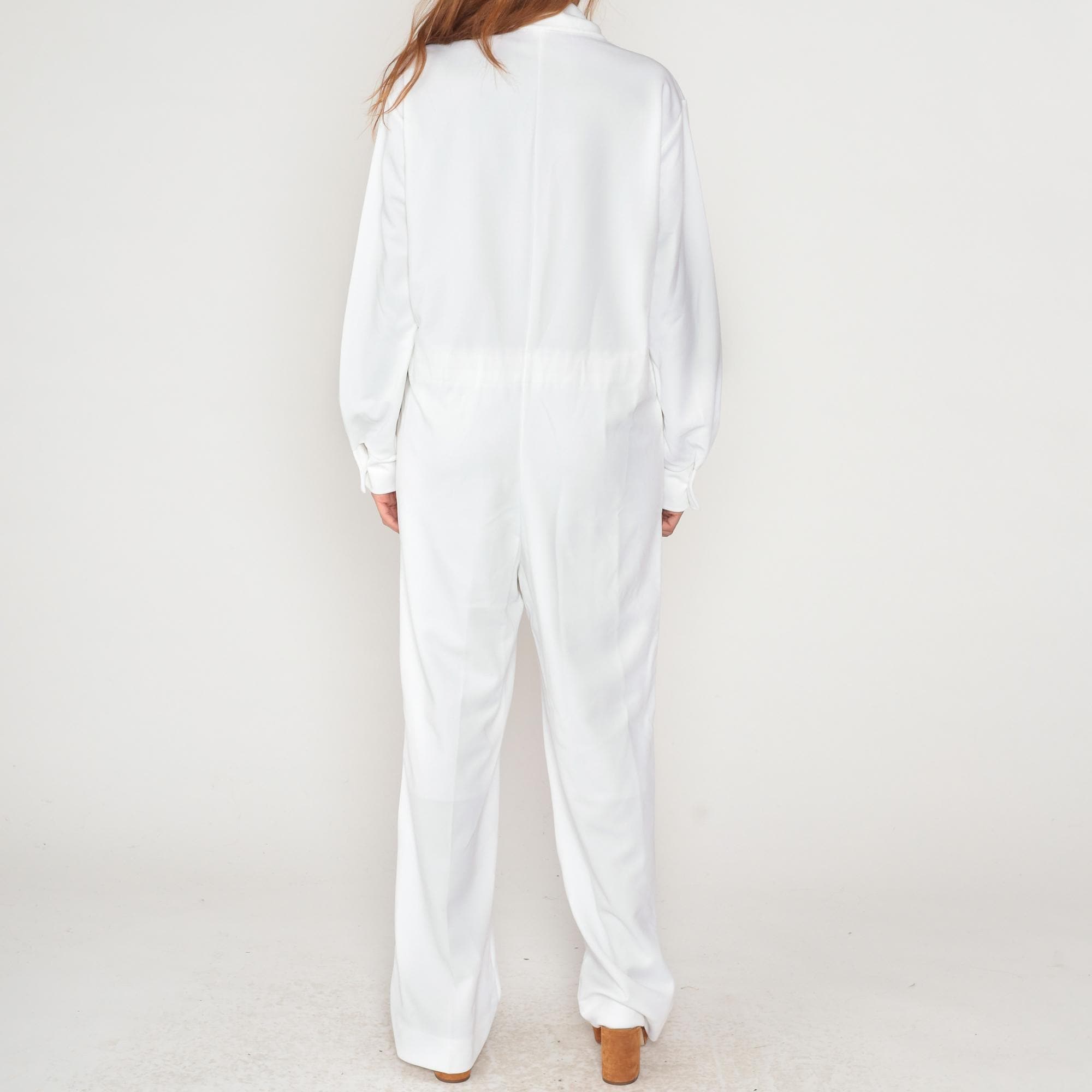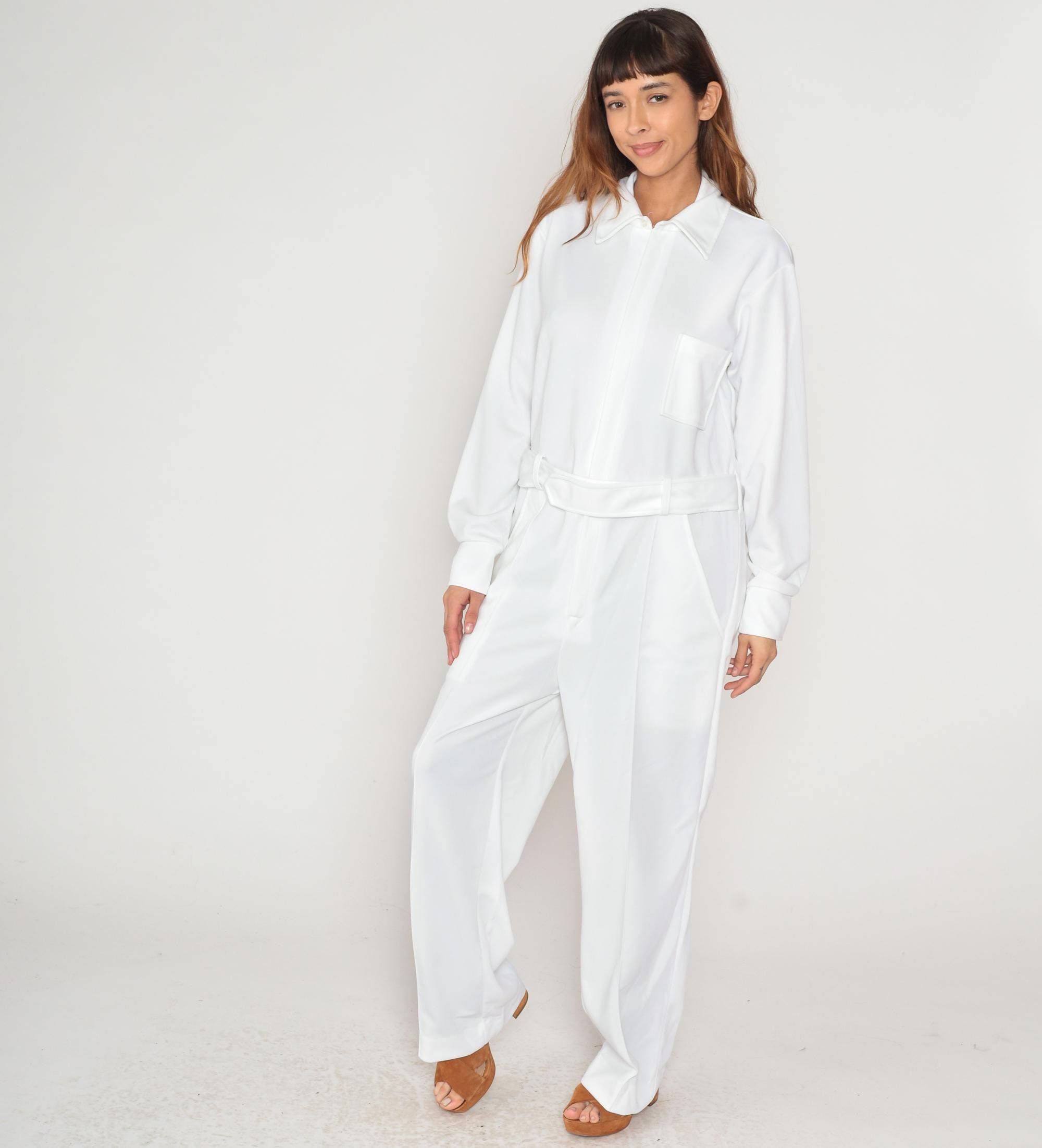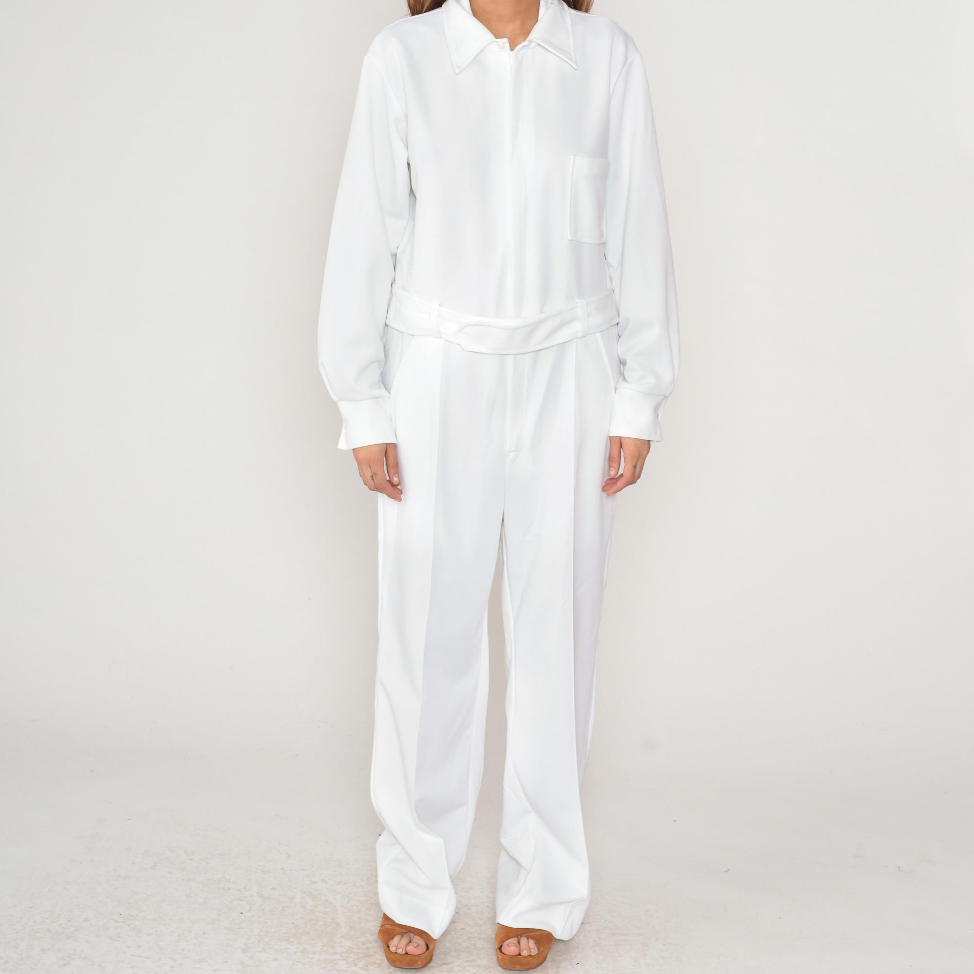 70s white collared jumpsuit with shirt-style button front upper and attached straight leg pants. Long sleeves, pointed collar, self-tie belt at natural waist.
