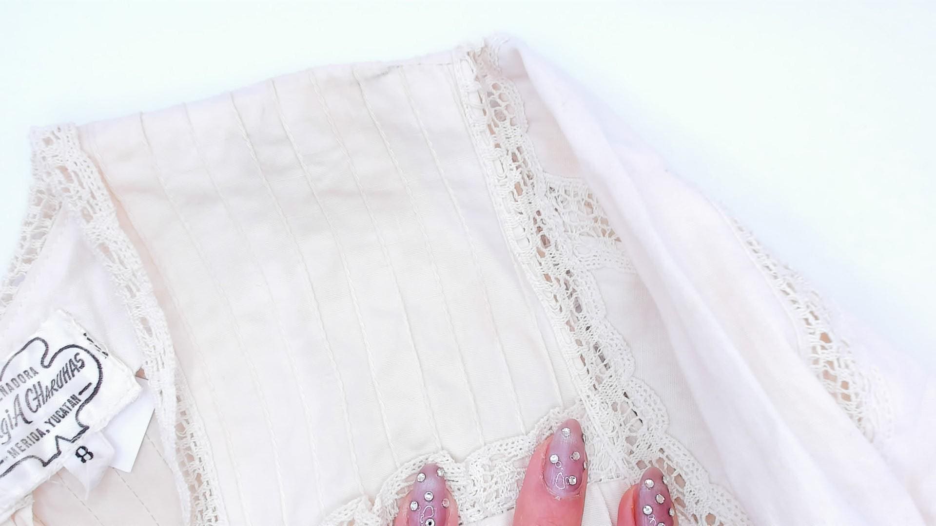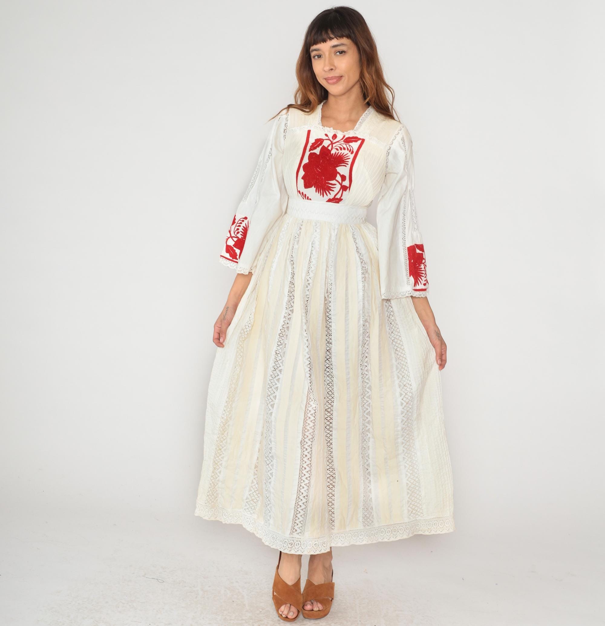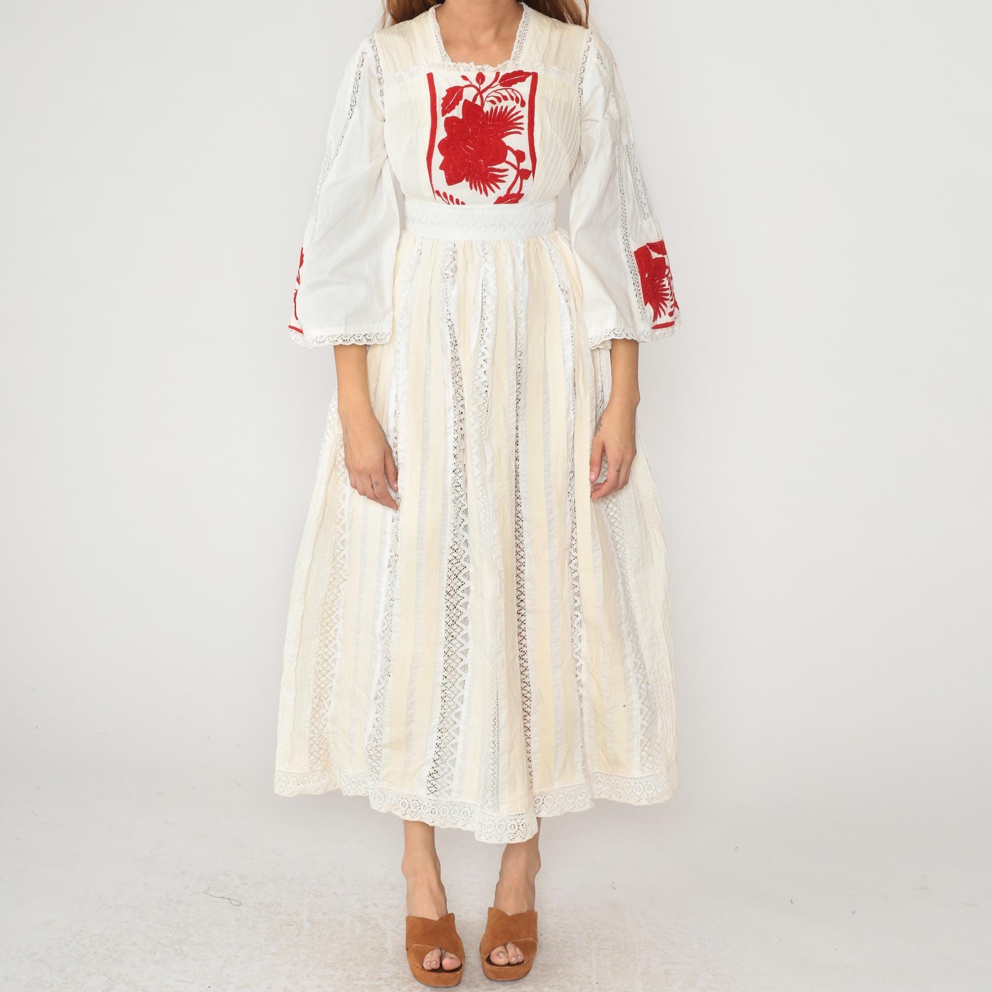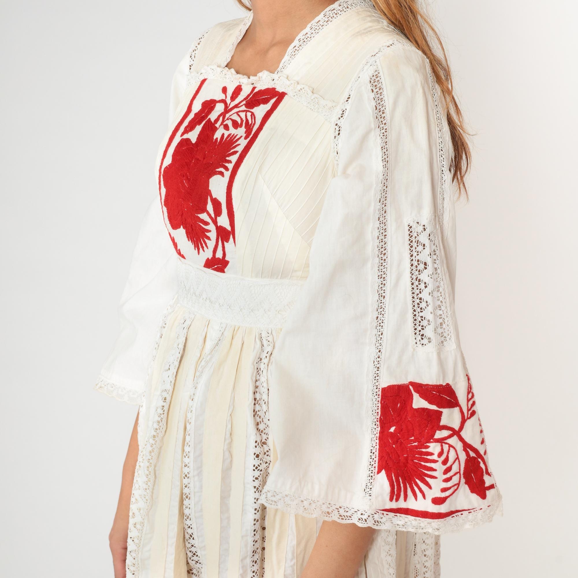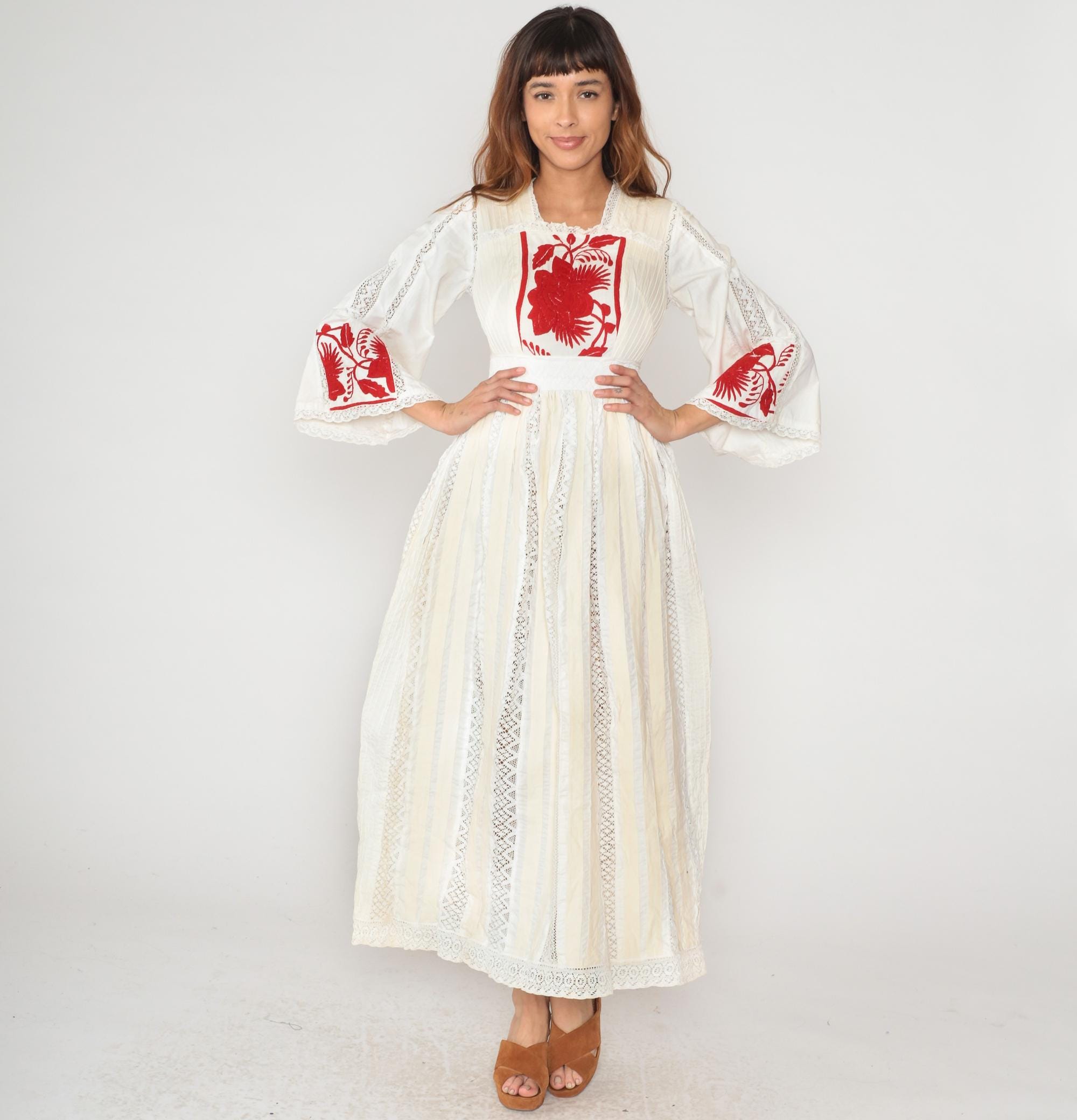 70s white maxi dress with red embroidered floral designs on chest bib and bell sleeve cuffs. Square neckline with lace trim, pintucked bodice with empire waist, long bell sleeves with lace trim at edges. Vertical lace insertion panels throughout skirt, back zipper closure.