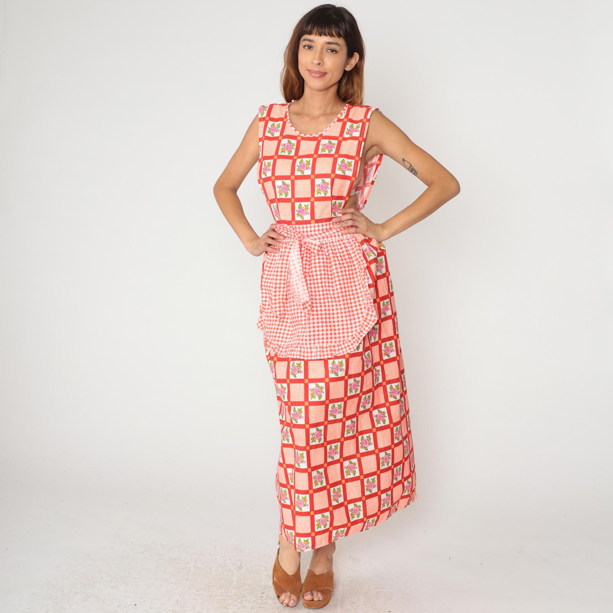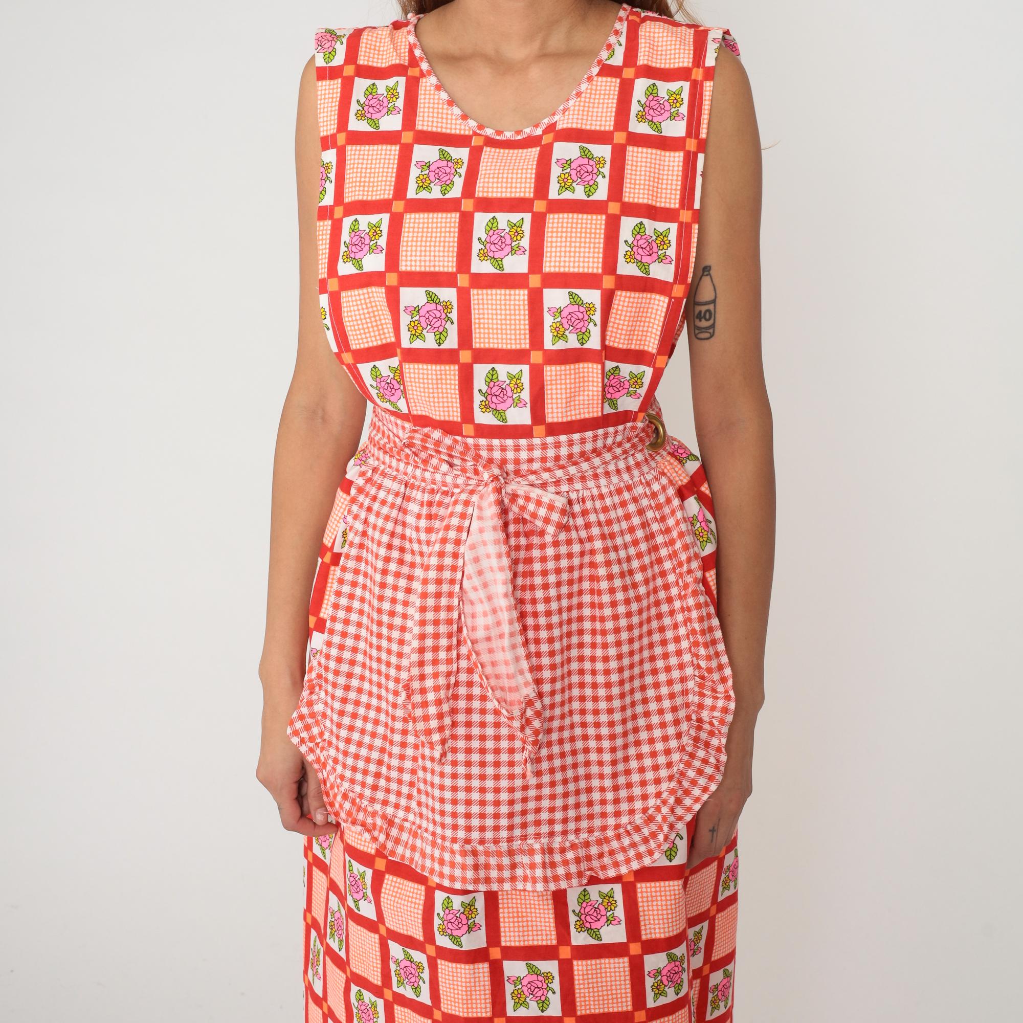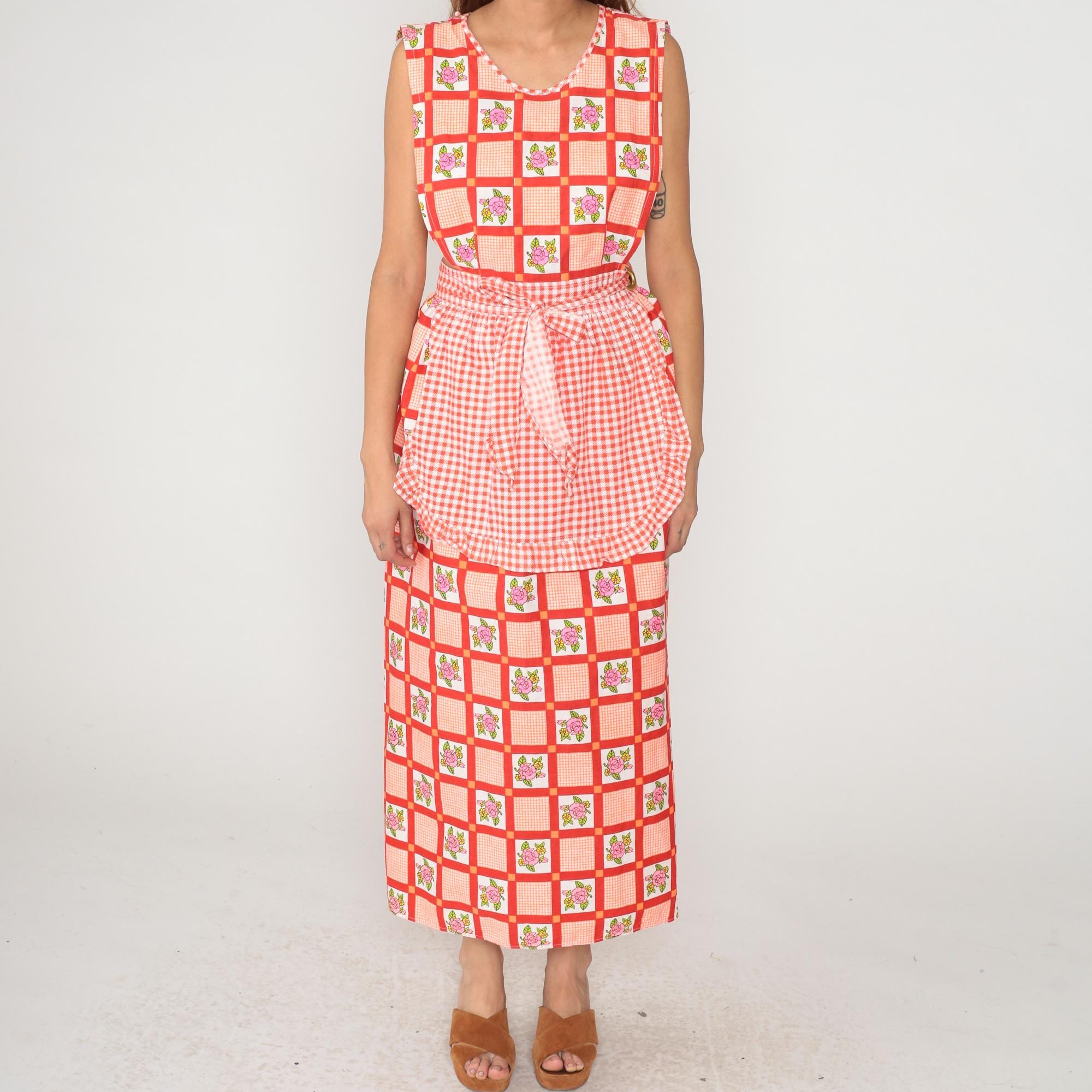 70s red and white maxi dress from Design House with checkered and floral patchwork print. Sleeveless bodice features alternating squares of red gingham checks and pink rose floral print with white backgrounds, red gingham trim at neckline and armholes. Open back with tie closure at neck, attached red and white gingham checked pinafore apron overlay at waist with bow details and side pockets.