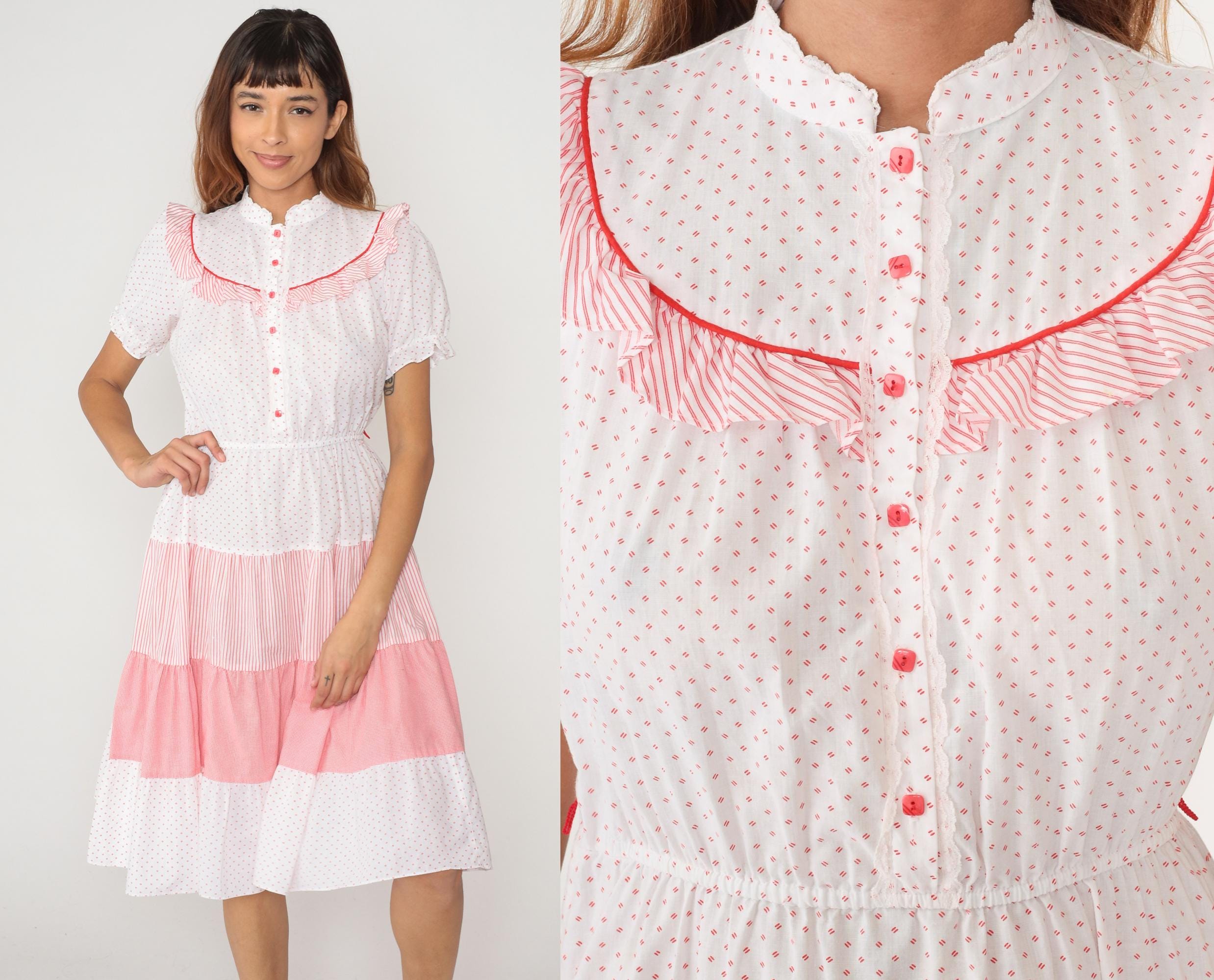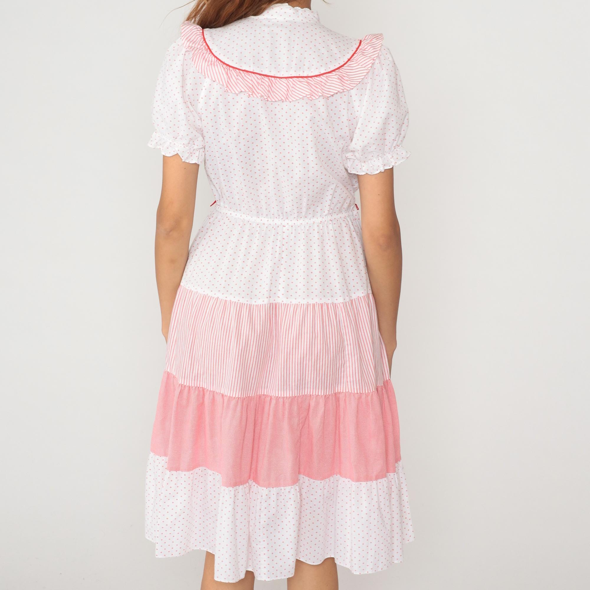 80s white and pink polka dot midi dress from DBA La with ruffled peter pan collar trimmed in pink striped fabric and button front closure with pink buttons. Short puff sleeves, tiered skirt with alternating panels of pink striped fabric and white polka dot fabric in graduating shades of pink from pale to coral.