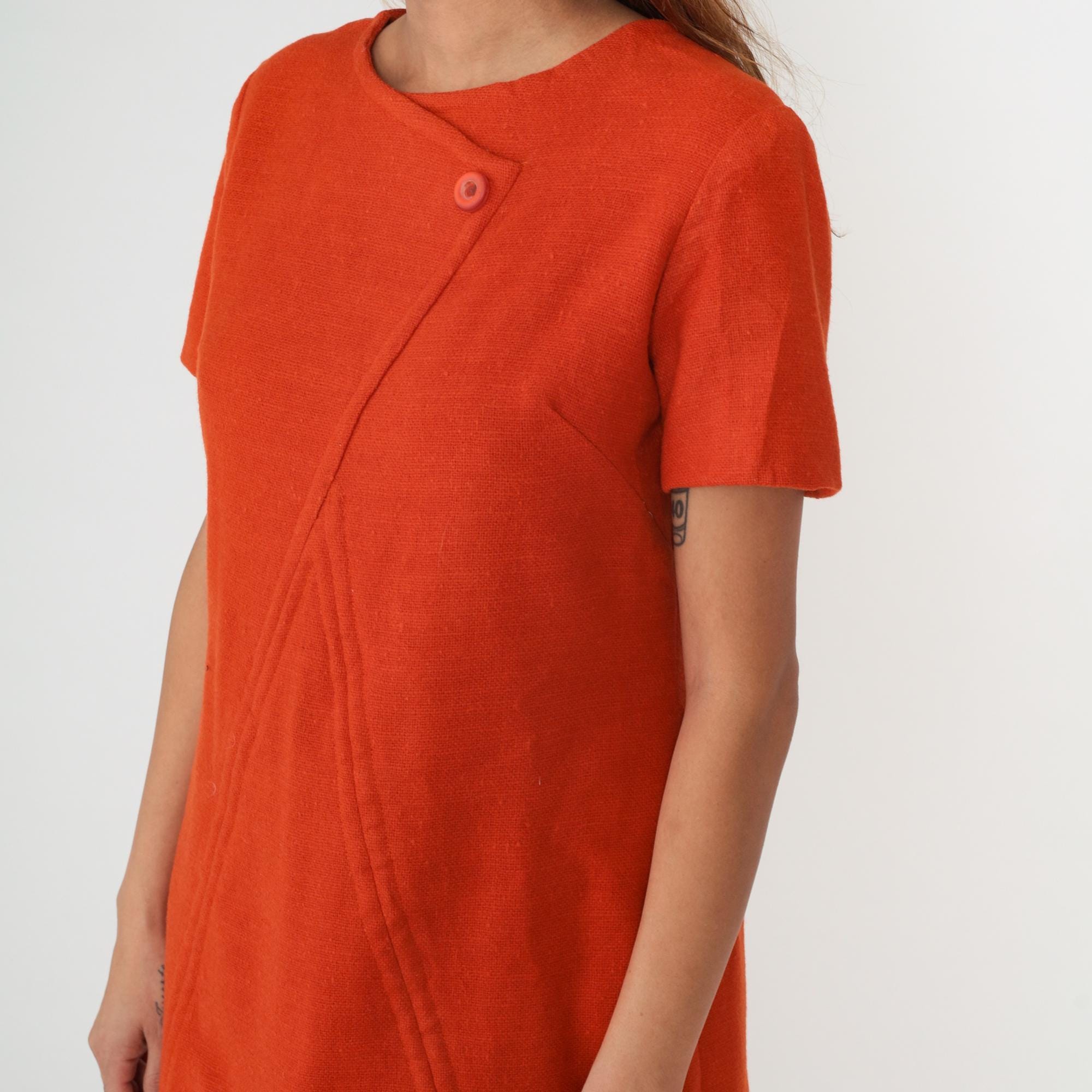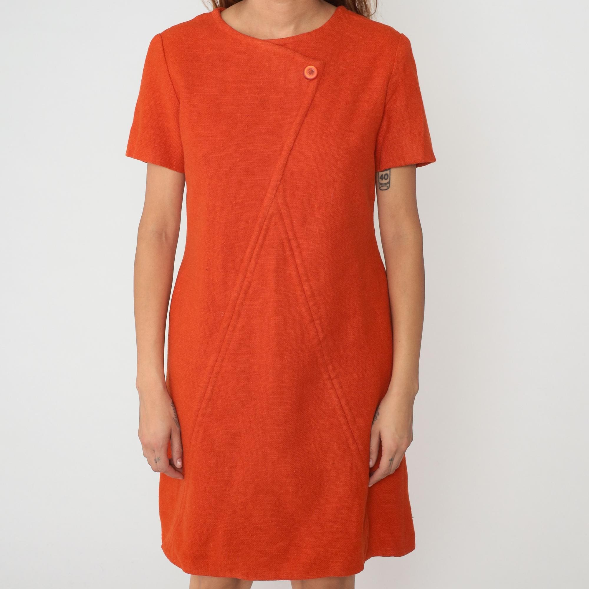 60s orange shift dress with diagonal seam detailing creating angular panels across the front bodice. Round neckline with single decorative button detail, short sleeves, back zipper closure. Knee length with straight silhouette.
