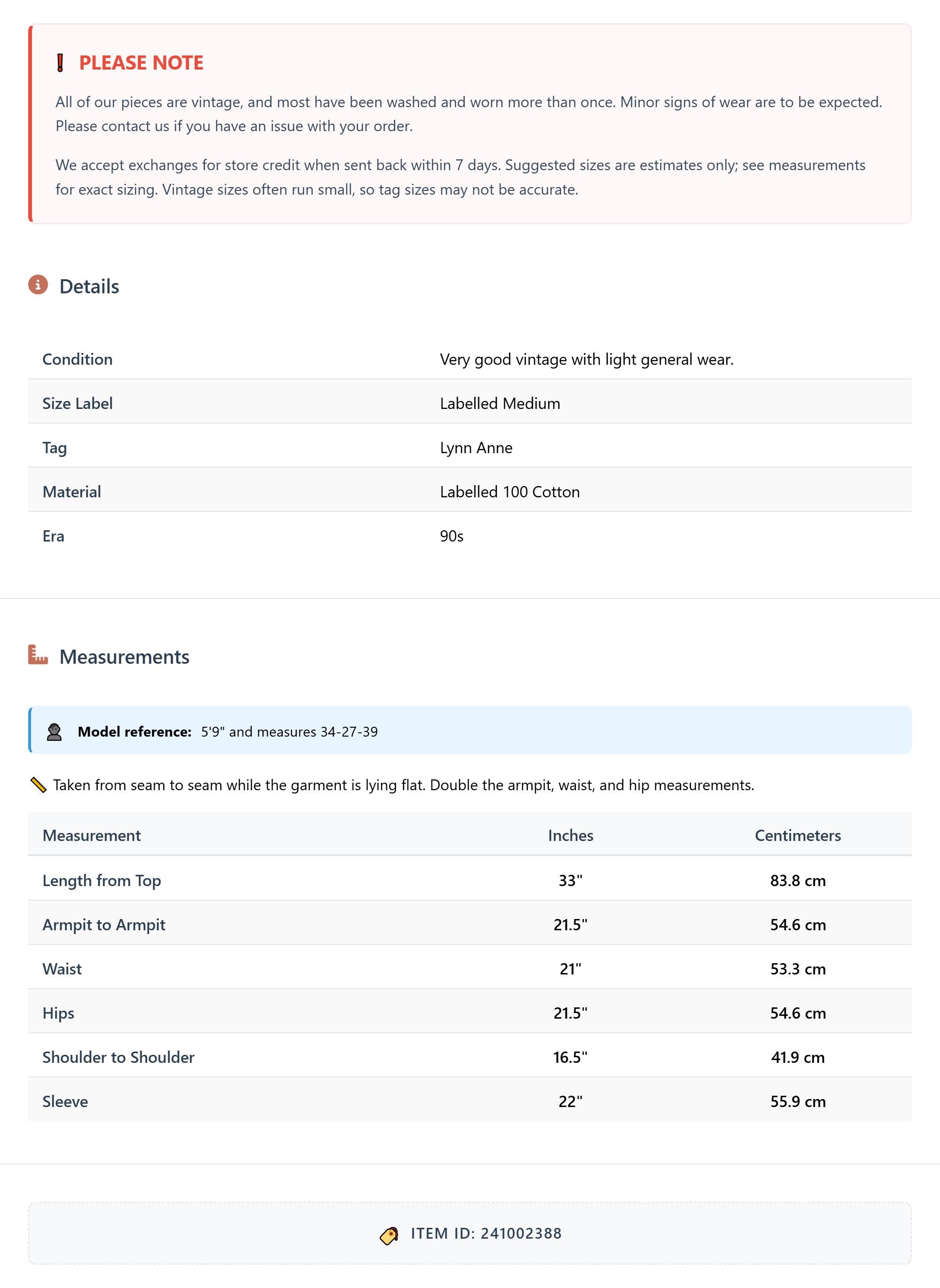 All of our pieces are vintage, and most have been washed and worn more than once. Minor signs of wear are to be expected. Please contact us if you have an issue with your order. We accept exchanges for store credit when sent back within 7 days.