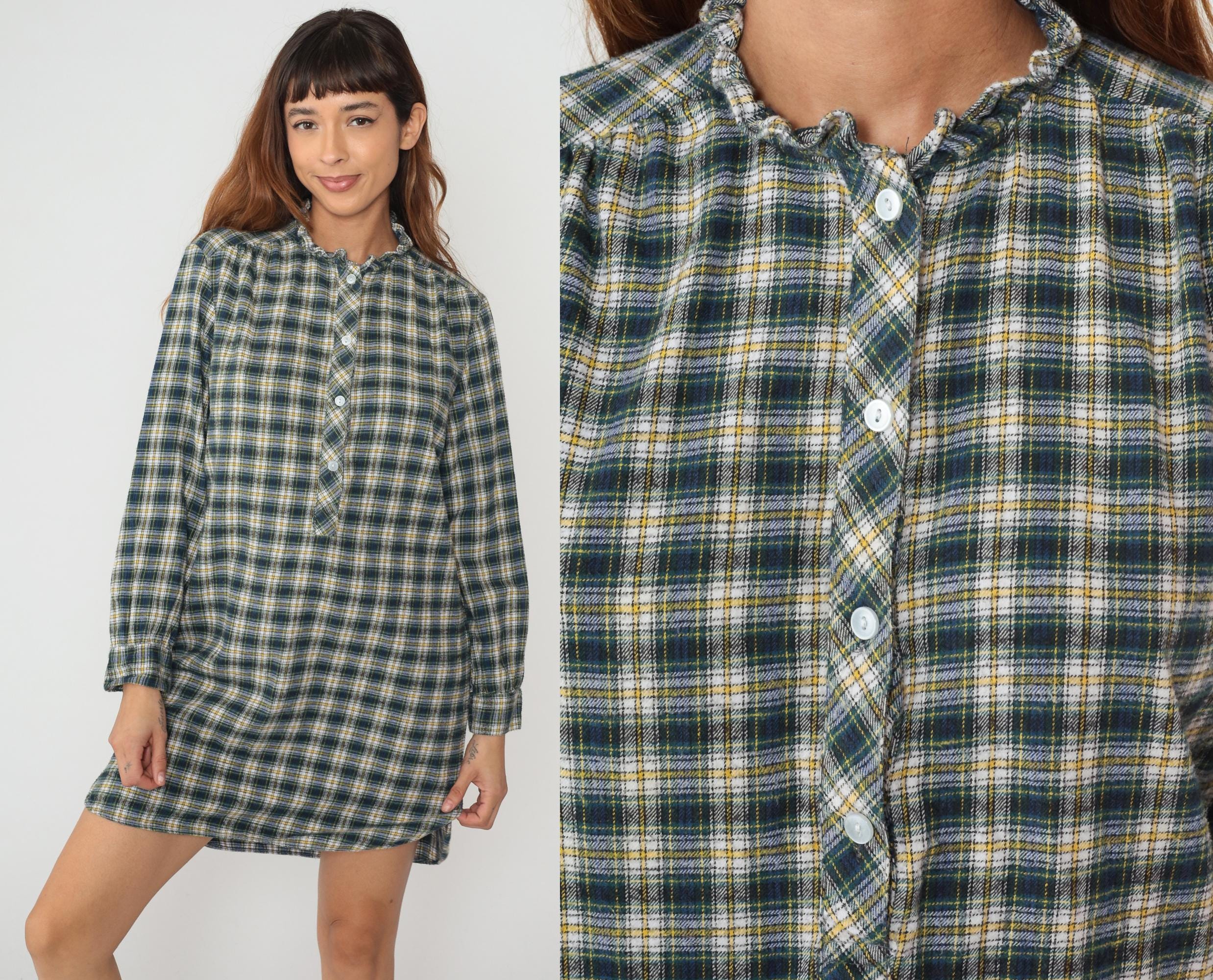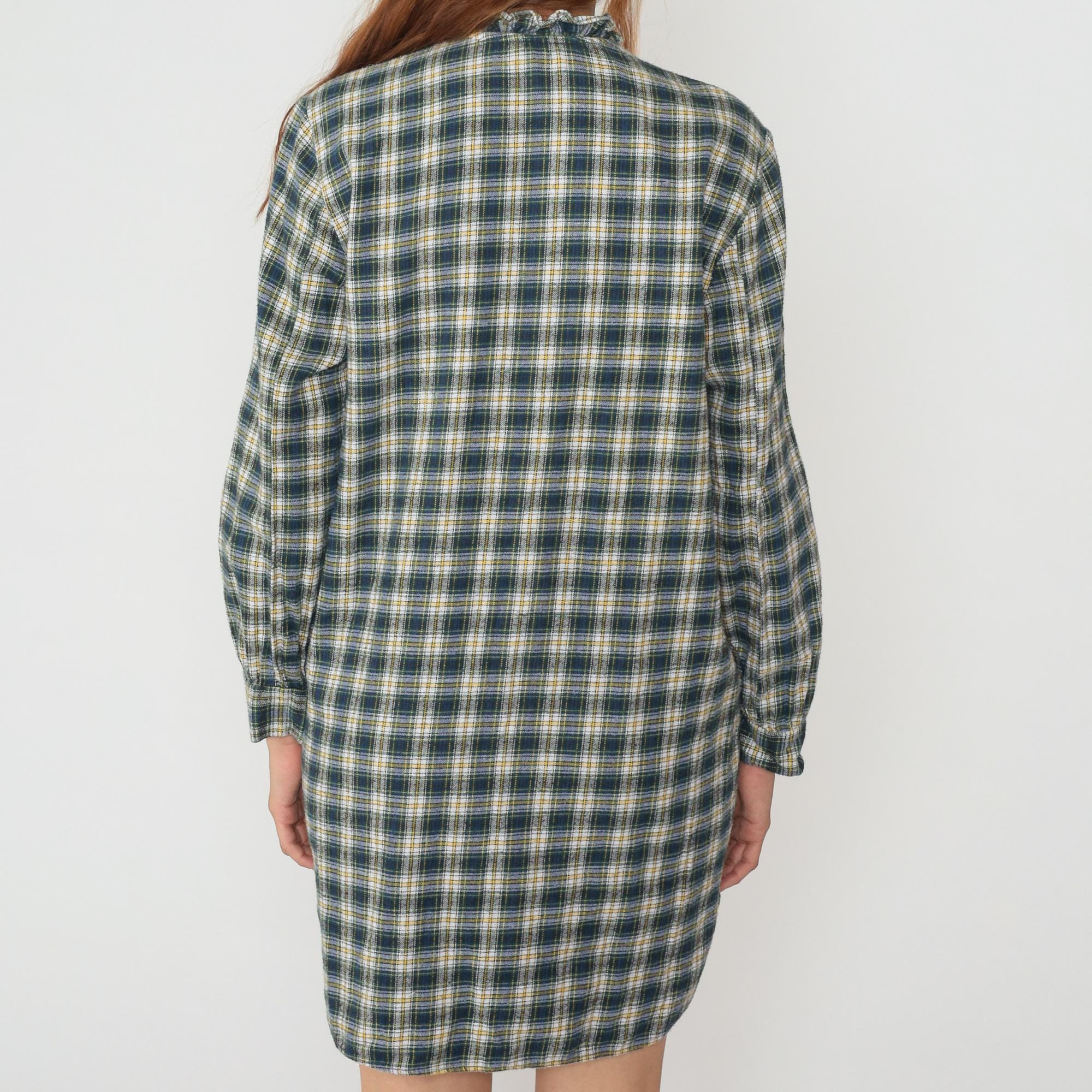 90s green plaid shirt dress from Lynn Anne with button front closure and ruffle trim collar. Long sleeves, straight silhouette, above-knee length. Green, yellow, white, and blue plaid pattern across the fabric.