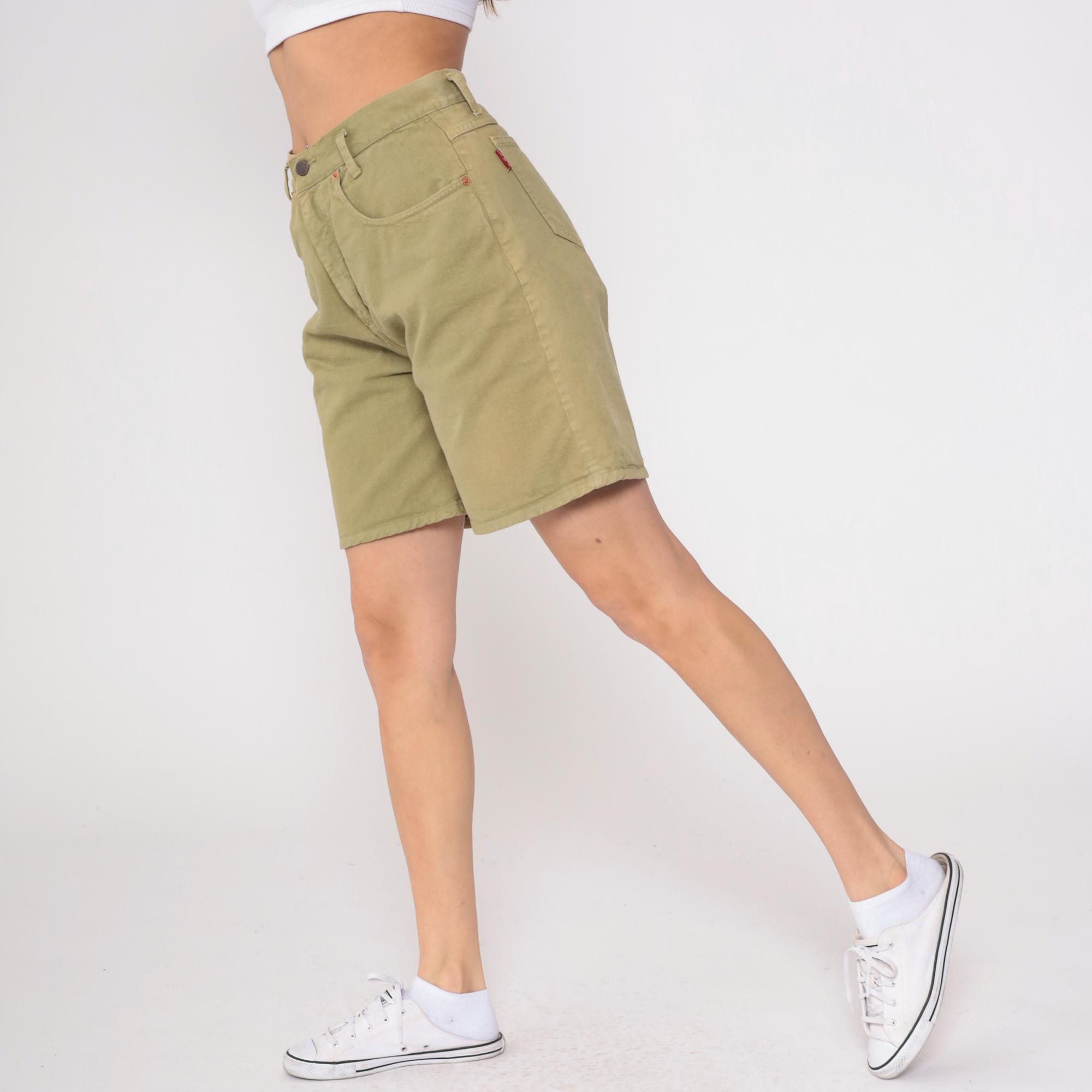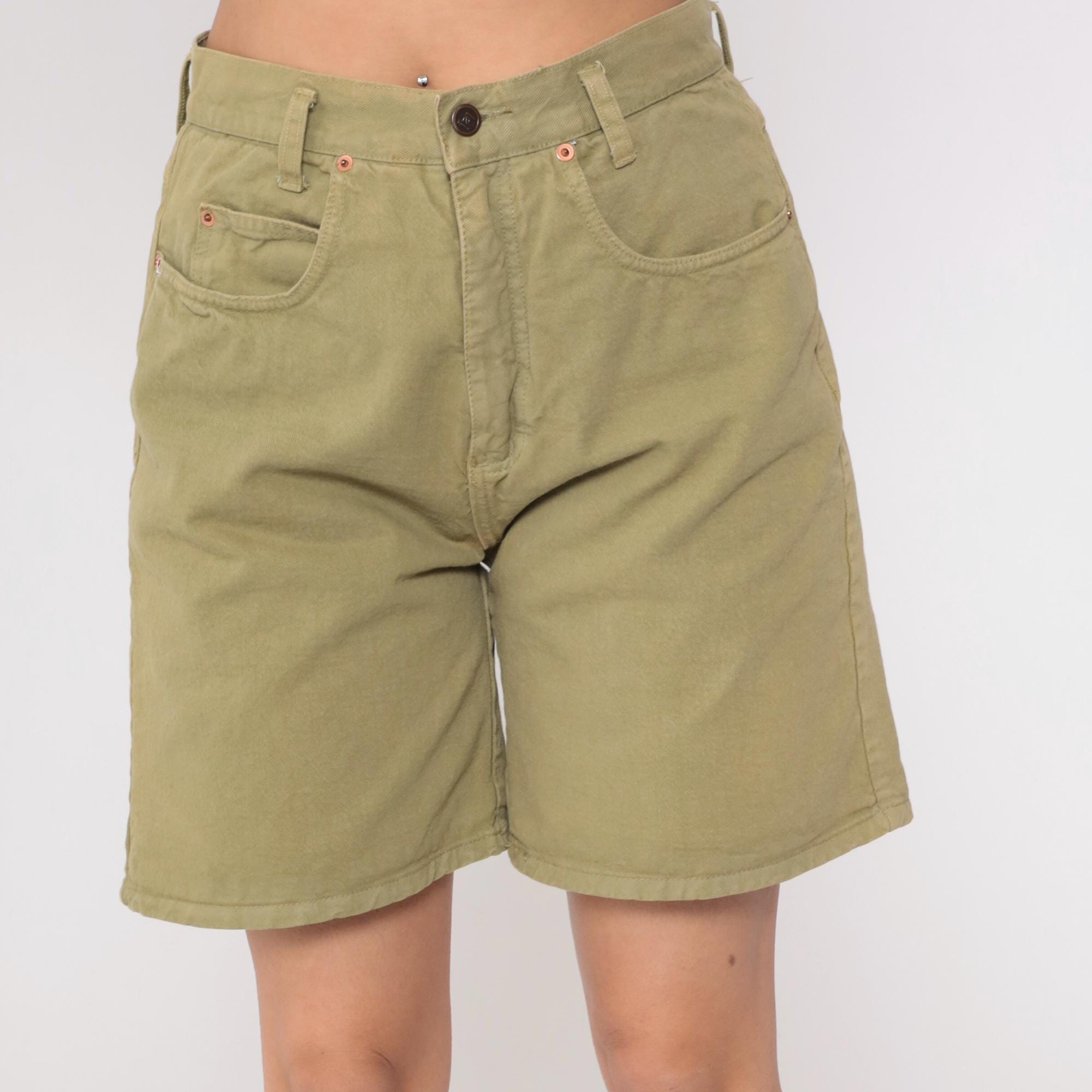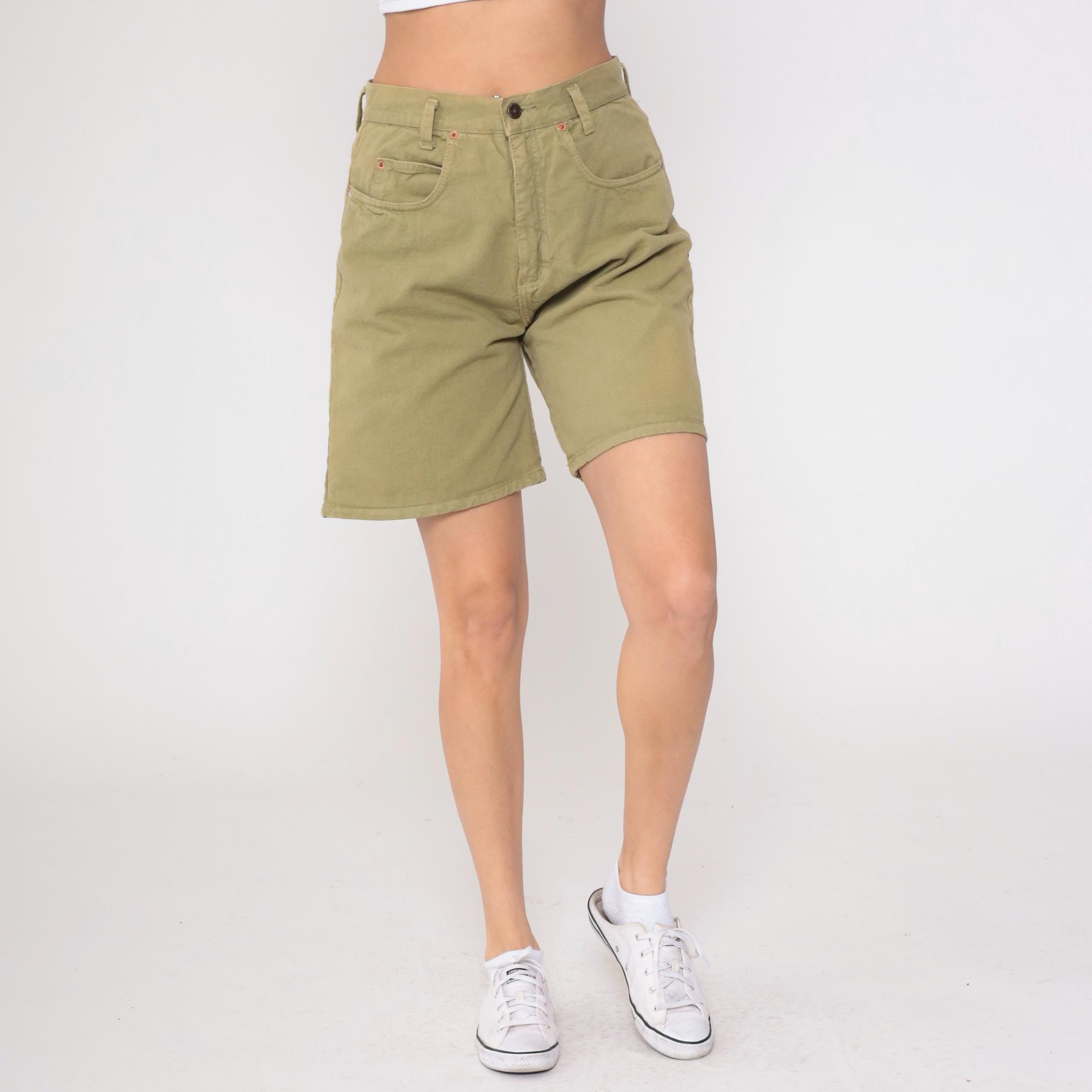 90s olive green shorts from Lei in a five-pocket style with button and zipper front closure, belt loops, and rolled cuffs. Relaxed fit through hips and thighs in a versatile khaki-green tone. 100% cotton.