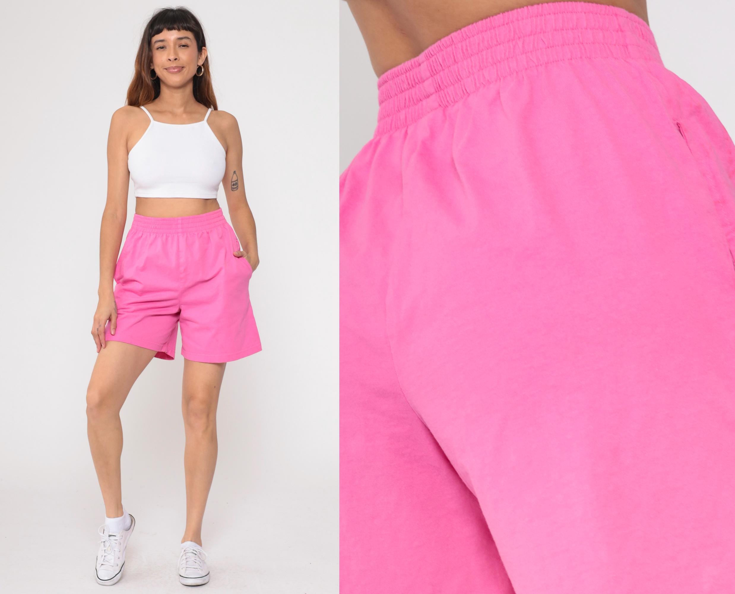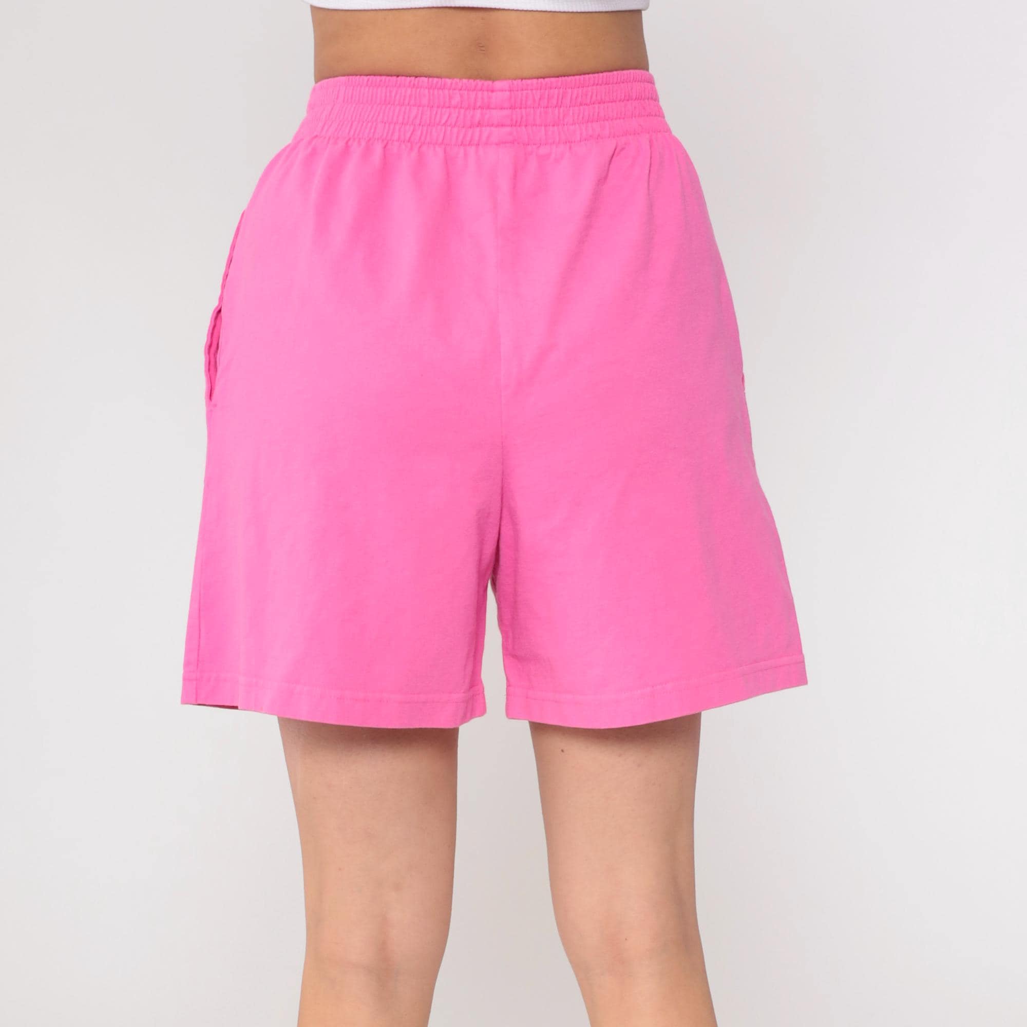 90s hot pink shorts from Done with elastic waistband and side seam pockets. Mid-thigh length with relaxed fit. Cotton. Tagged size Large but fits modern Medium.