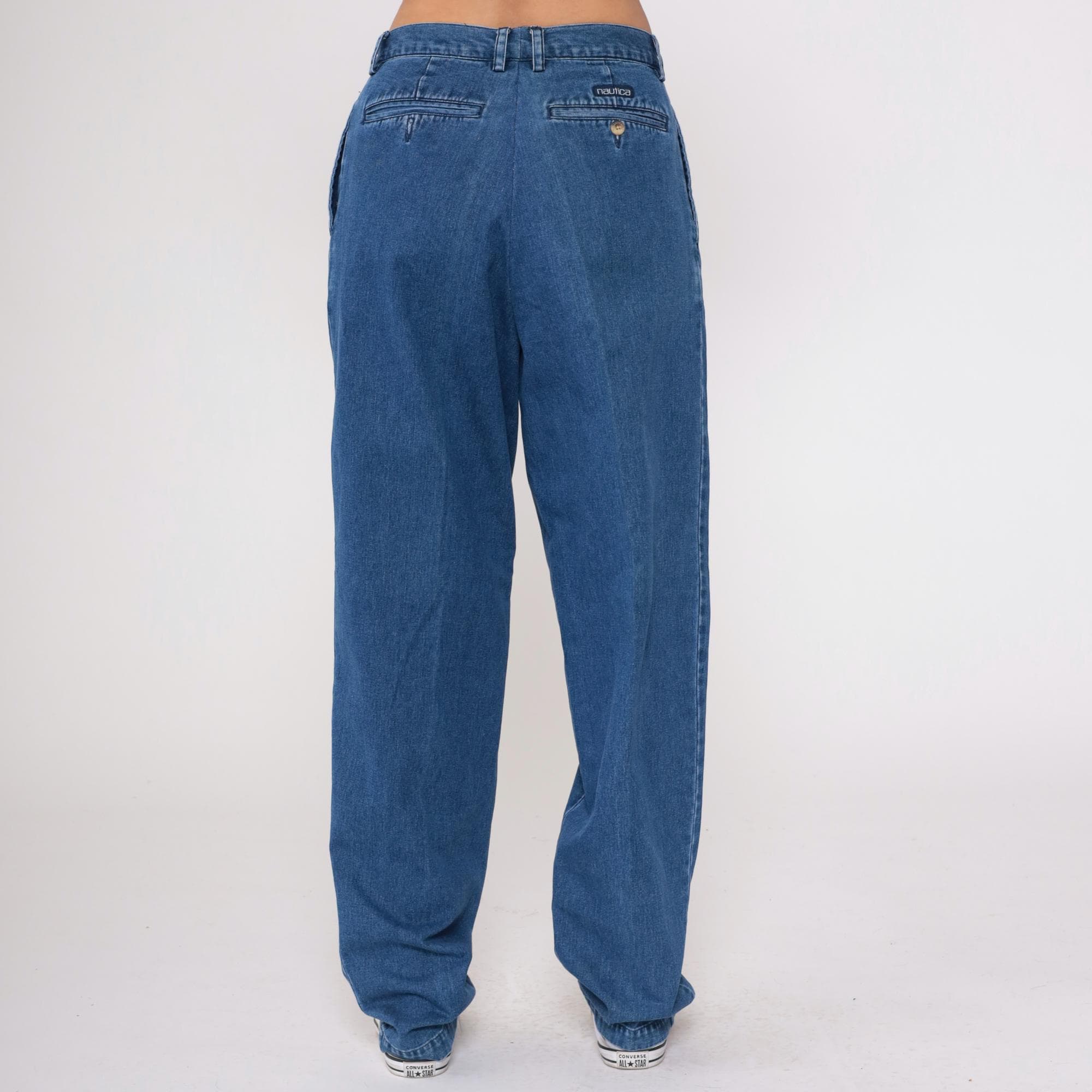 90s medium wash blue denim jeans from Nautica with pleated front and tapered leg with elastic cuffs. Back pockets with Nautica embroidered logo, front slant pockets, zip fly with button closure. Cotton. Tagged size 32W x 34L.