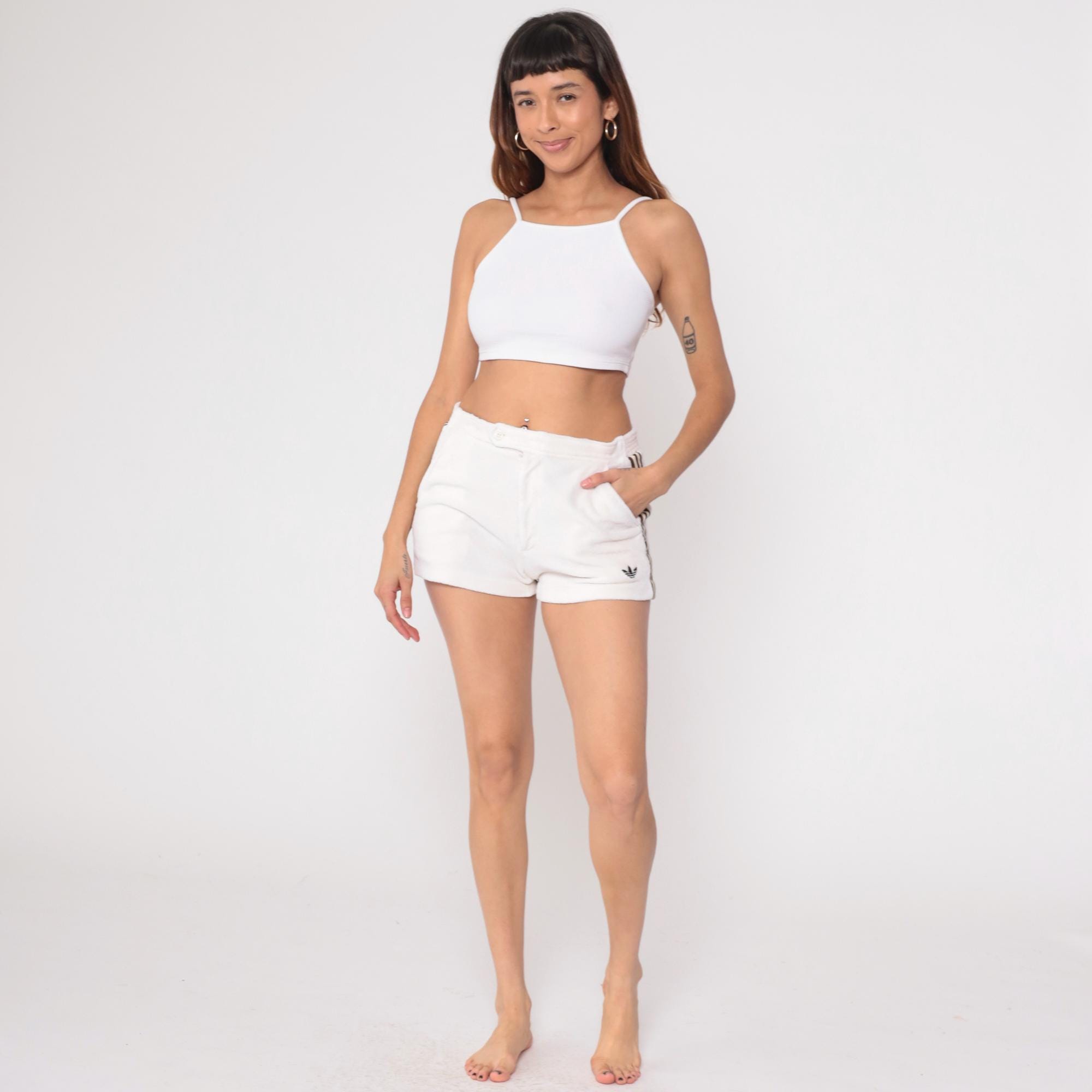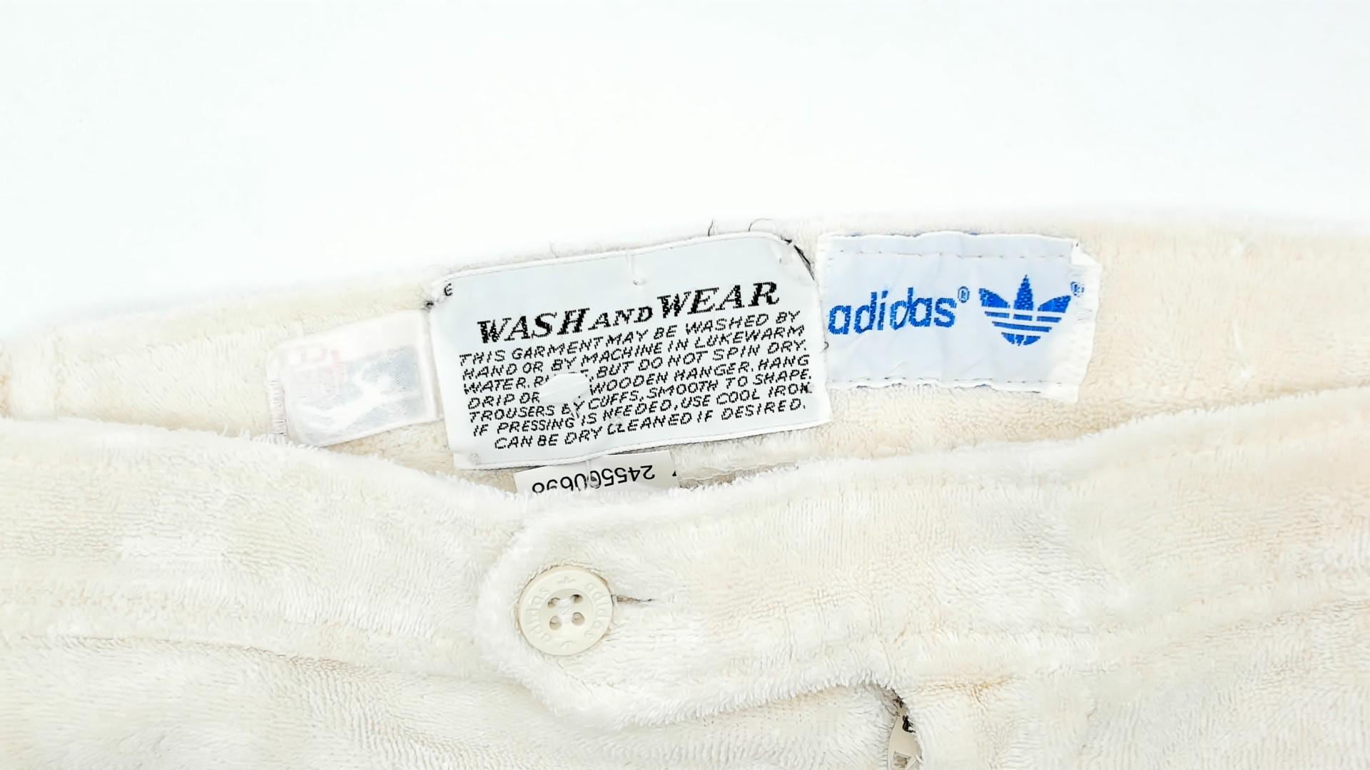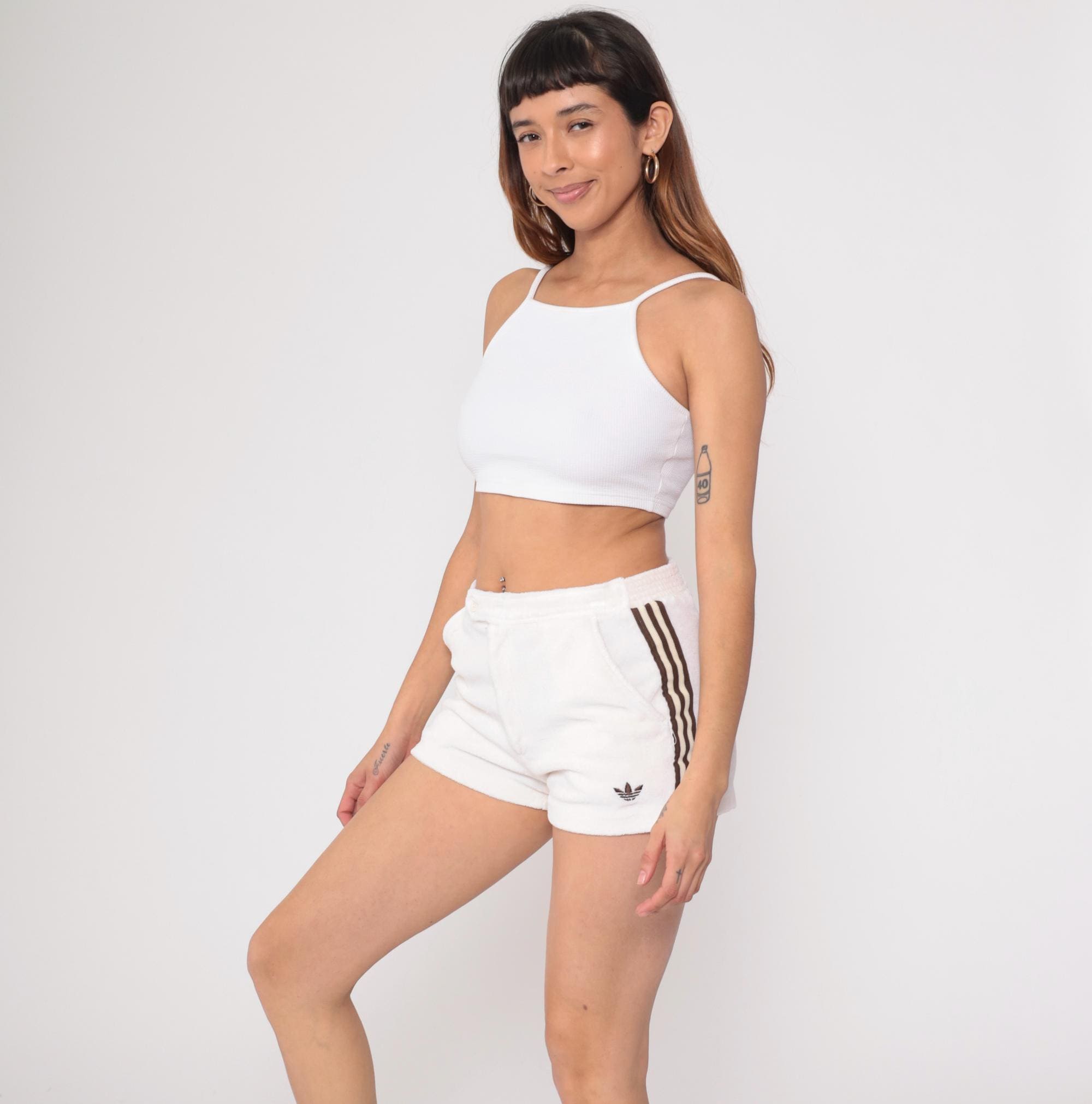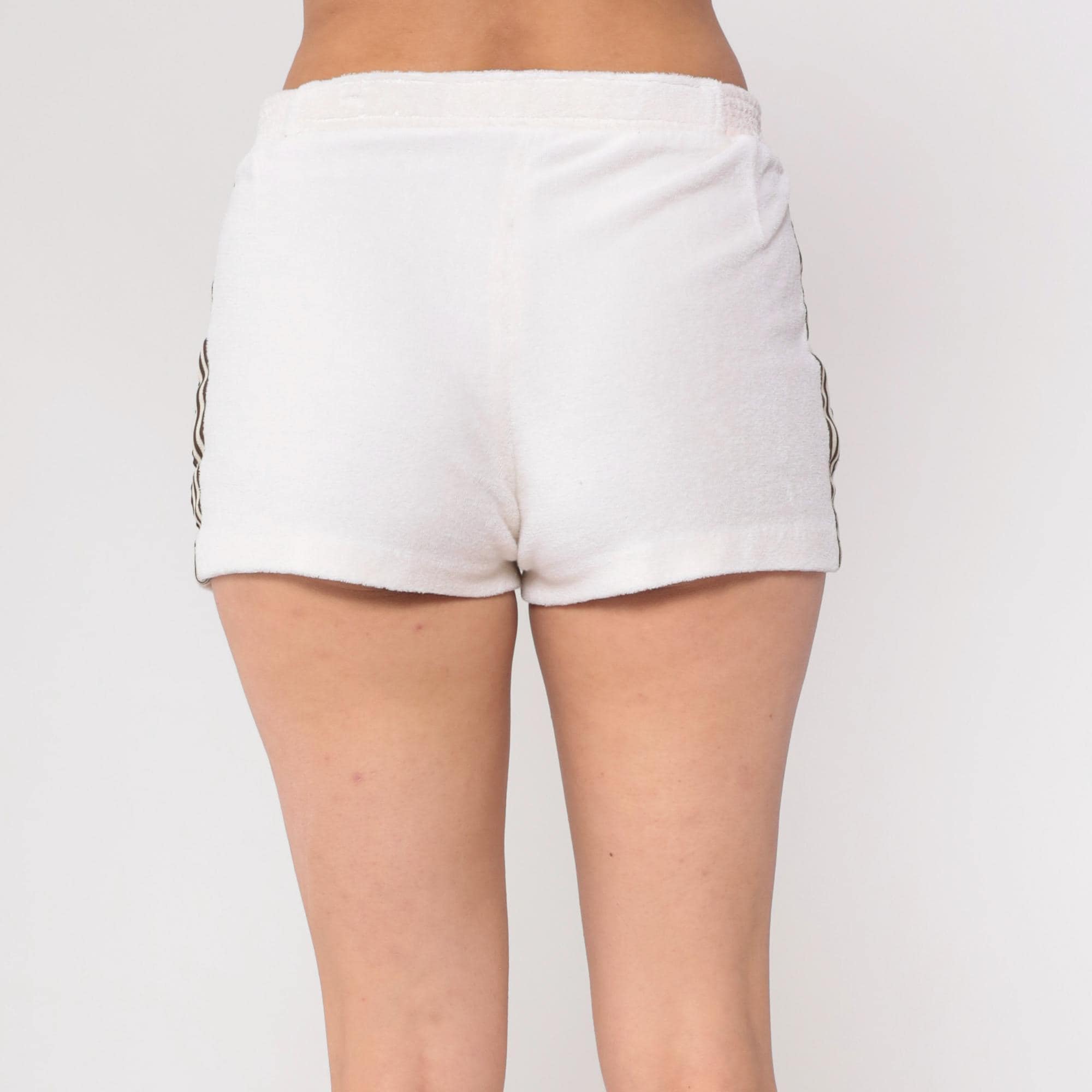 80s off white terry cloth shorts from Adidas with brown and cream striped detailing down the sides. Zip closure, side pockets, elastic waistband. Small embroidered Adidas trefoil logo on lower left leg. Tagged Adidas.