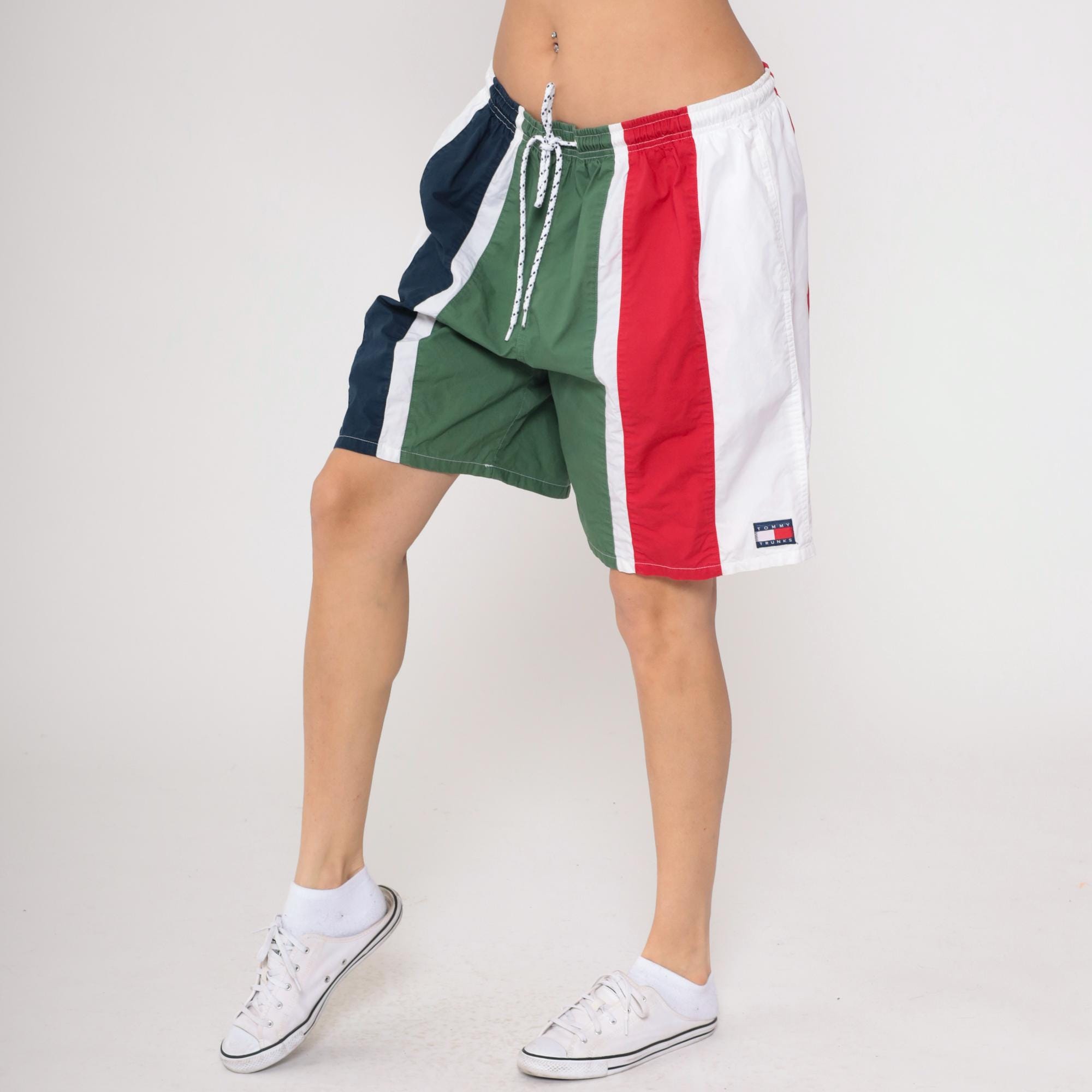 Y2K colorblock swim shorts from Tommy Hilfiger with vertical panels in navy, sage green, red, and white. Drawstring elastic waist with white waistband panel featuring "TOMMY" text in navy letters, brand flag logo patch on lower leg.