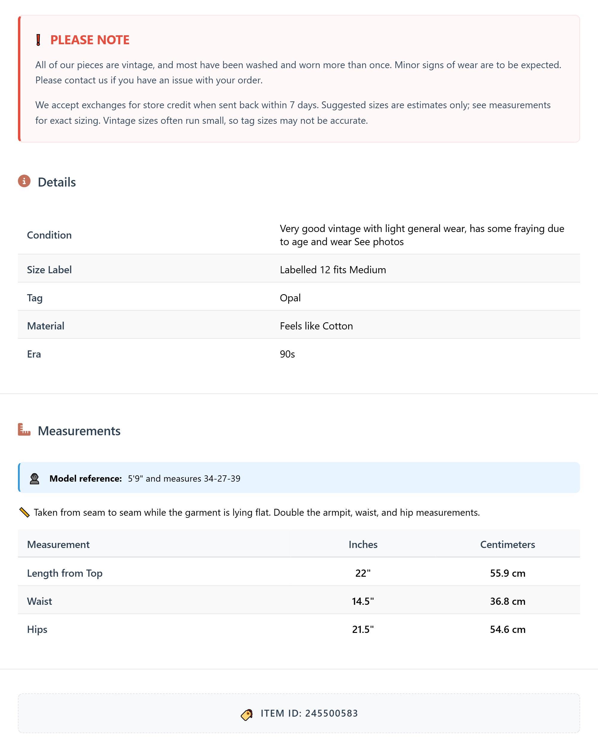 All of our pieces are vintage, and most have been washed and worn more than once. Minor signs of wear are to be expected. Please contact us if you have an issue with your order. We accept exchanges for store credit when sent back within 7 days.