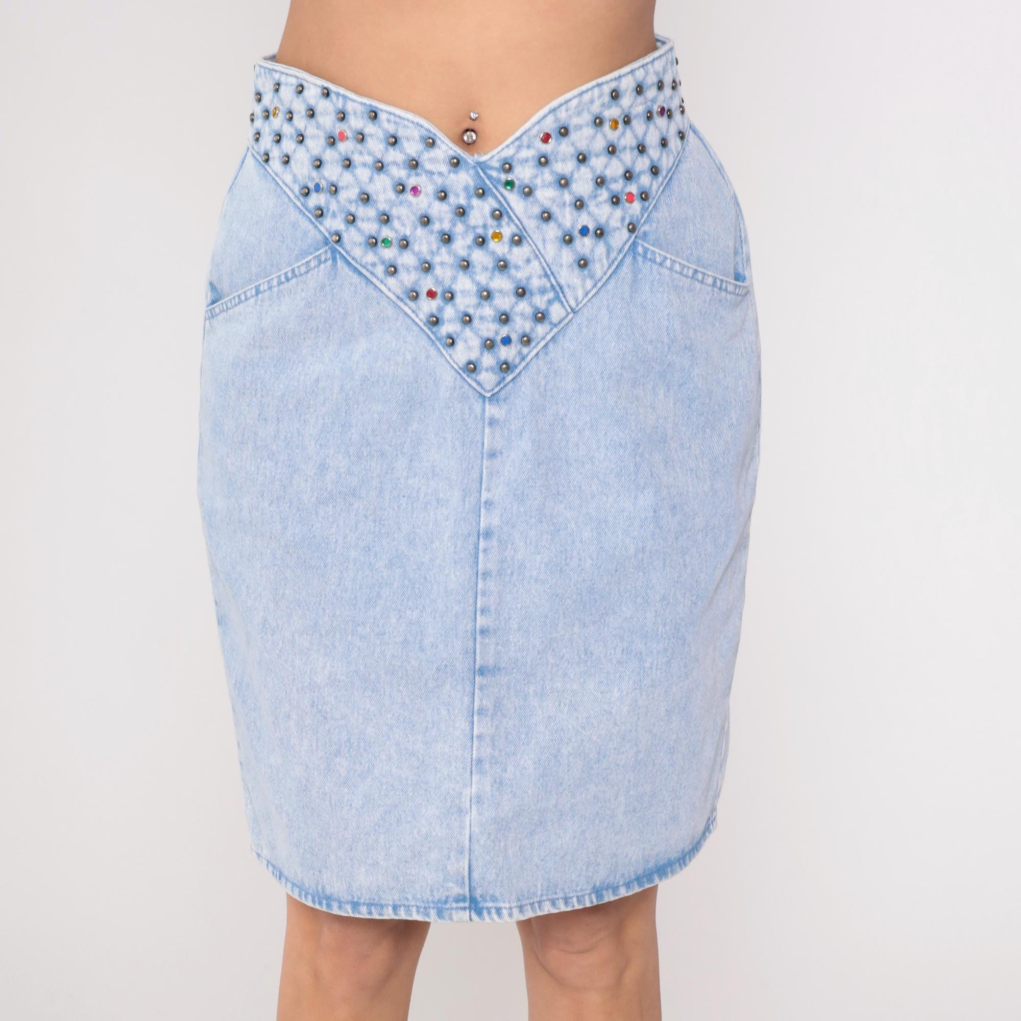 90s light blue acid wash denim skirt from Opal with studded waistband featuring colorful rhinestones in blue, pink, yellow, red, purple, and green. V-shaped yoke on front and back with matching studded detailing, button and zip closure.