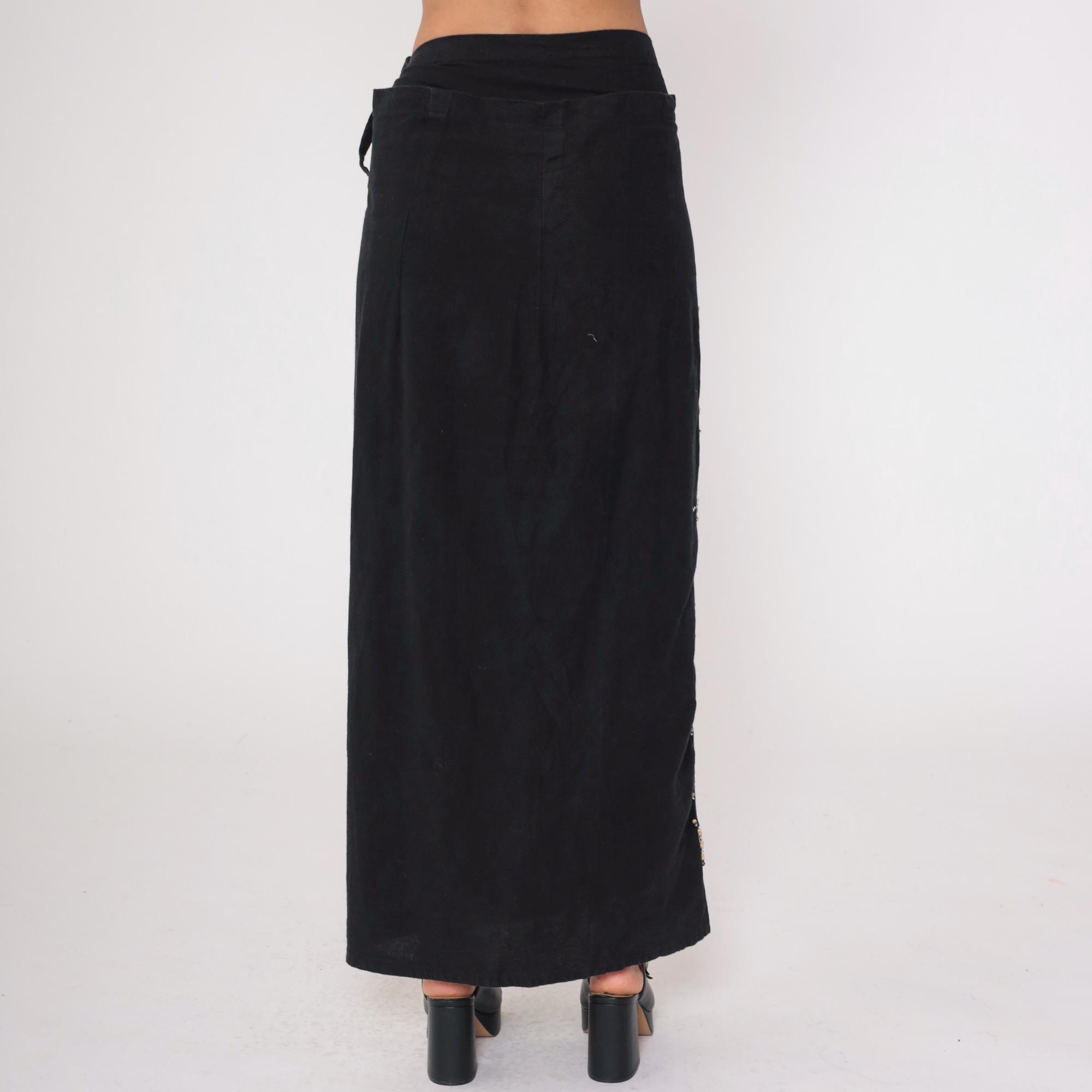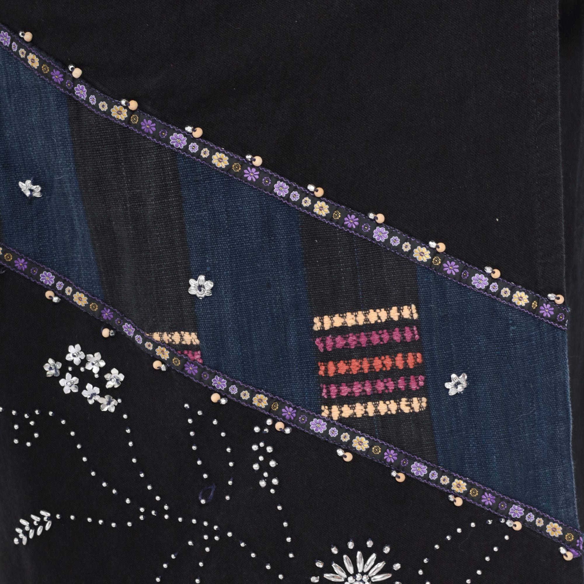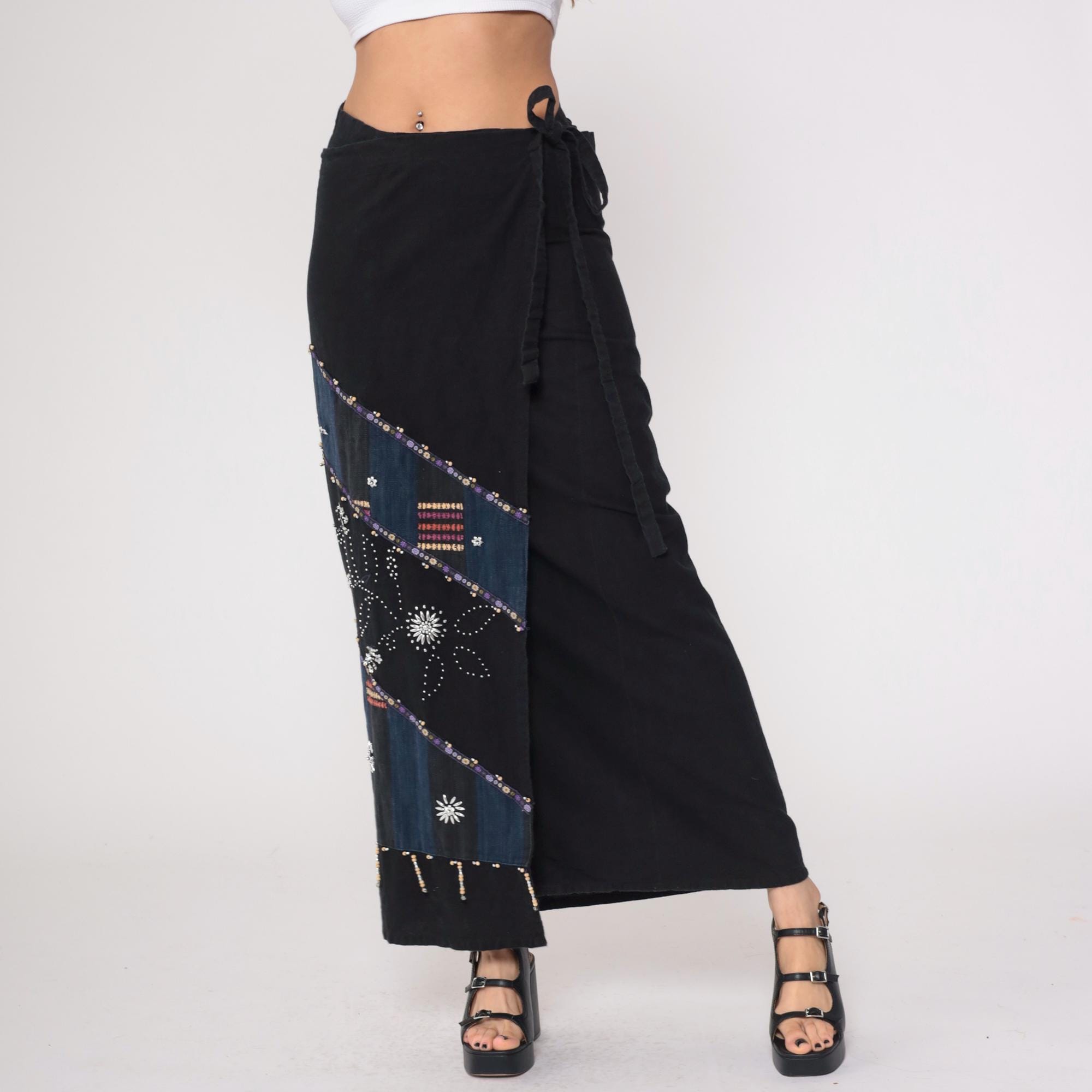 Y2K black wrap skirt from Suwatana with diagonal beaded panel in navy blue fabric. Purple and clear sequined stripes accent the panel with beaded floral motifs, geometric designs, and dangling beaded fringe at the hem.