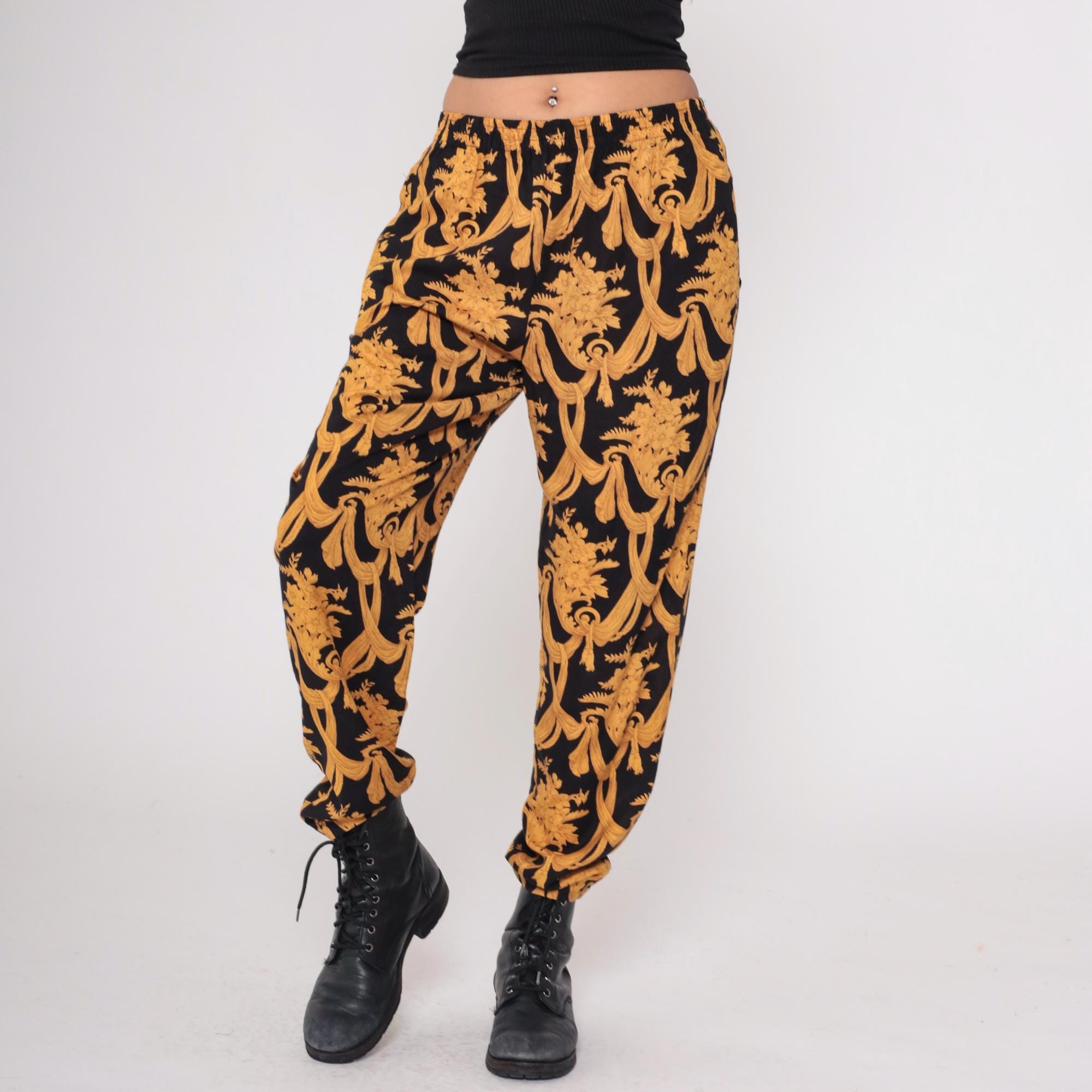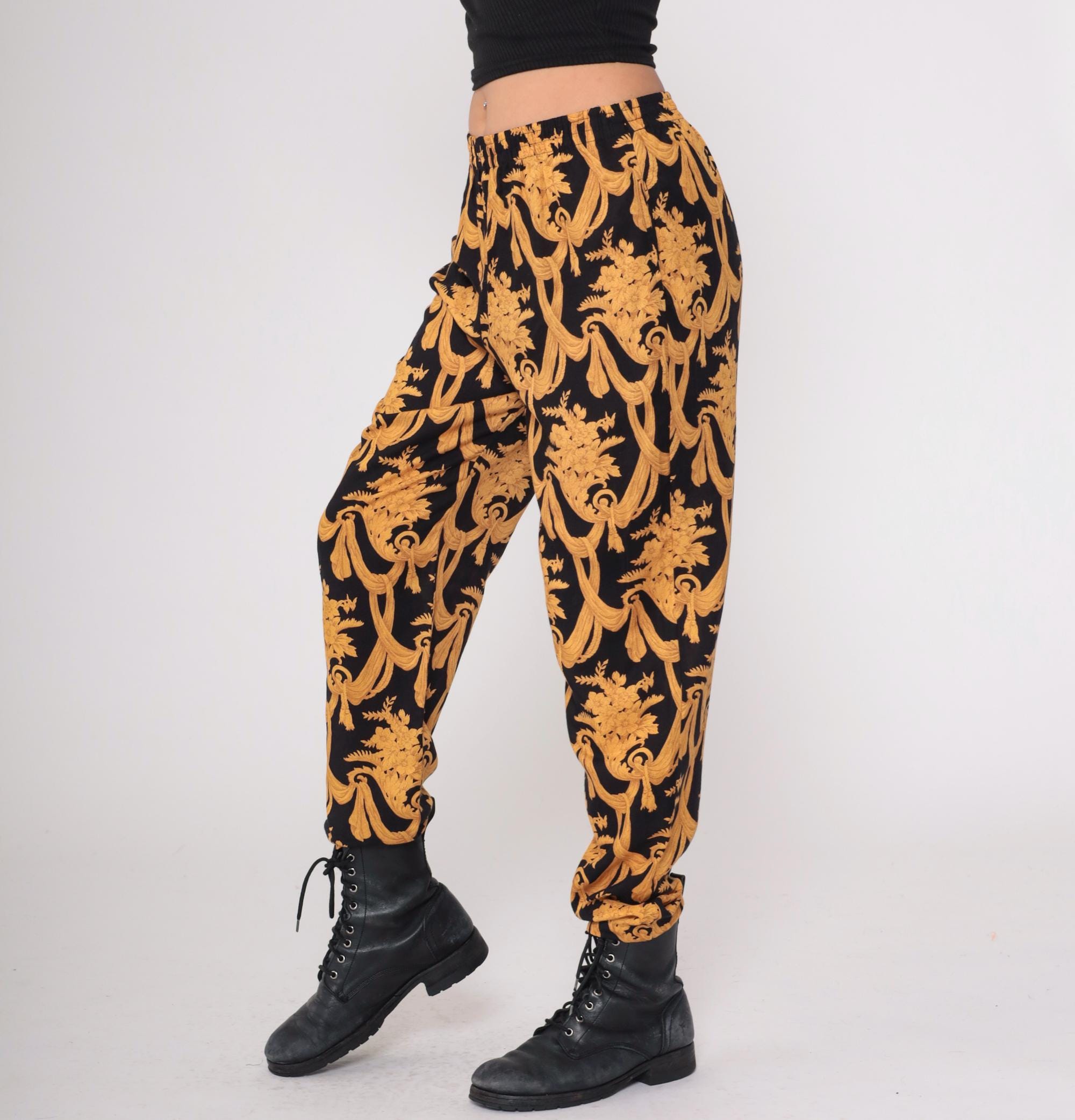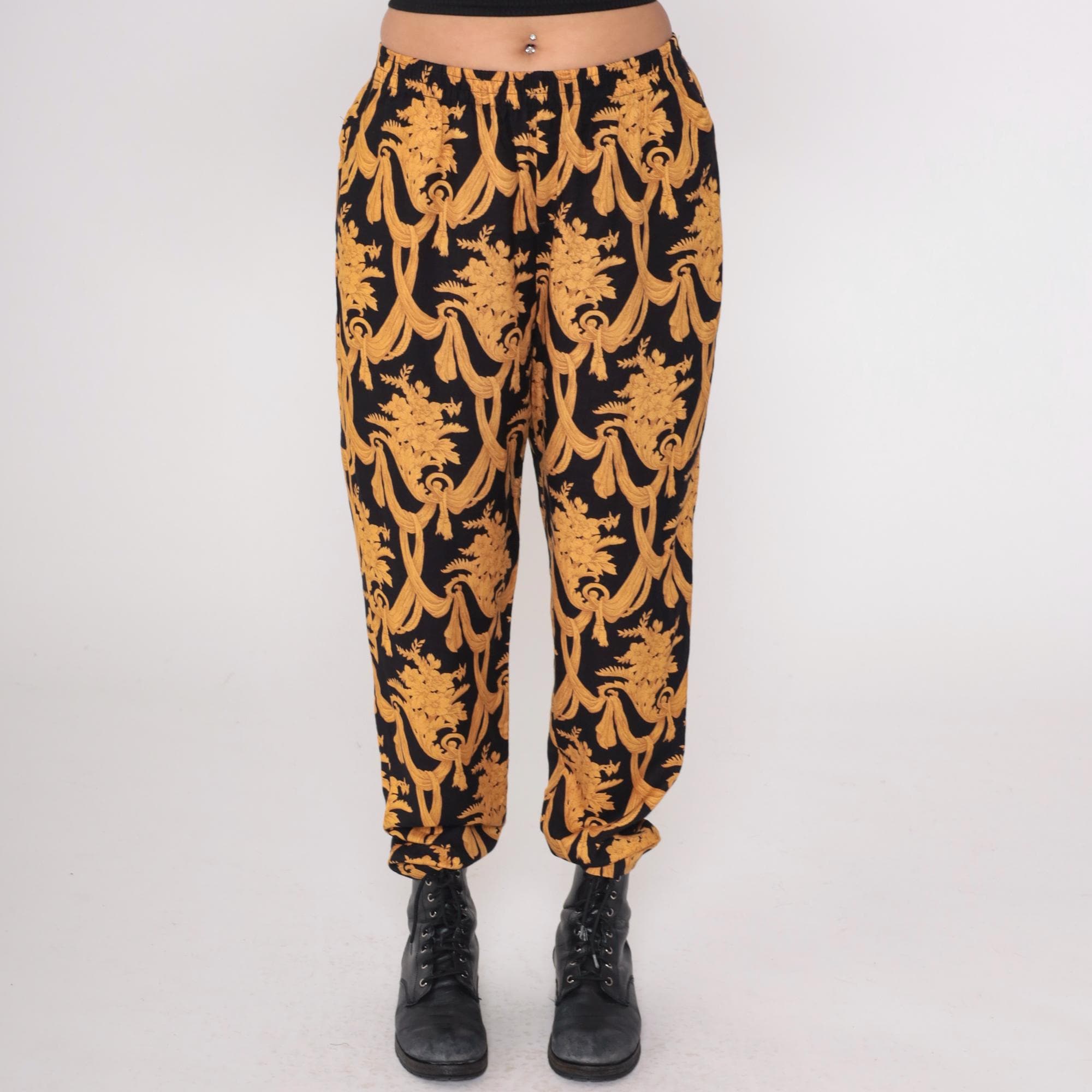 90s black pants with gold baroque damask print from Judy Knapp. Wide leg silhouette with elastic waistband and side pockets. Ornate scrollwork and floral motifs repeat across the fabric in shades of gold, tan, and brown.