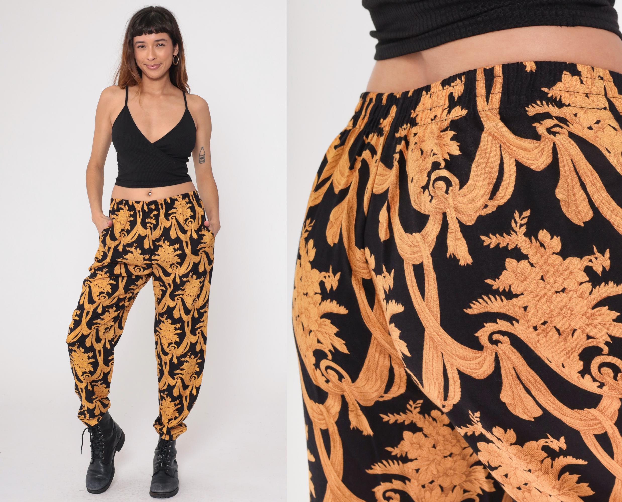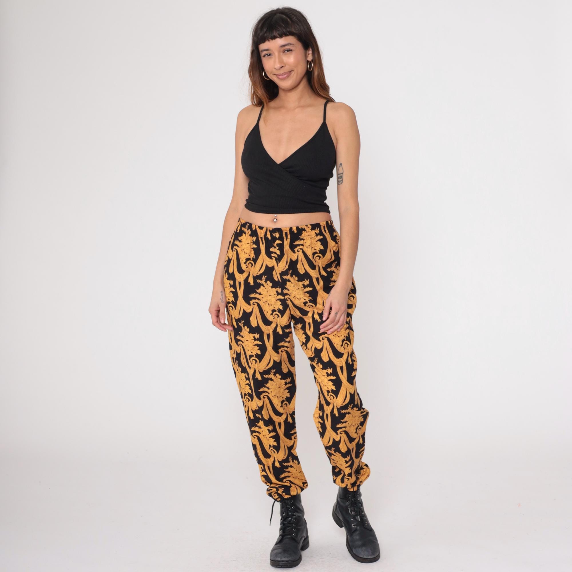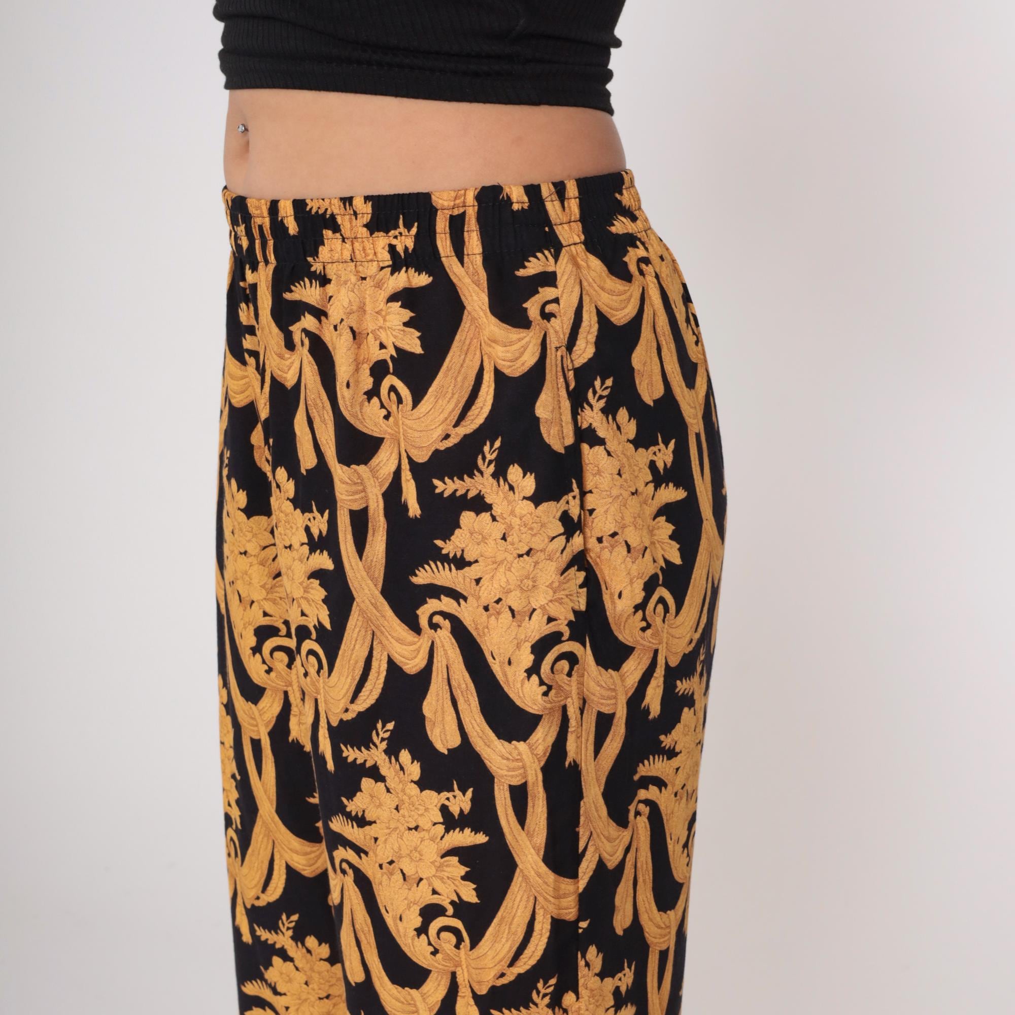90s black pants with gold baroque damask print from Judy Knapp. Wide leg silhouette with elastic waistband and side pockets. Ornate scrollwork and floral motifs repeat across the fabric in shades of gold, tan, and brown.