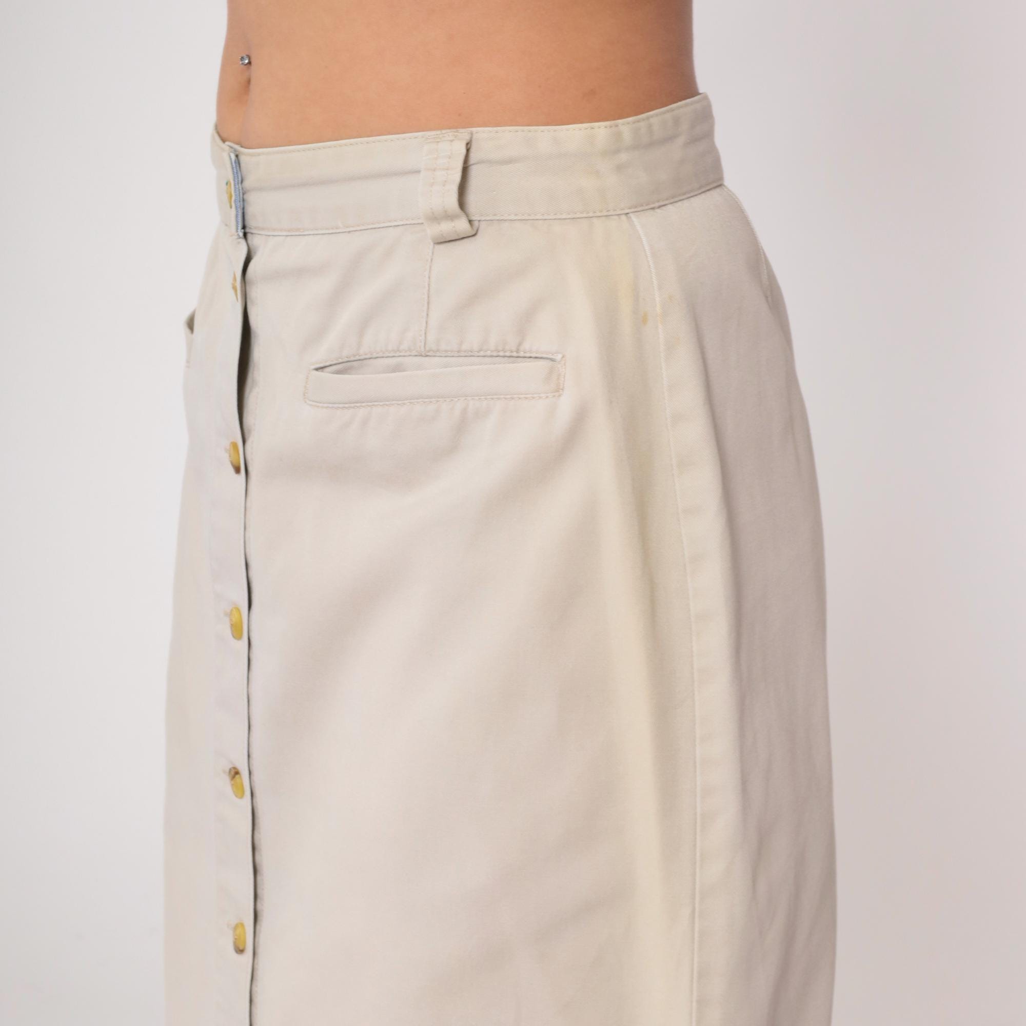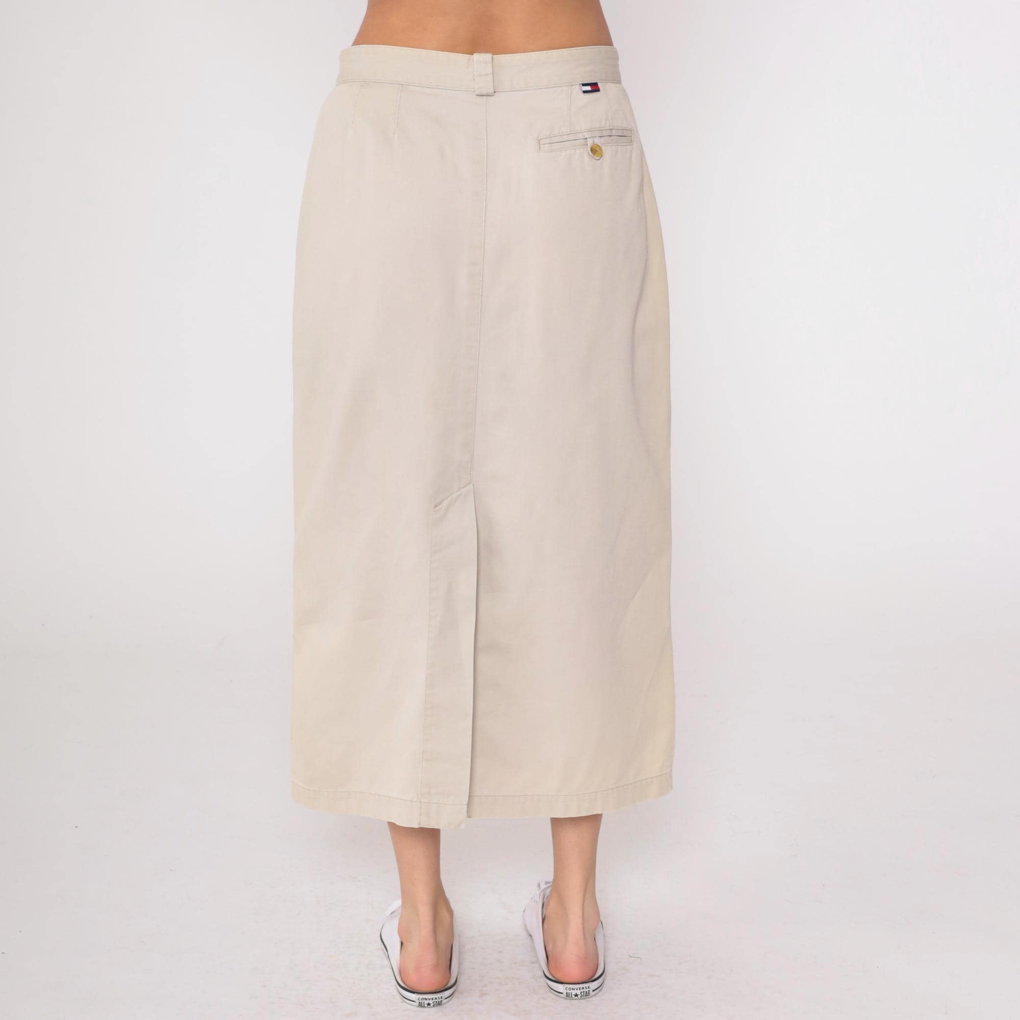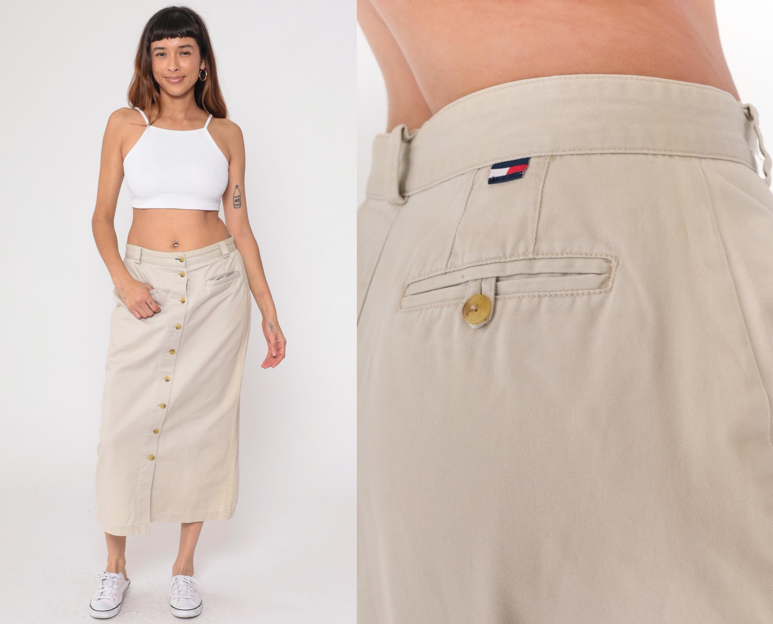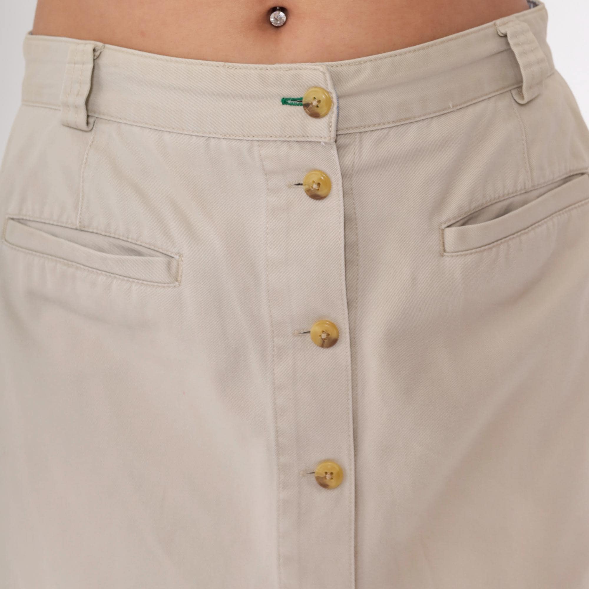 90s beige button-front skirt from Tommy Hilfiger with full center button closure and waist tabs. Back pockets with Tommy Hilfiger flag logo on pocket and waistband, front pockets, straight silhouette.
