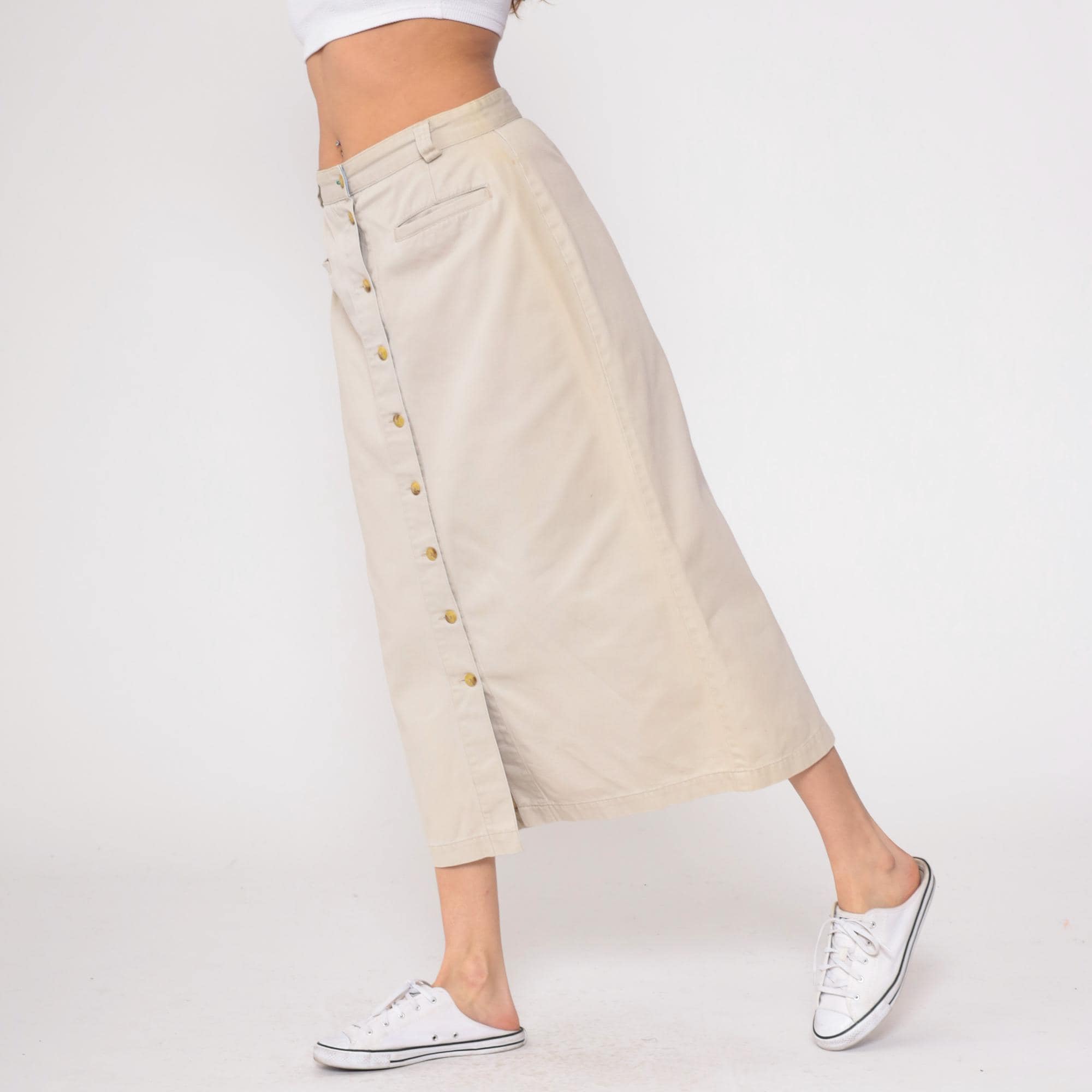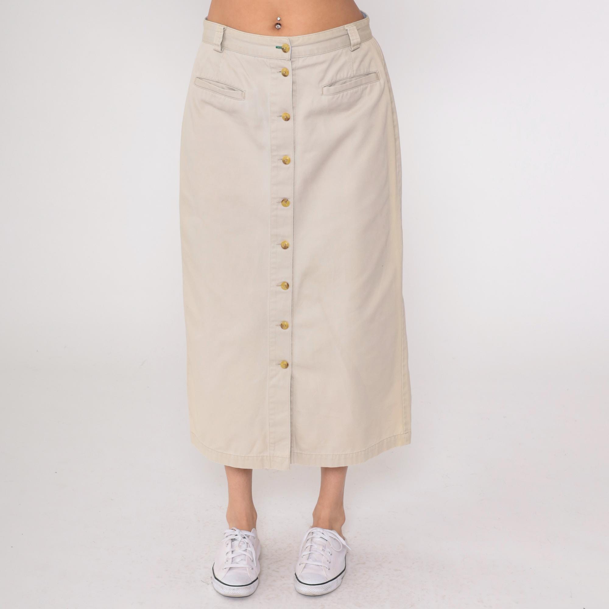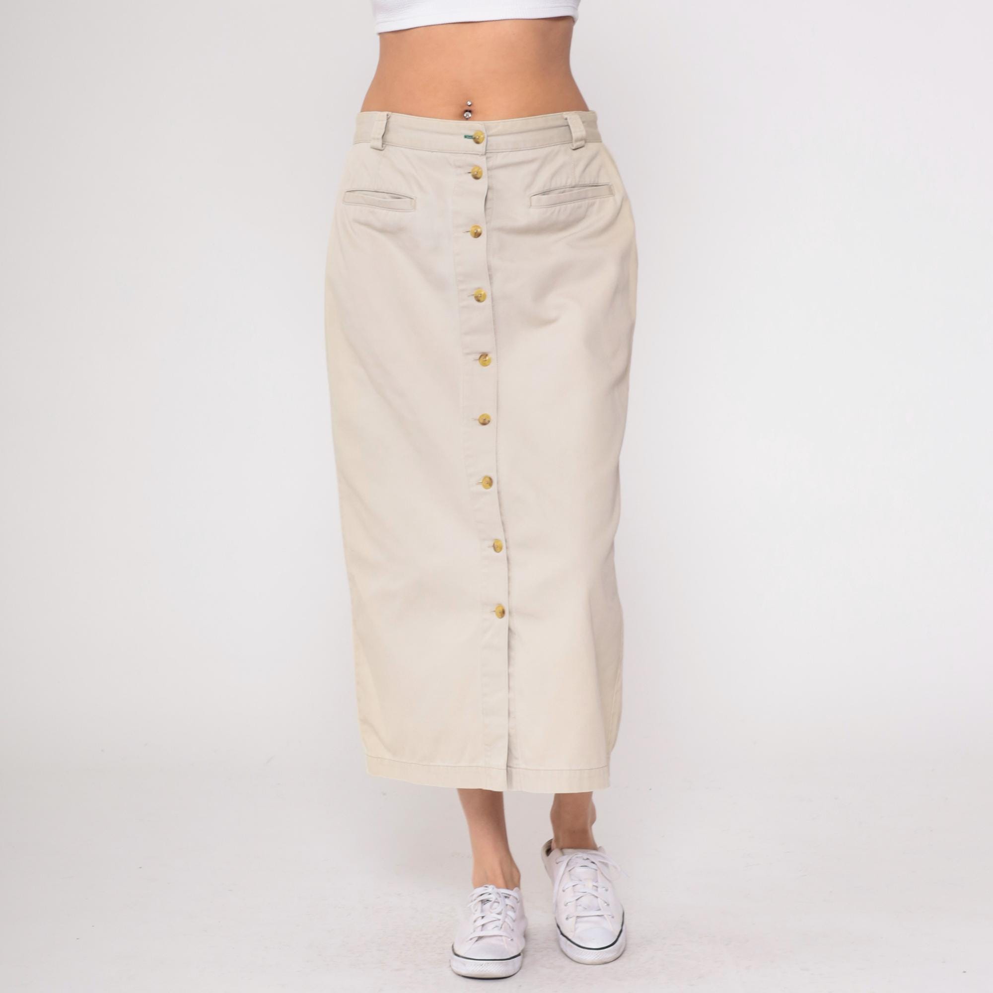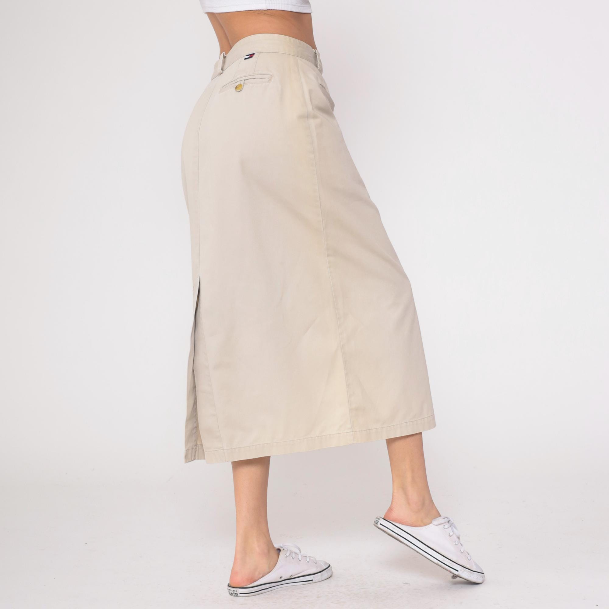 90s beige button-front skirt from Tommy Hilfiger with full center button closure and waist tabs. Back pockets with Tommy Hilfiger flag logo on pocket and waistband, front pockets, straight silhouette.