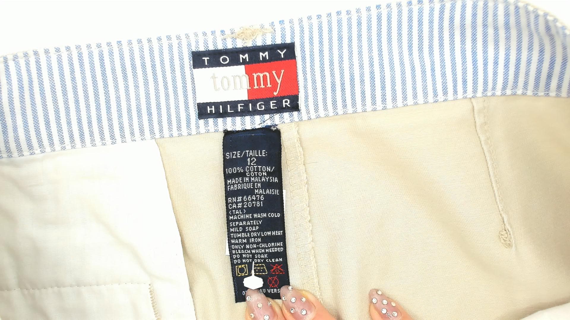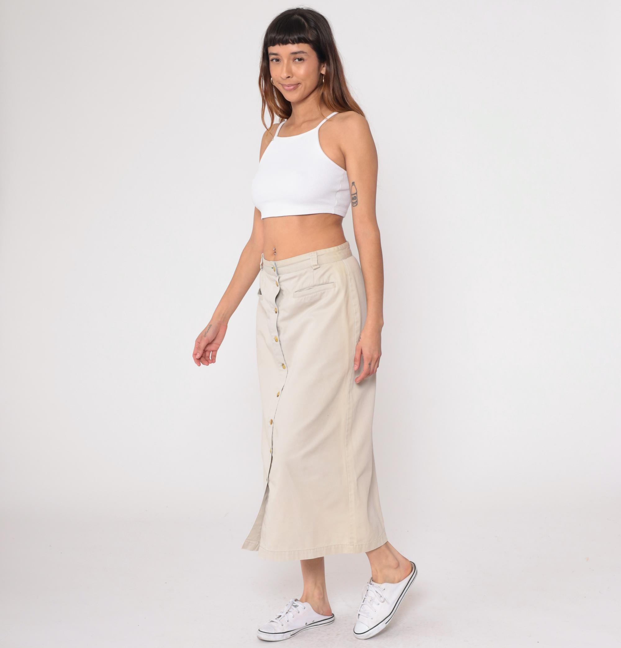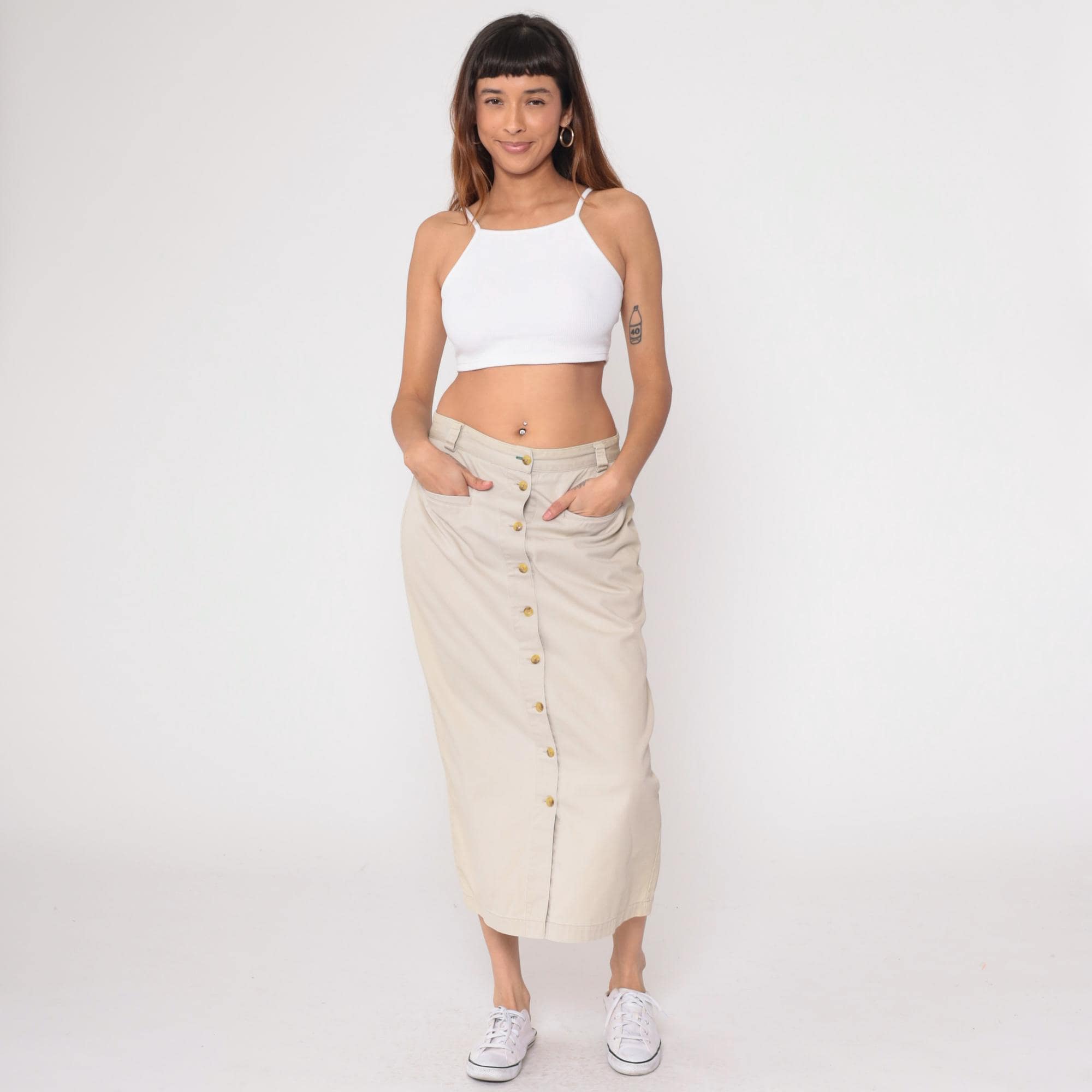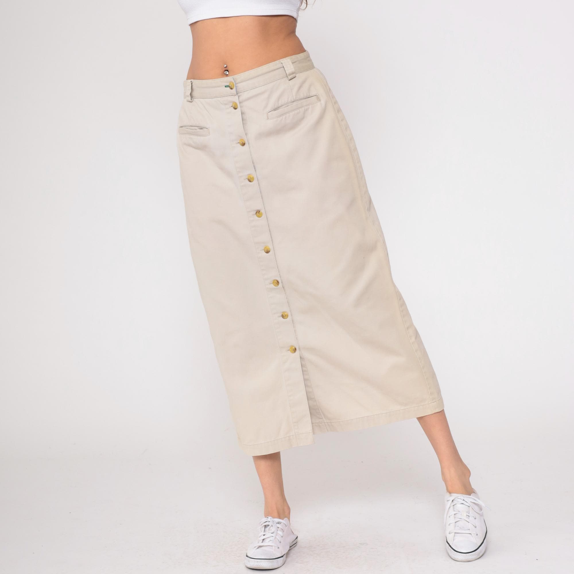 90s beige button-front skirt from Tommy Hilfiger with full center button closure and waist tabs. Back pockets with Tommy Hilfiger flag logo on pocket and waistband, front pockets, straight silhouette.