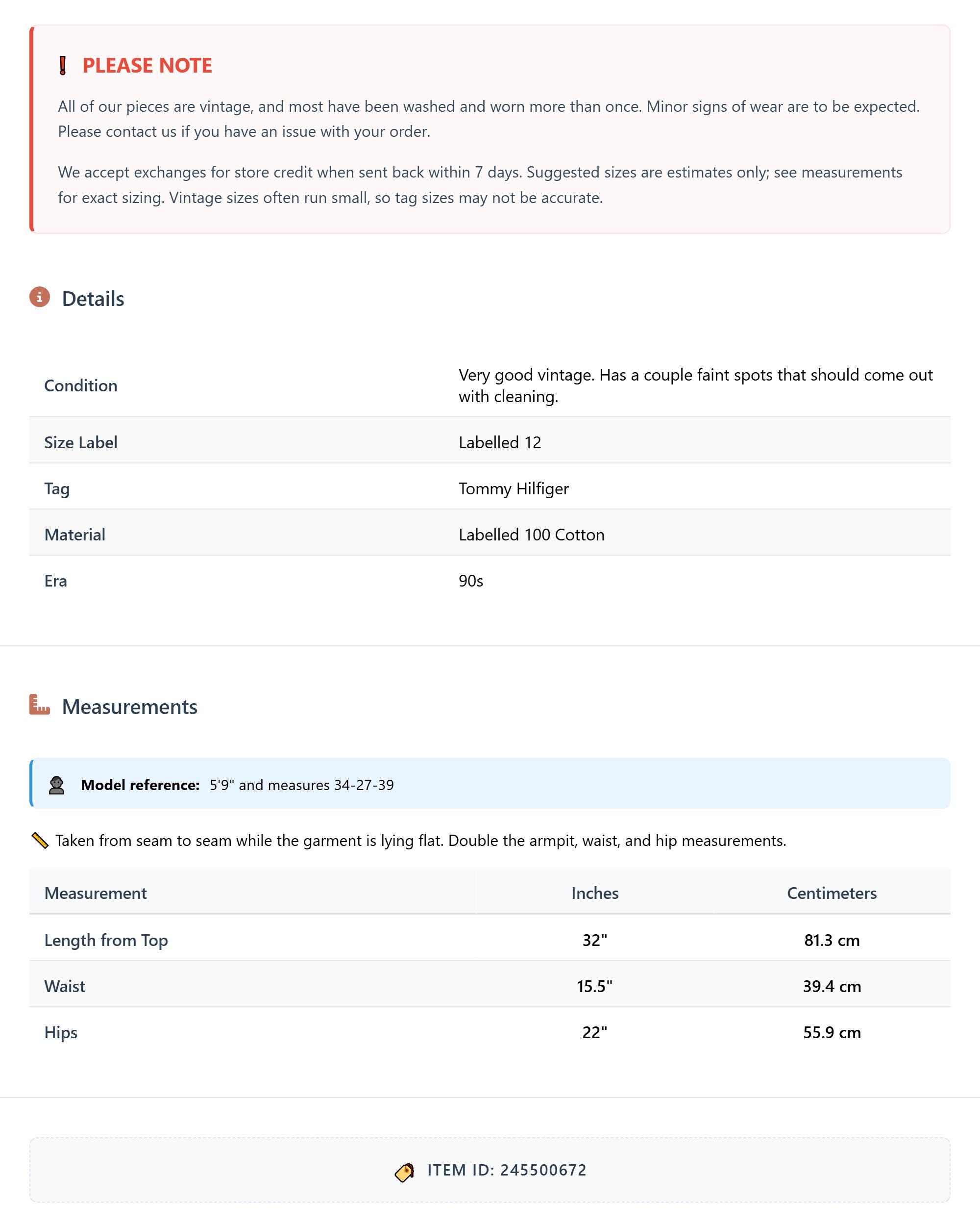 Vintage denim was usually made without any stretch, unlike modern jeans. Check the measurements to ensure proper fit, and remember to give yourself a little wiggle room in the waist and hips, depending on your preferred fit.